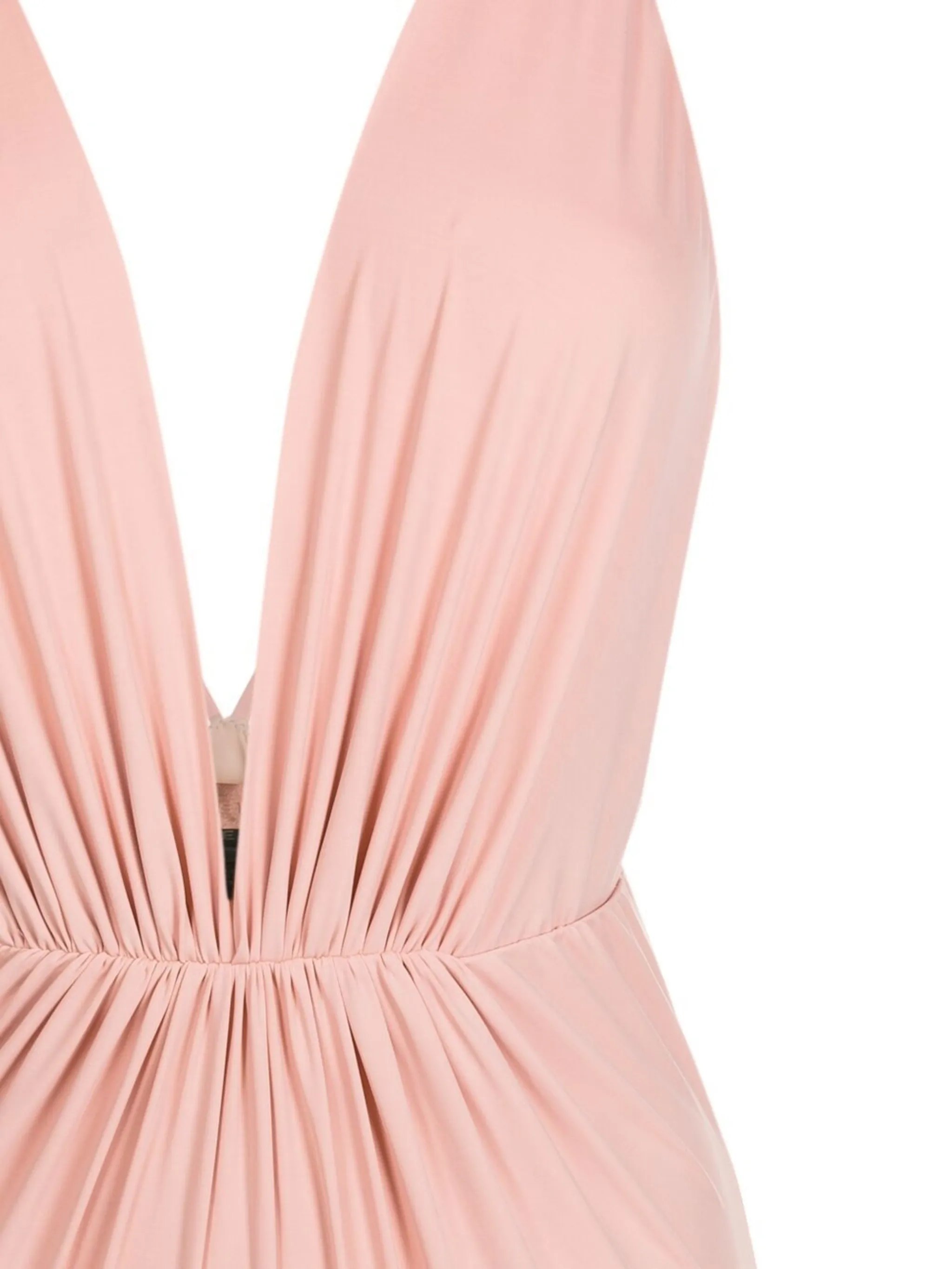 Дизайн со сборками, глубокий V-образный вырез и тонкие бретели.