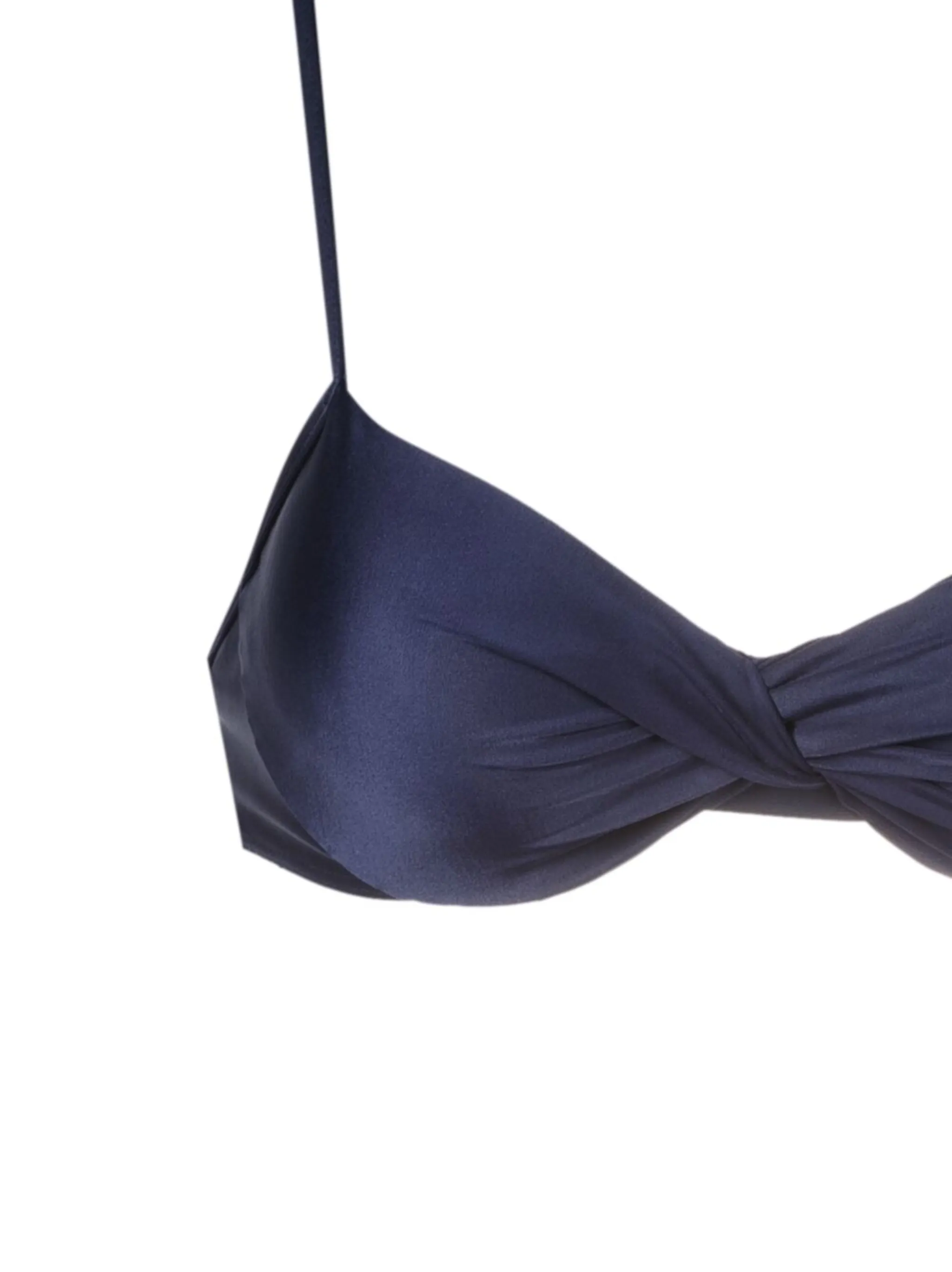 Перекрученная деталь, застежка на крючок сзади, тонкие бретели, средняя посадка, эластичный пояс и классические плавки бикини.
