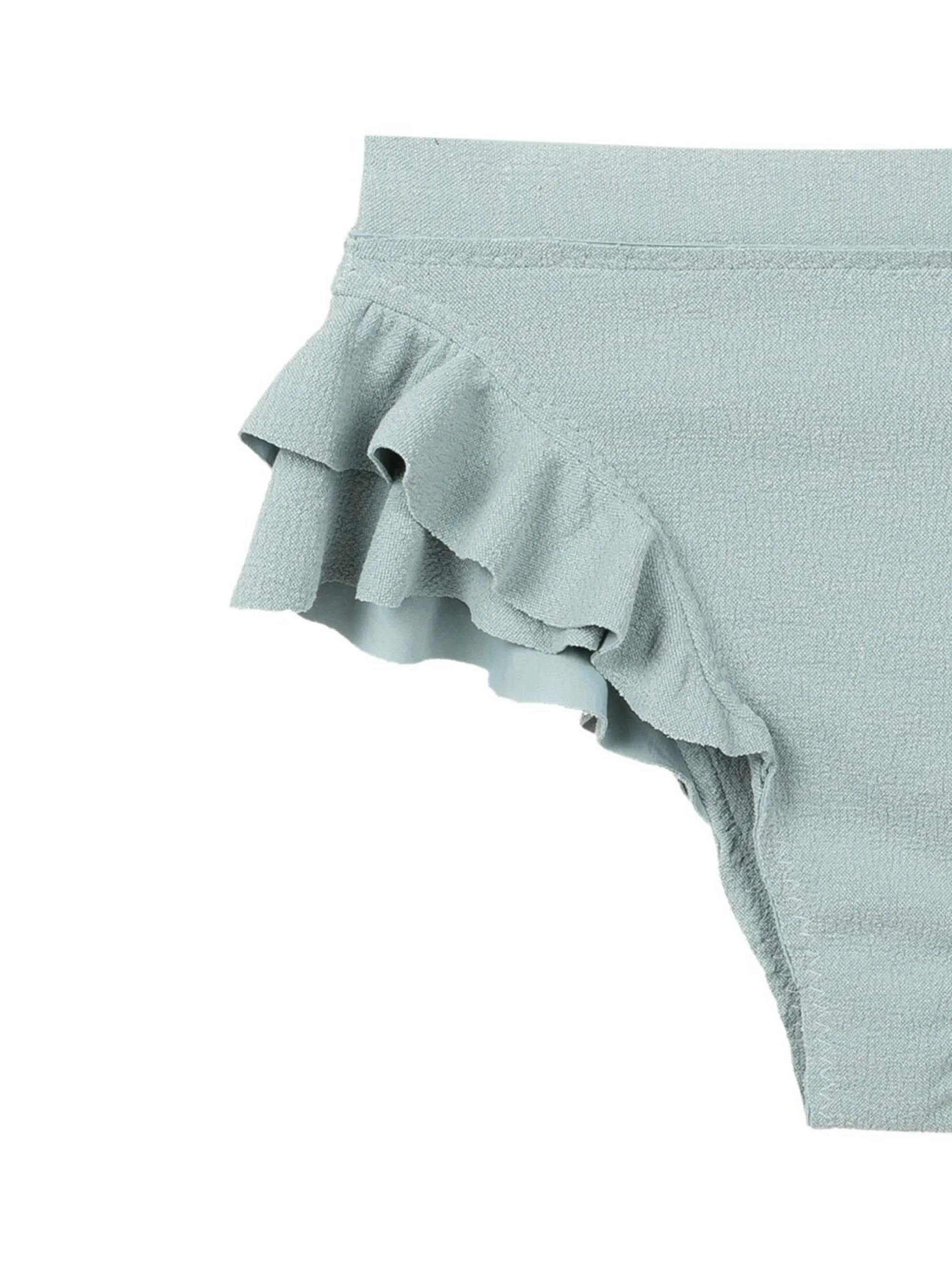 Бирюза, эластичный материал, завышенная талия, края с фестонами, воротник с оборками и среднее покрытие.