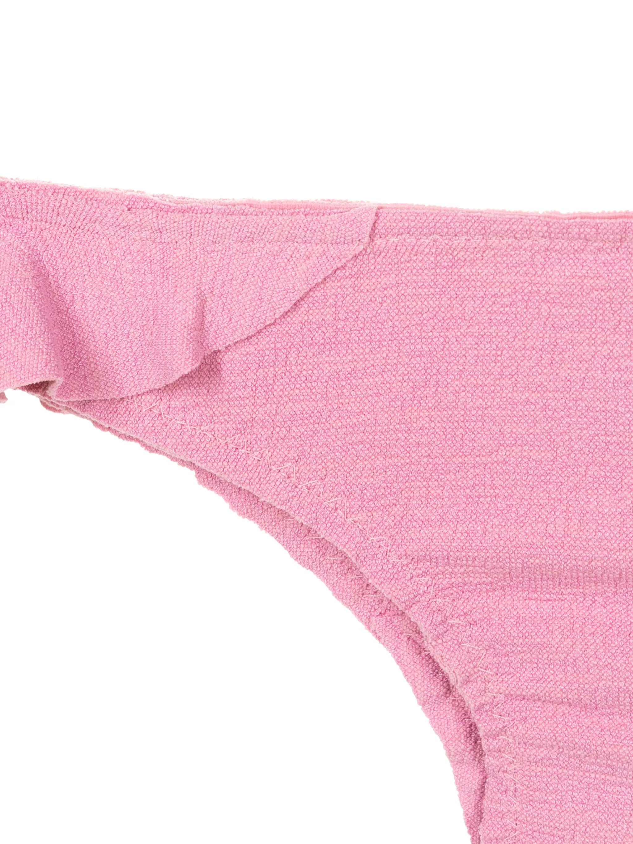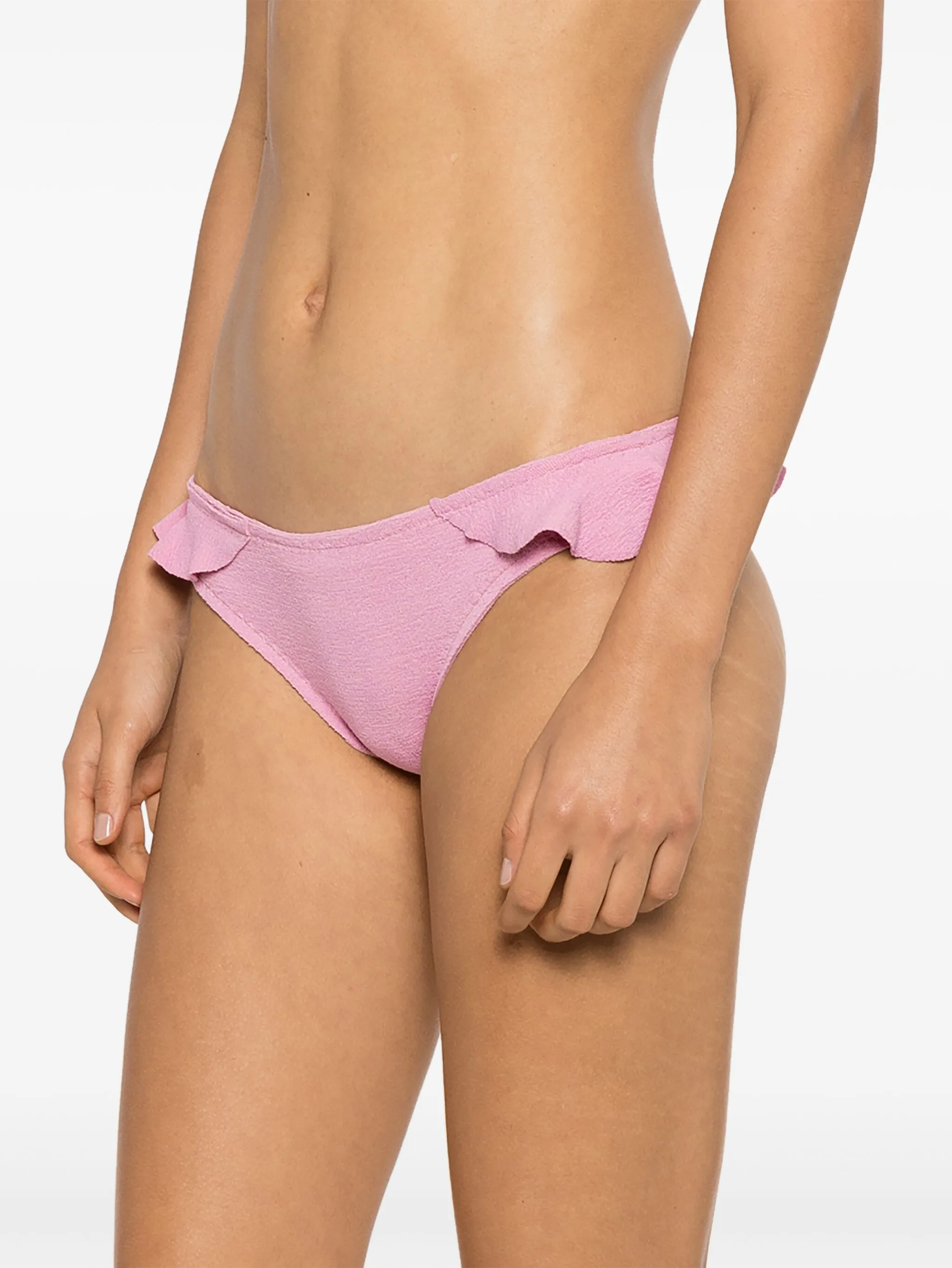 Нежно-розовый, эластичный материал, классические плавки бикини и вставки с оборками.