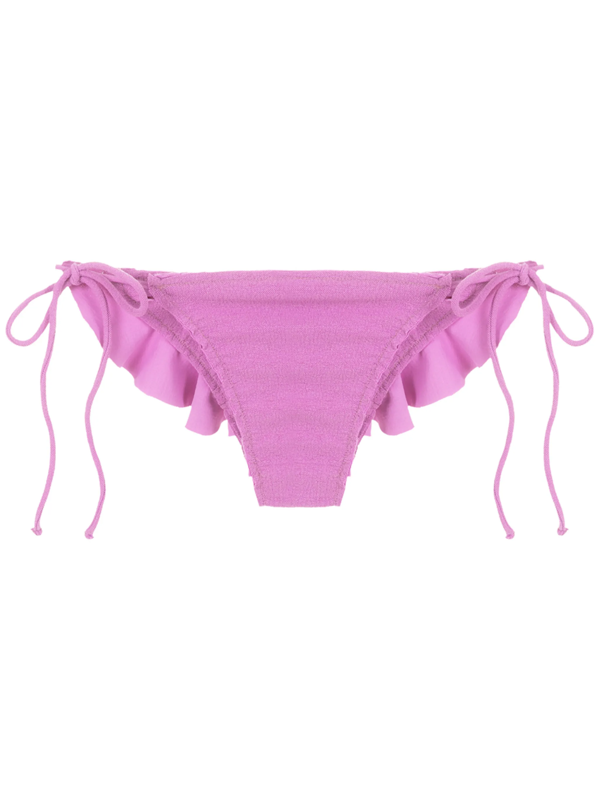 Низкая посадка, вставки с оборками и завязки по бокам.
