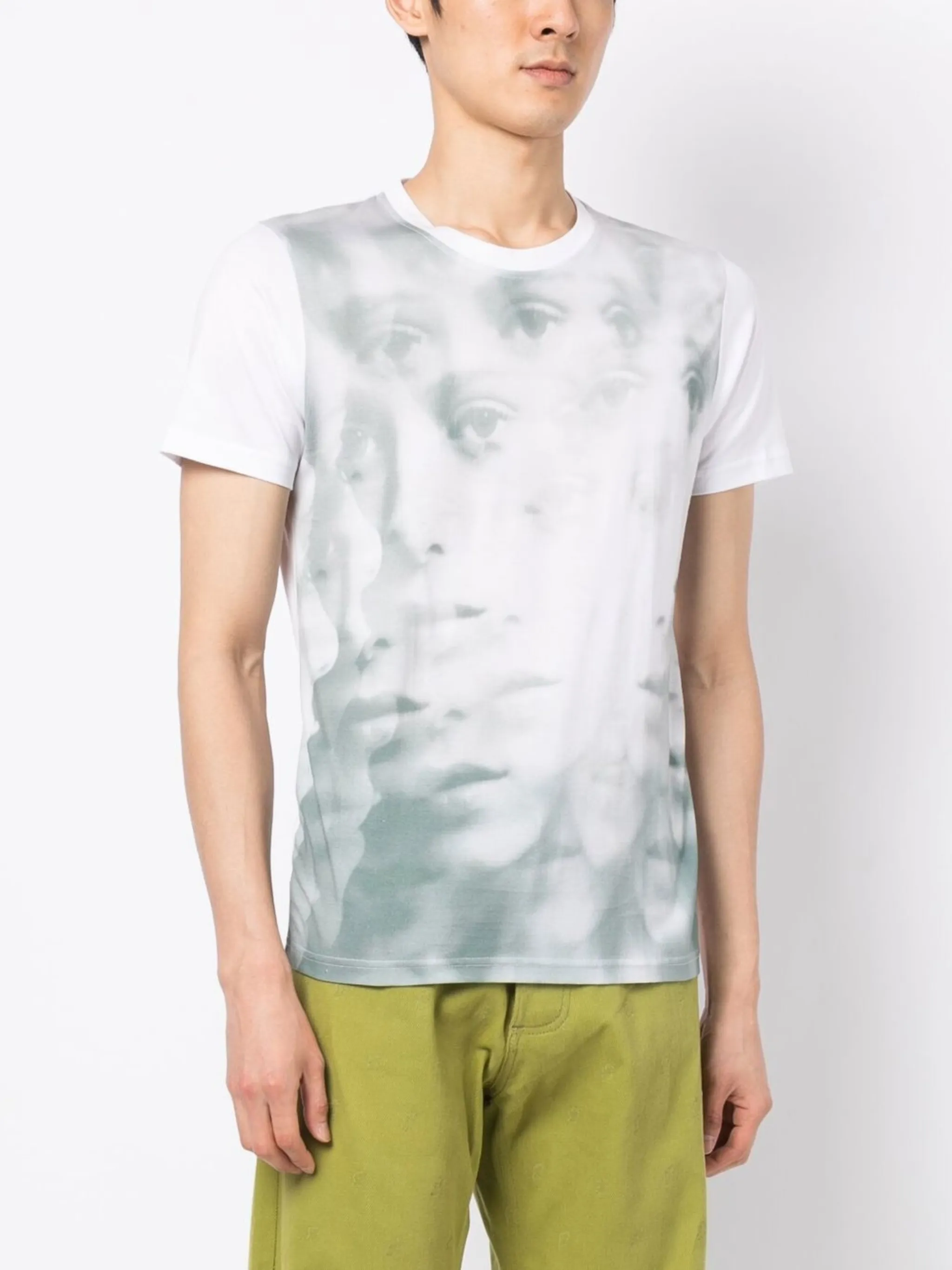 Белый, хлопок, графичный принт спереди, круглый вырез, короткие рукава и прямой подол.