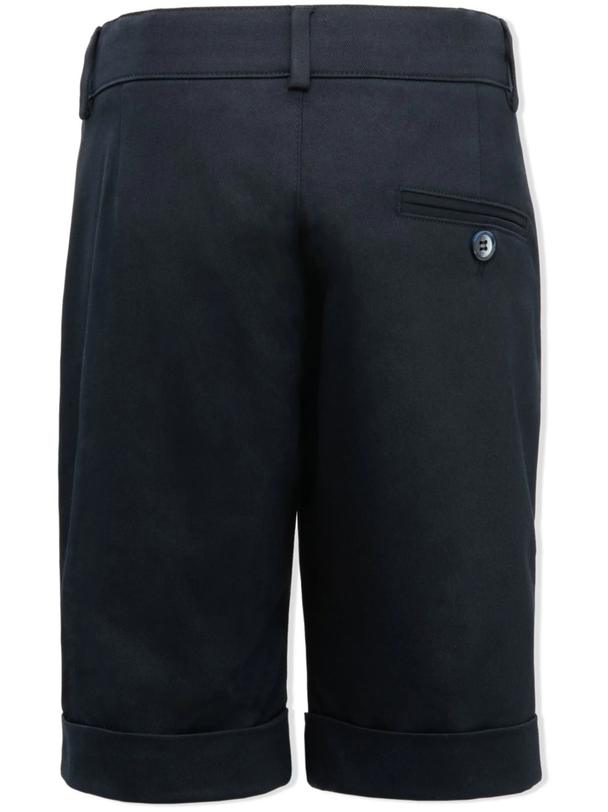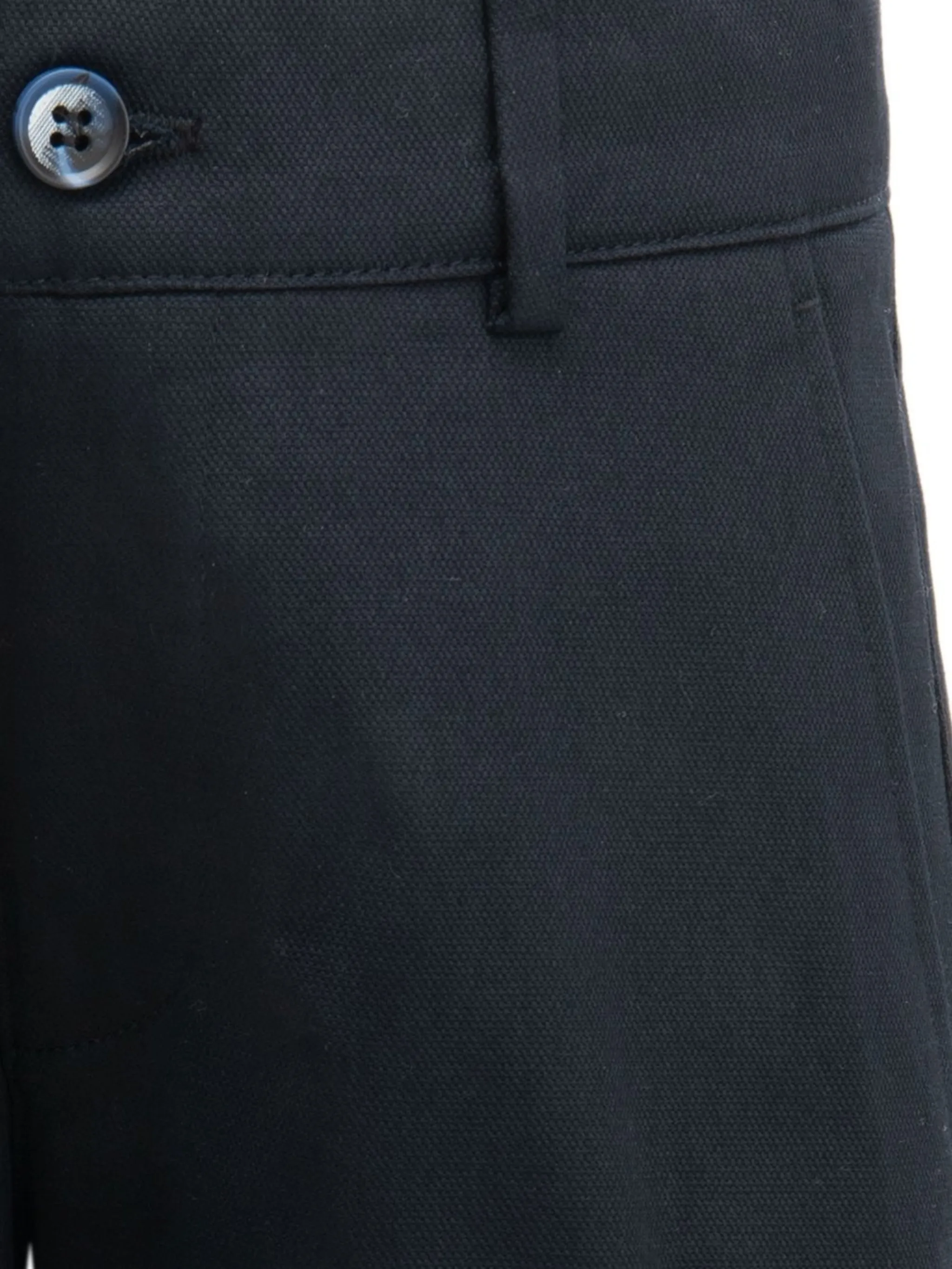 Темно-синий, эластичный хлопок, средняя посадка, ширинка на пуговицах, петли для ремня, два прорезных кармана по бокам, задние карманы с листочкой и длина по колено.