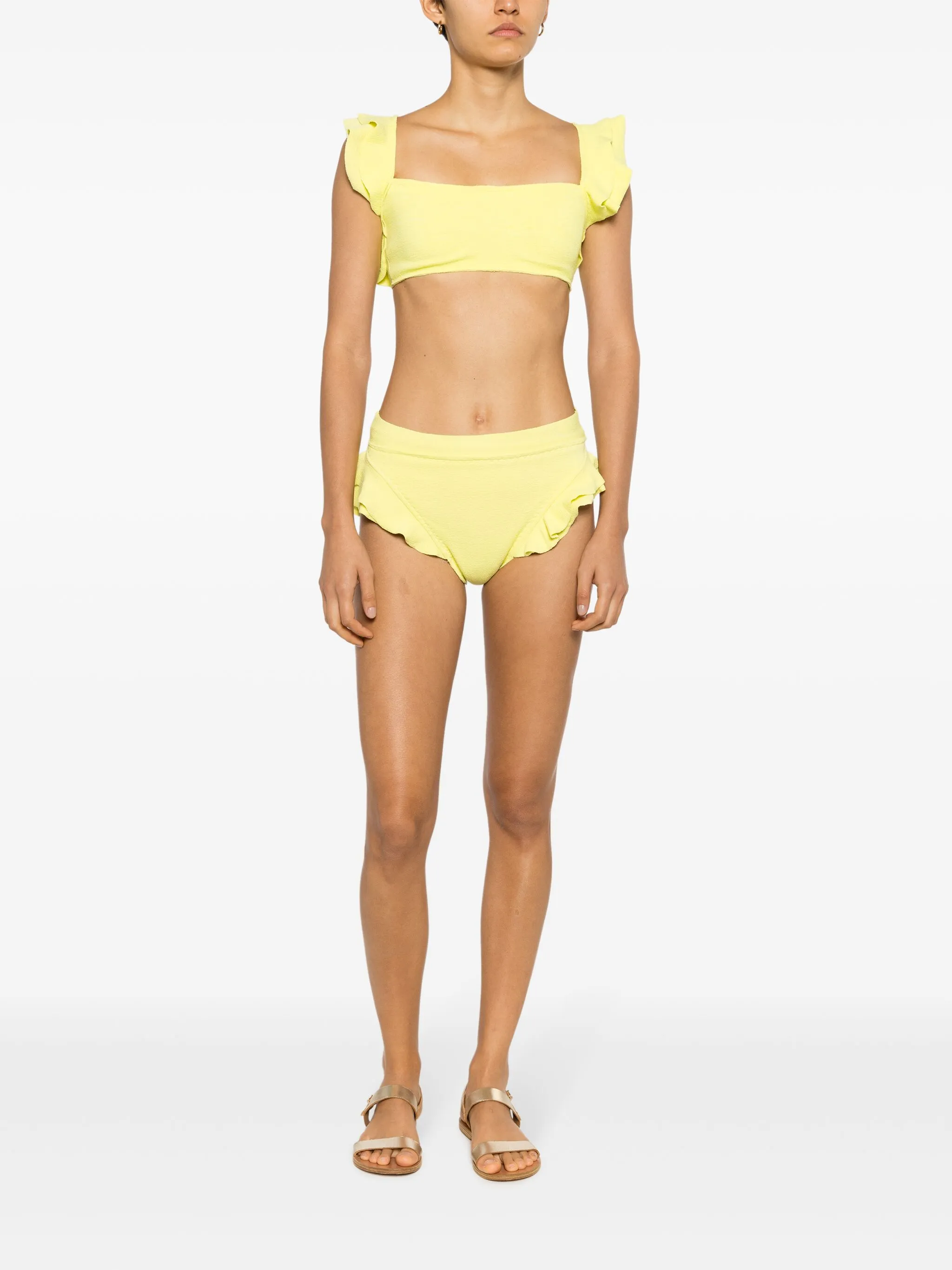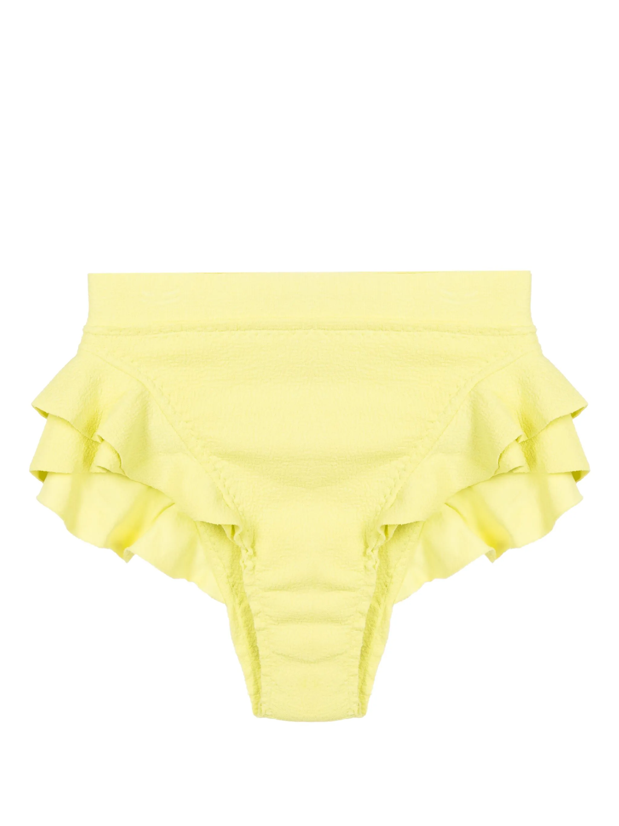Лимонный, эластичный материал, вставки с оборками, завышенная талия и классические плавки бикини.