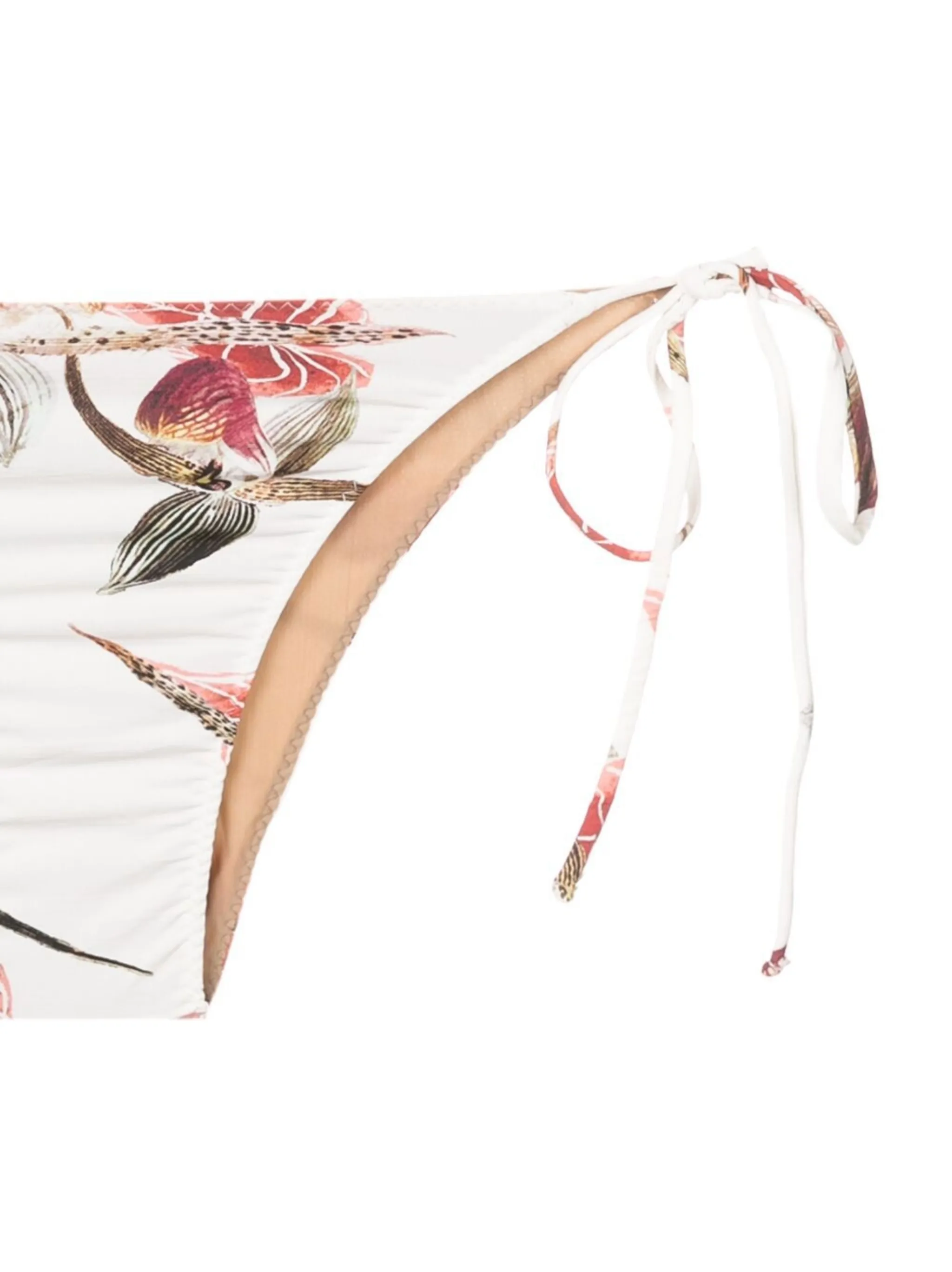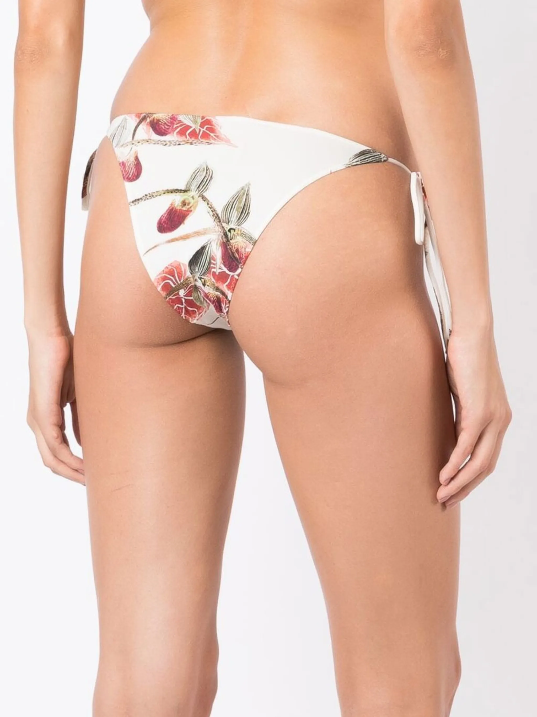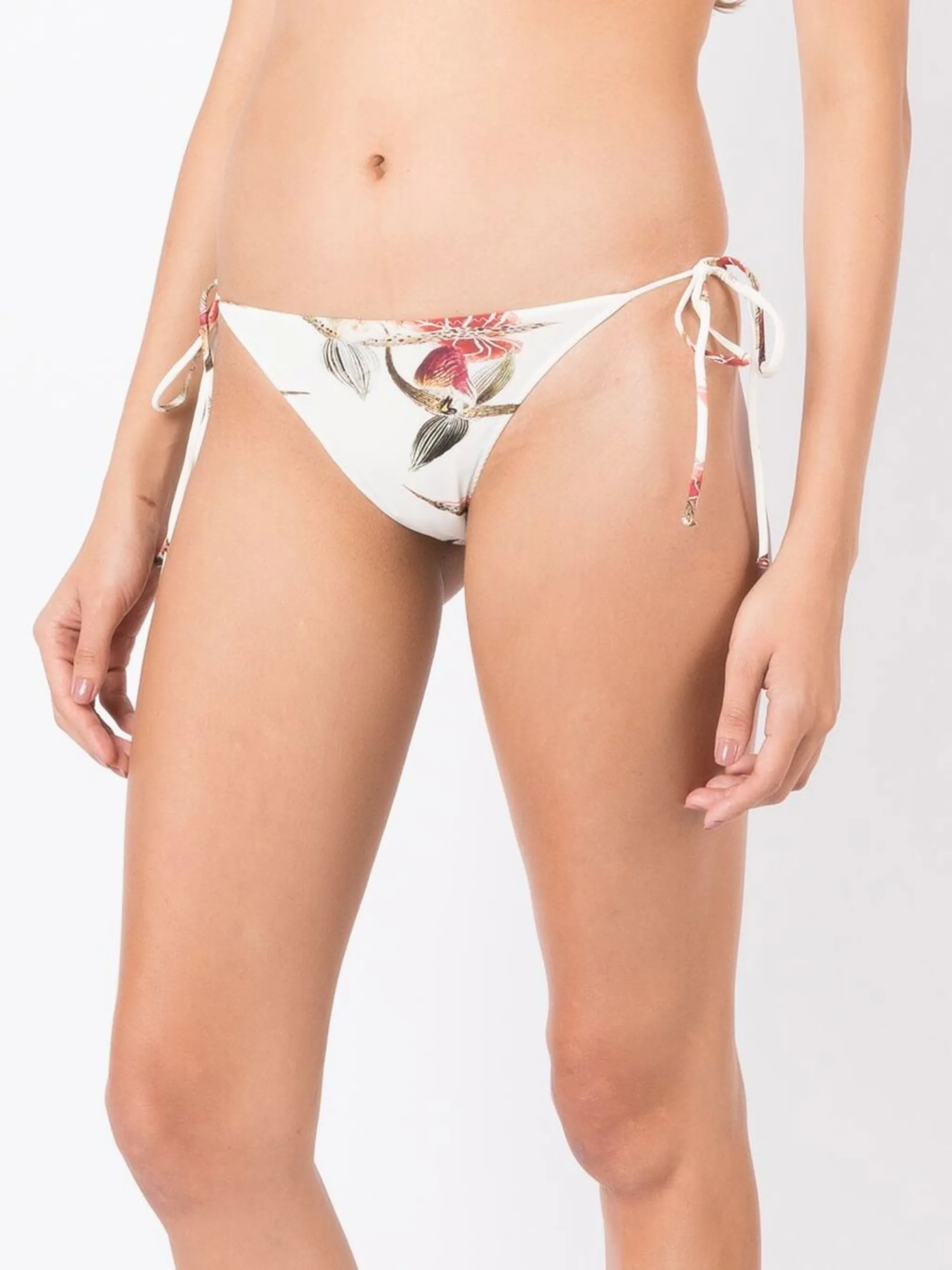 Эластичная модель, сплошной цветочный принт, завязки по бокам и высокий вырез.