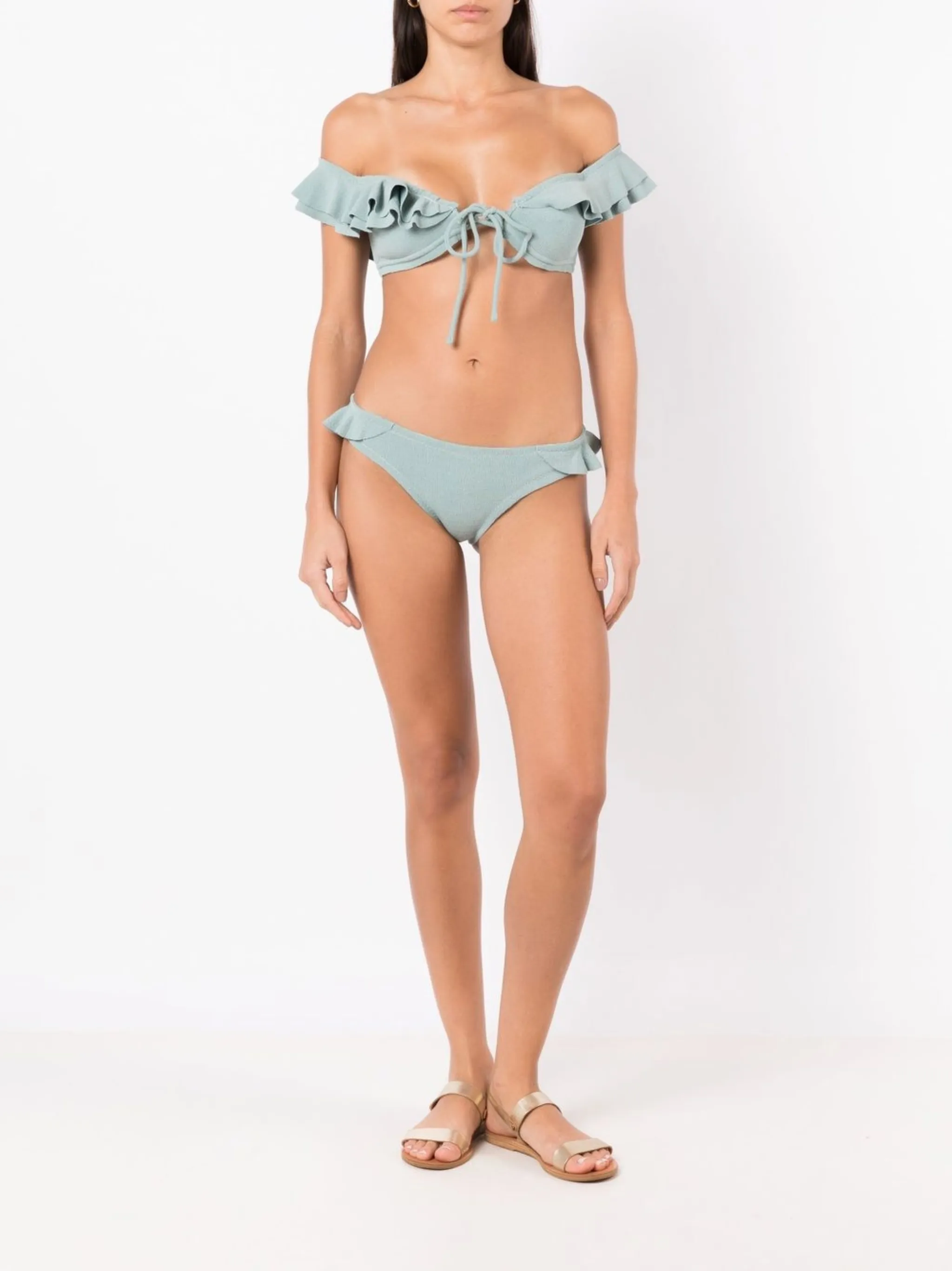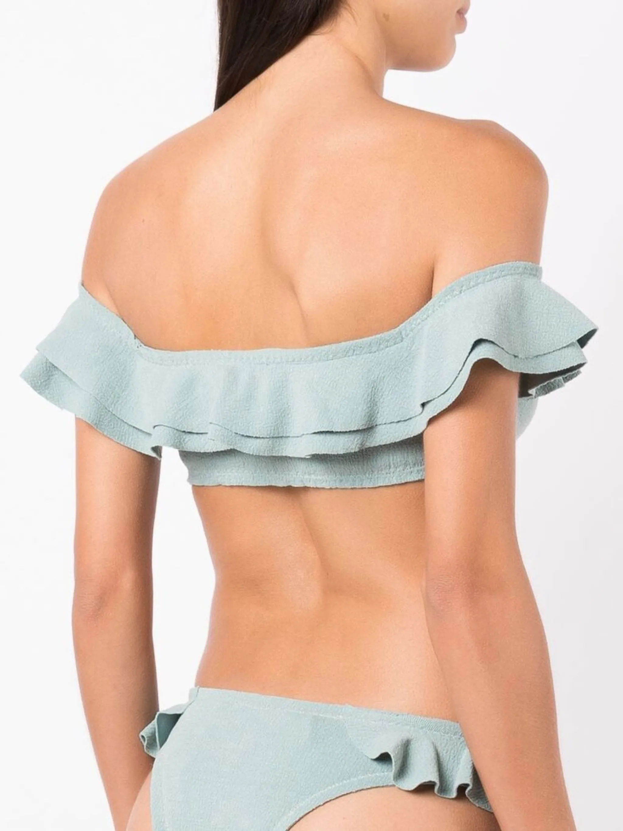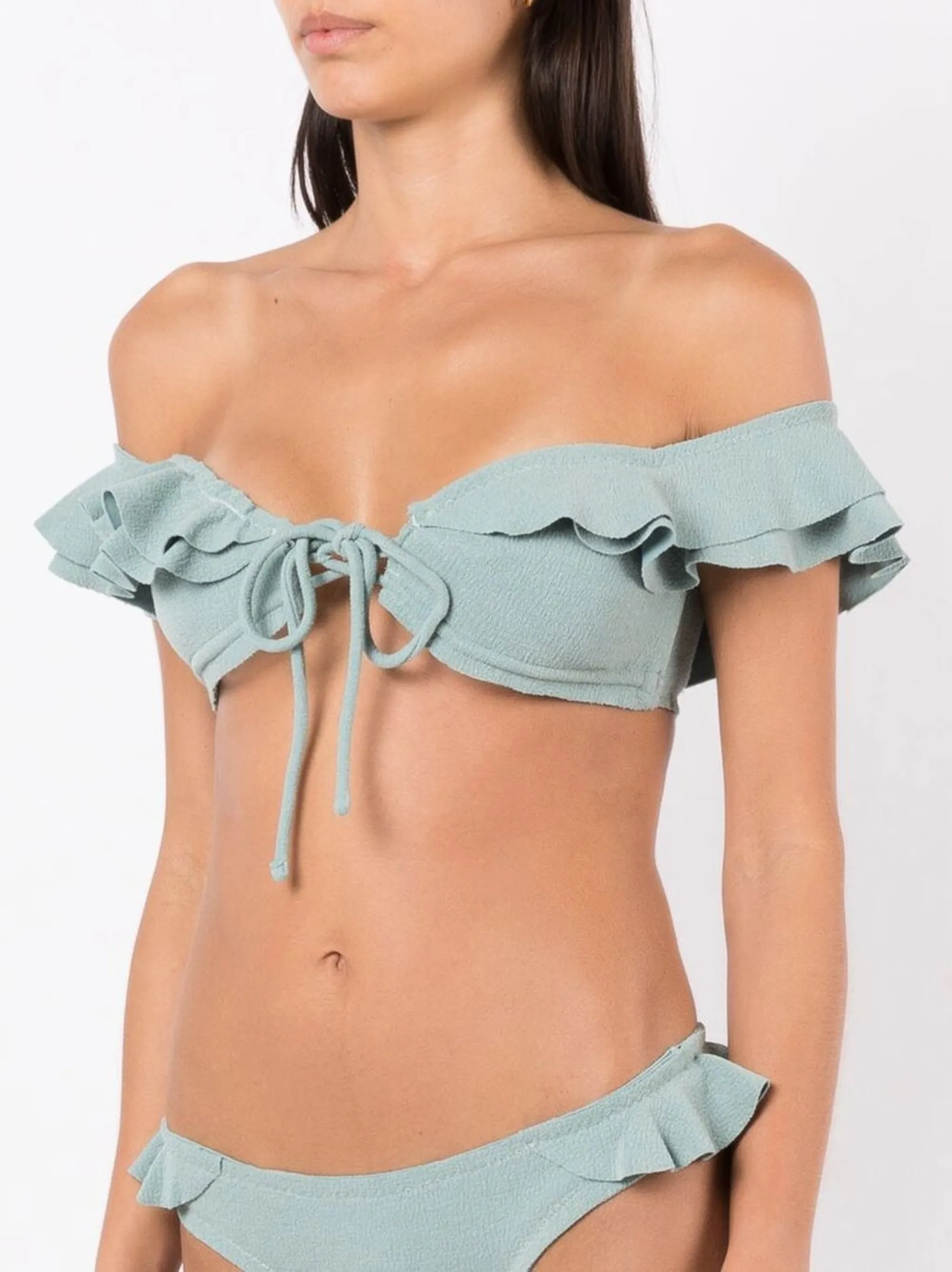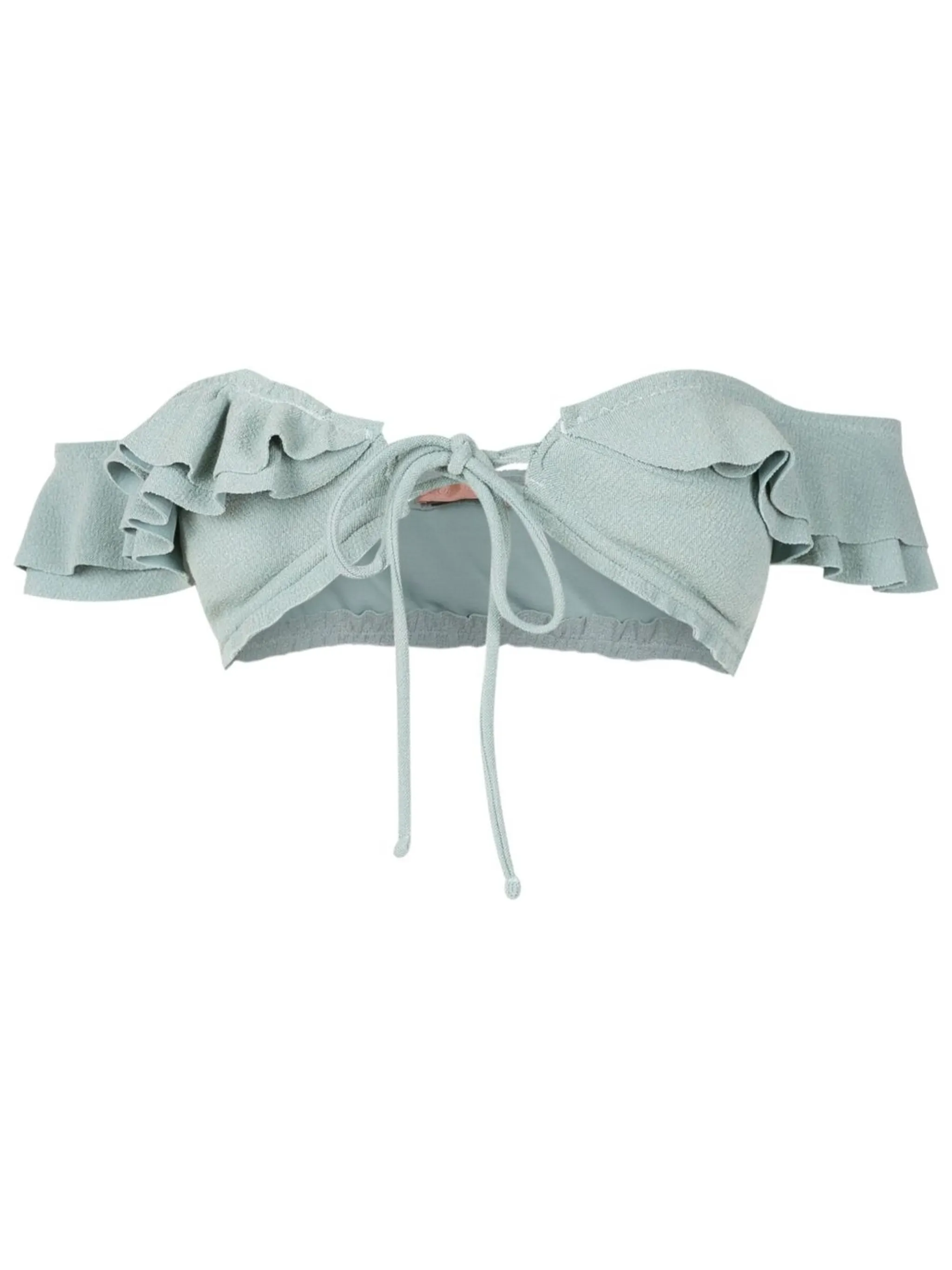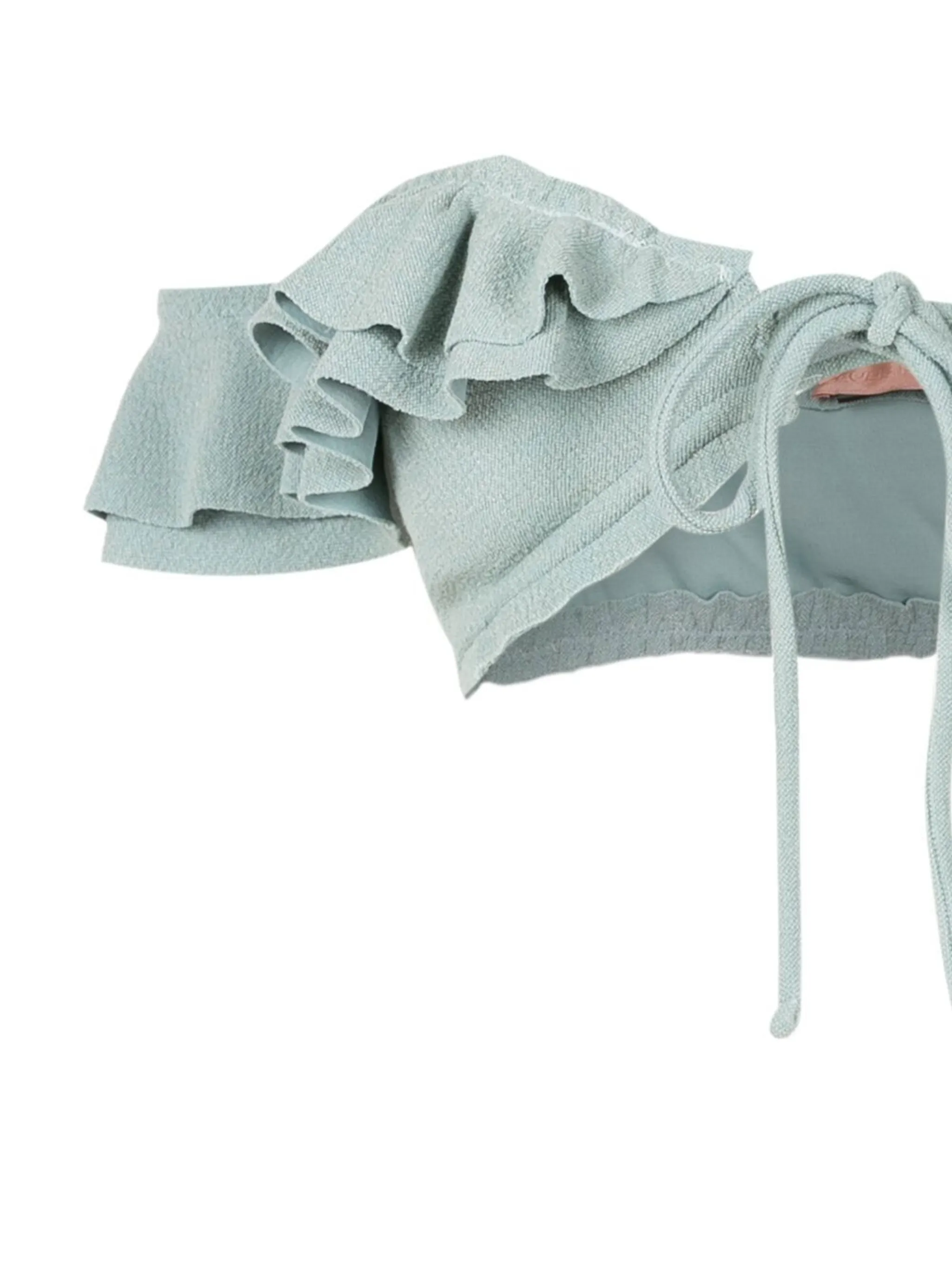 Бирюзовый, эластичный материал, открытые плечи, края с фестонами, завязки спереди и присборенный воротник.