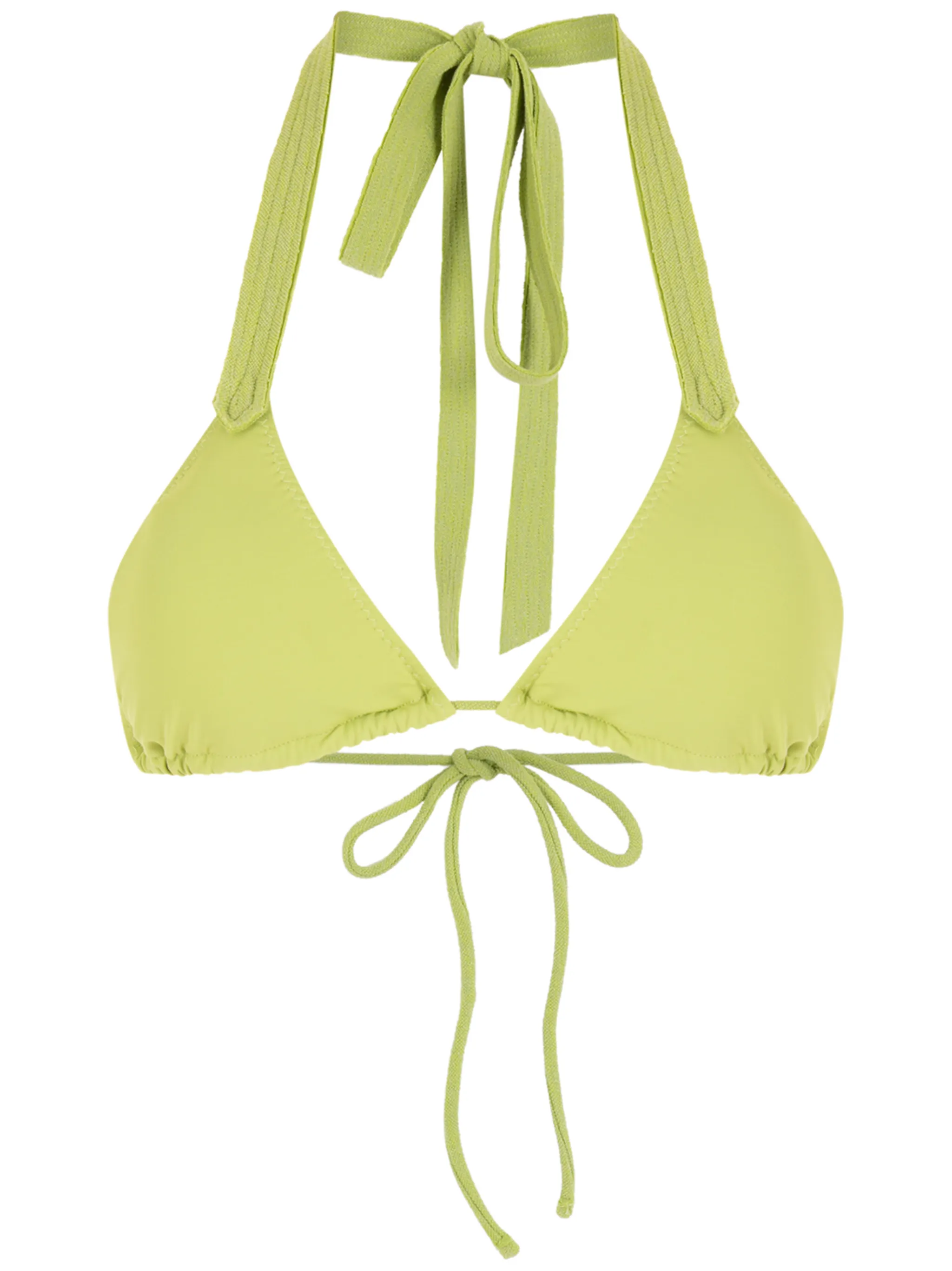 Эластичная модель, завязки вокруг шеи, треугольная чашка и застежка на завязке сзади.