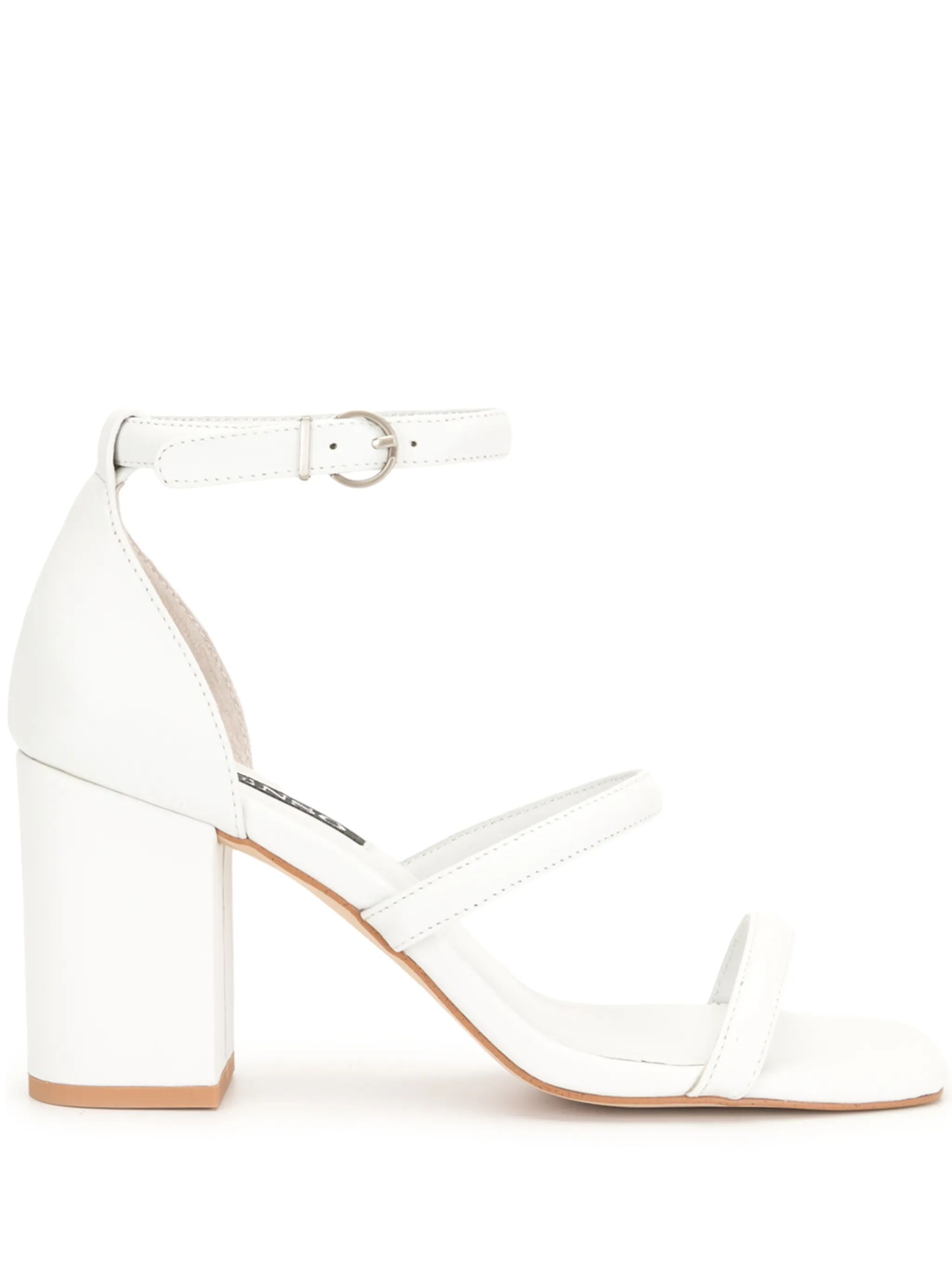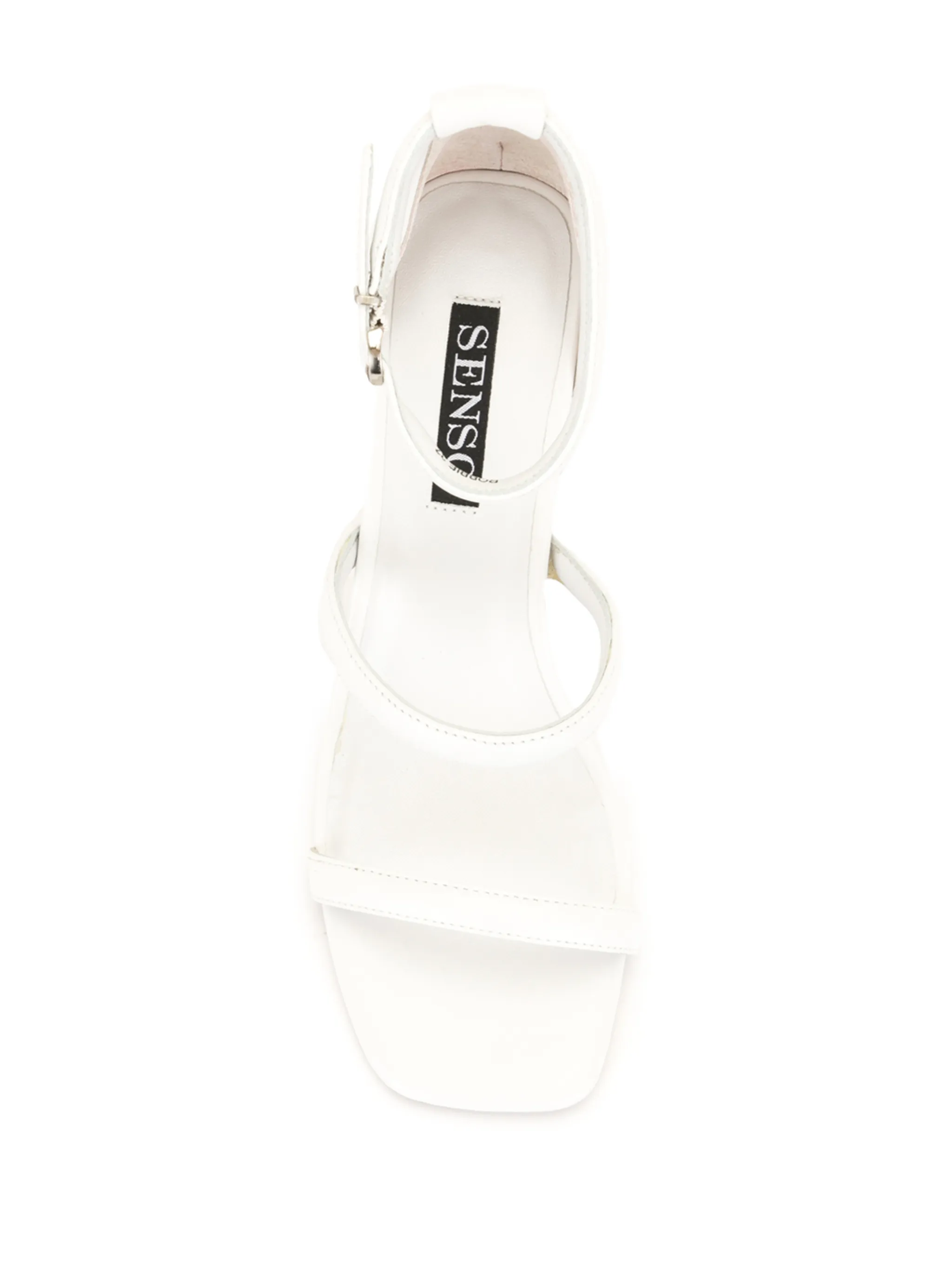 Открытый носок, стелька с логотипом, ремешок на щиколотке с пряжкой и высокий блочный каблук. Цвет: белый.