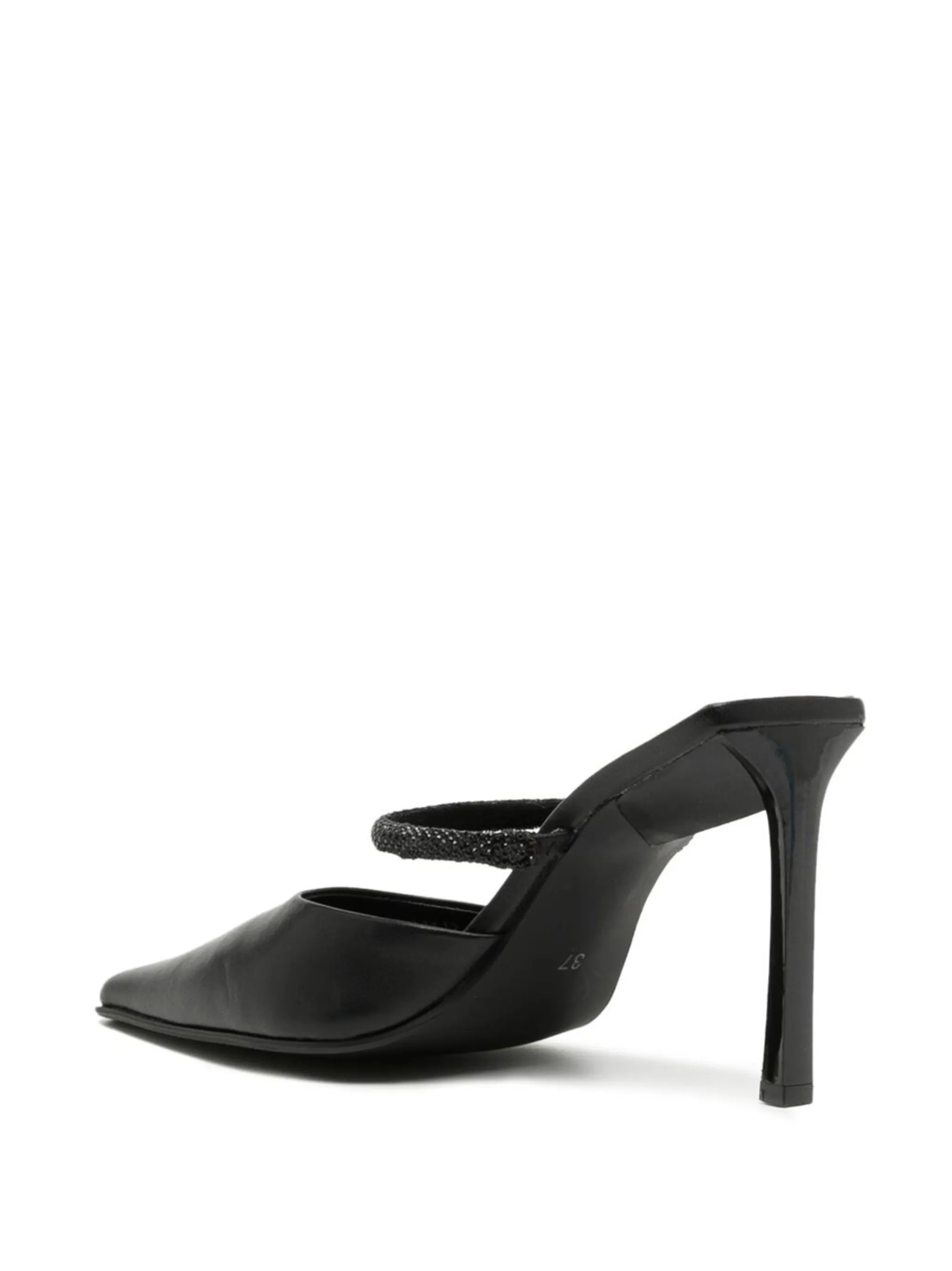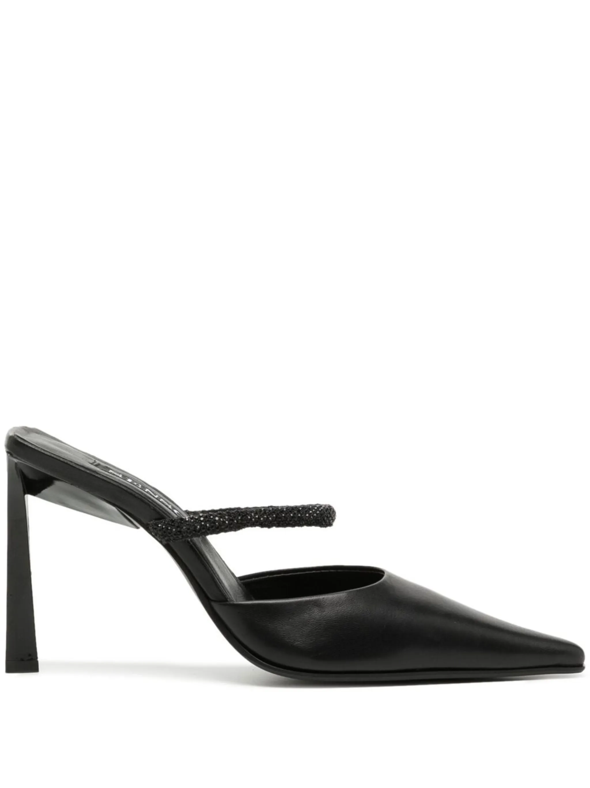 Перекрестные ремешки, модель без застежки, заостренный носок, высокий каблук конической формы и стелька с логотипом.