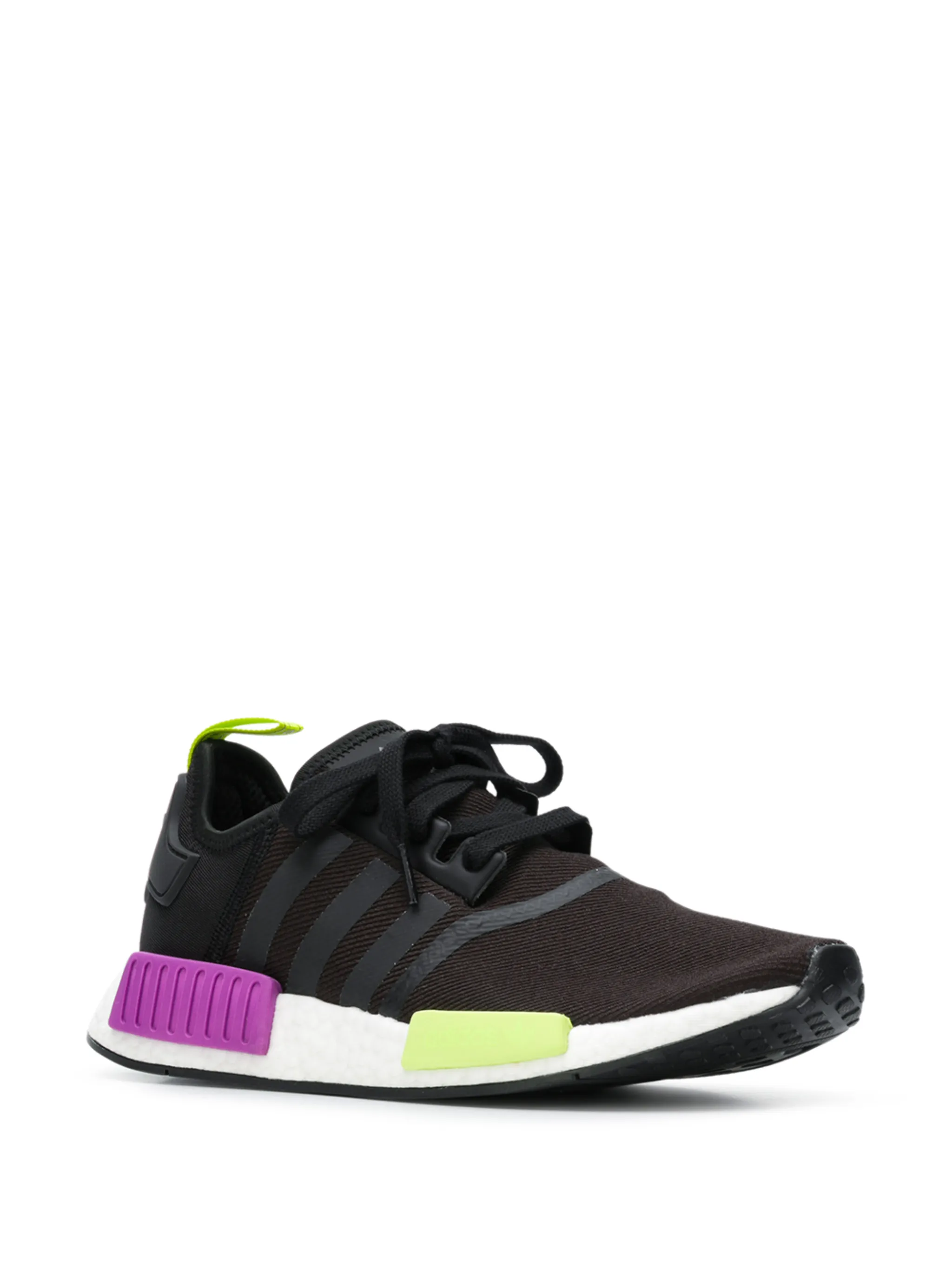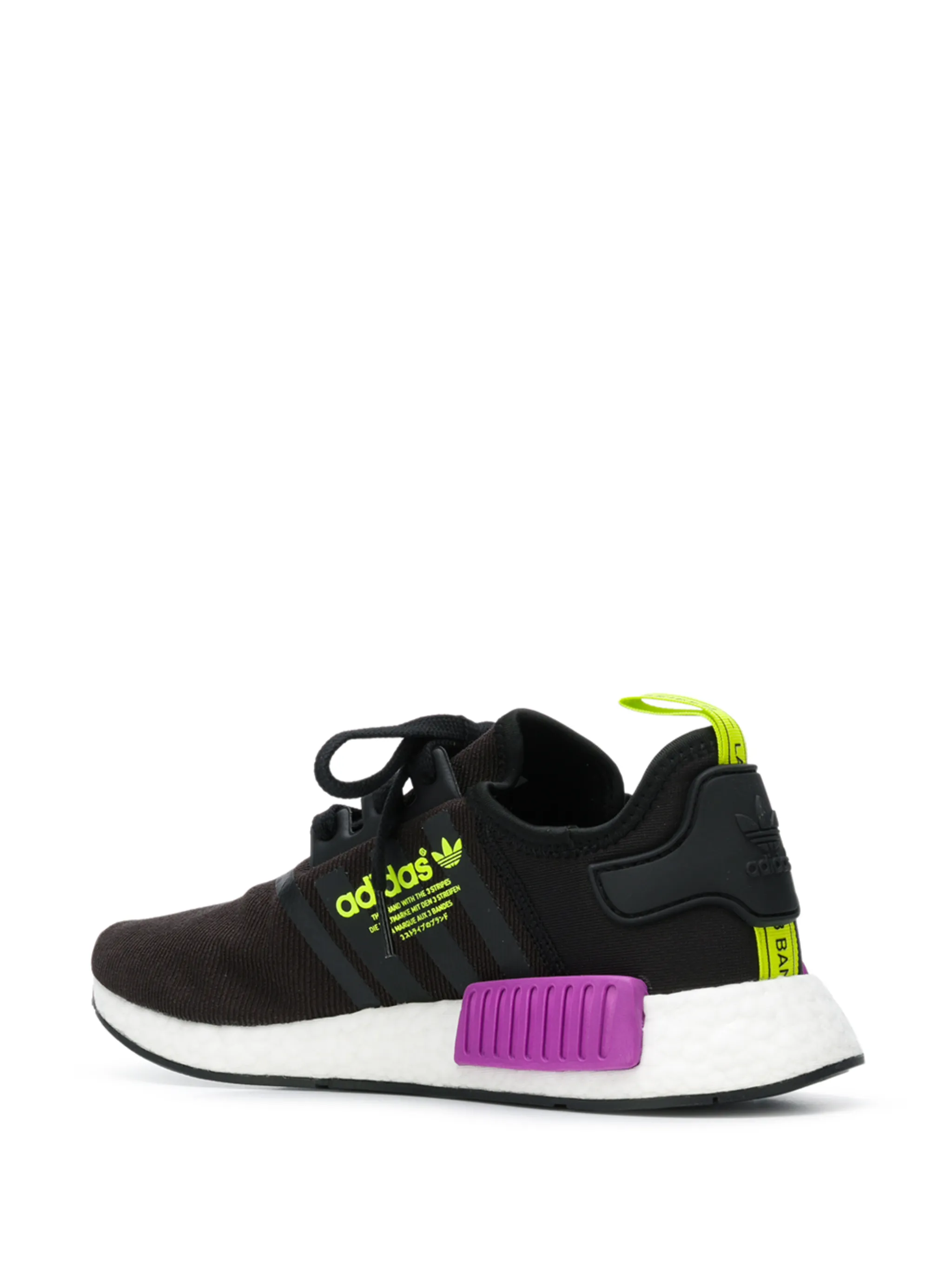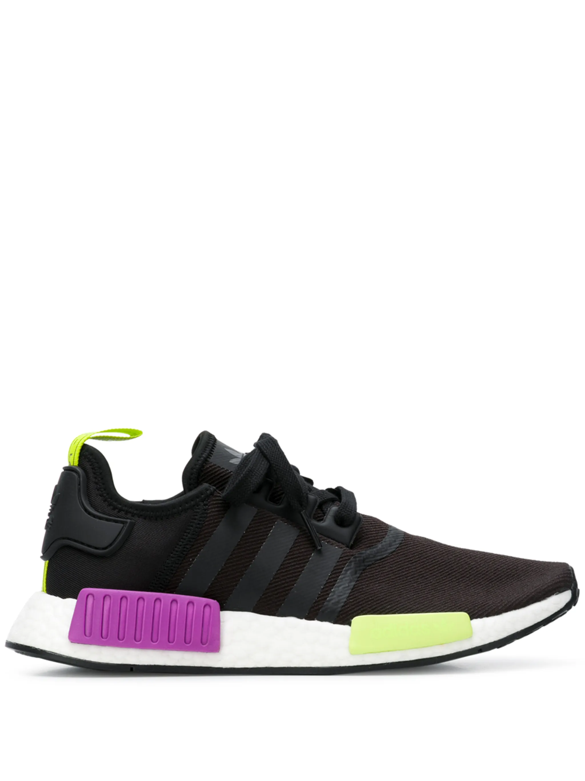 Спорт лег в основу идеологии adidas. Бренд создает обувь для разных видов спорта и повседневной жизни, объединяя дизайн и инновации. В коллекцию вошли черные кроссовки NMD_R1 с неоновыми вставками фиолетового и желтого оттенка от adidas (Адидас). Закругленный носок, шнуровка спереди, стелька с логотипом, нашивка с логотипом на язычке, петля для подтягивания сзади и плоская резиновая подошва. Модель в стиле унисекс.