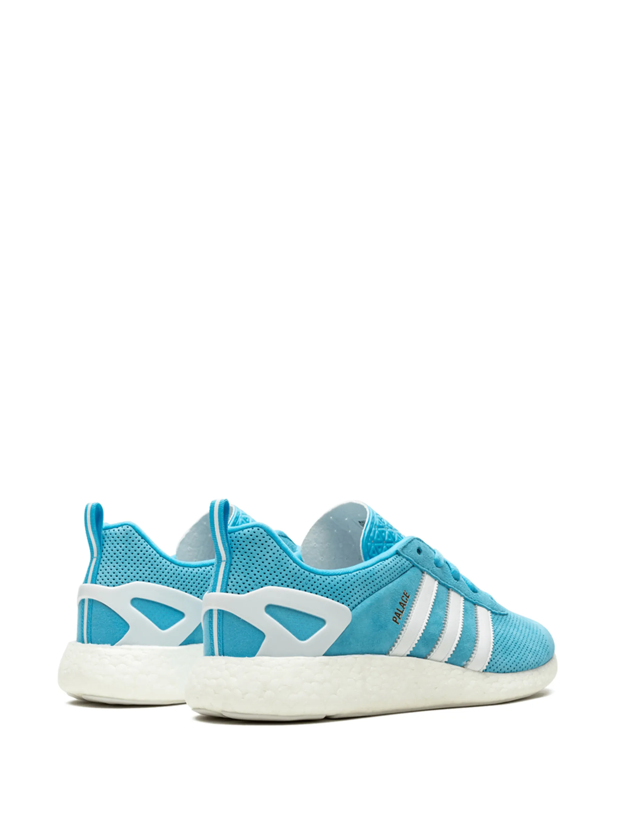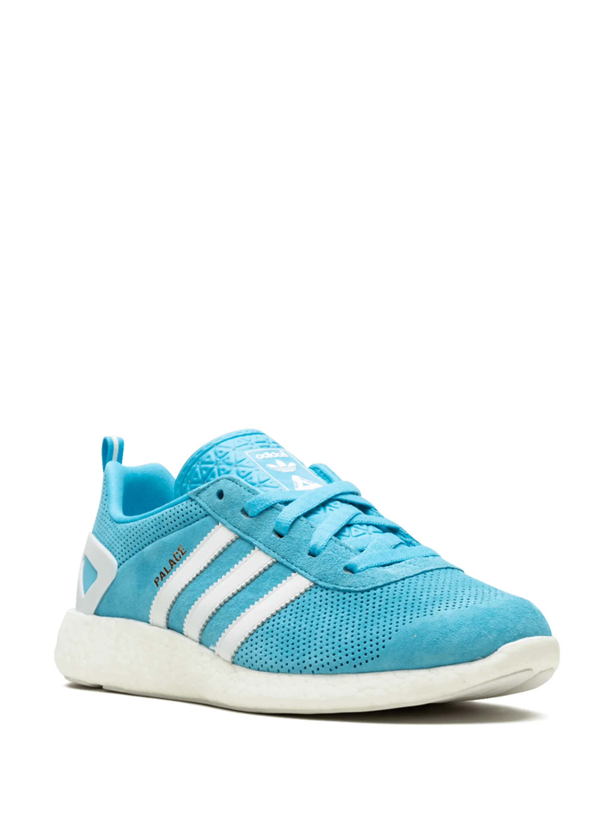 Результатом коллаборации Palace и adidas стали голубые замшевые кроссовки Palace Pro Boost от adidas (Адидас). Закругленный носок, декоративная перфорация, шнуровка спереди, петля для подтягивания сзади и белая резиновая подошва.