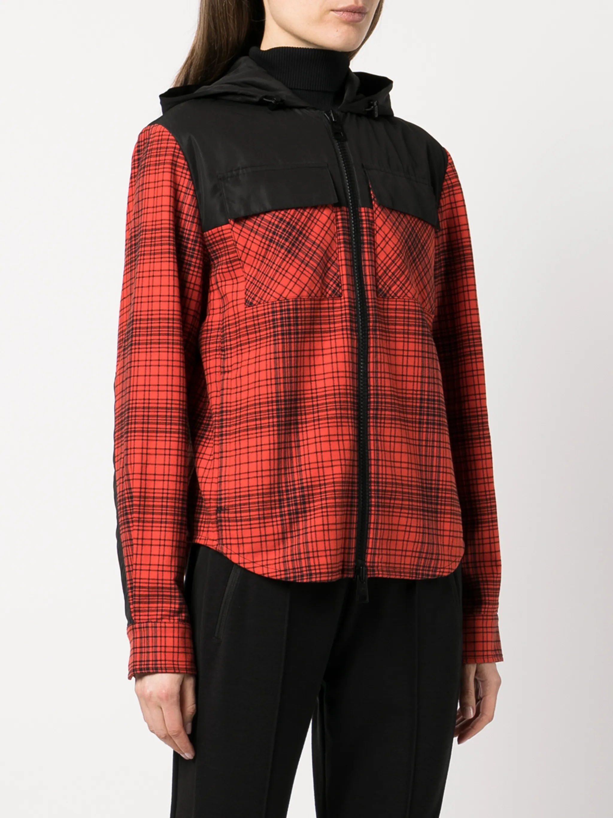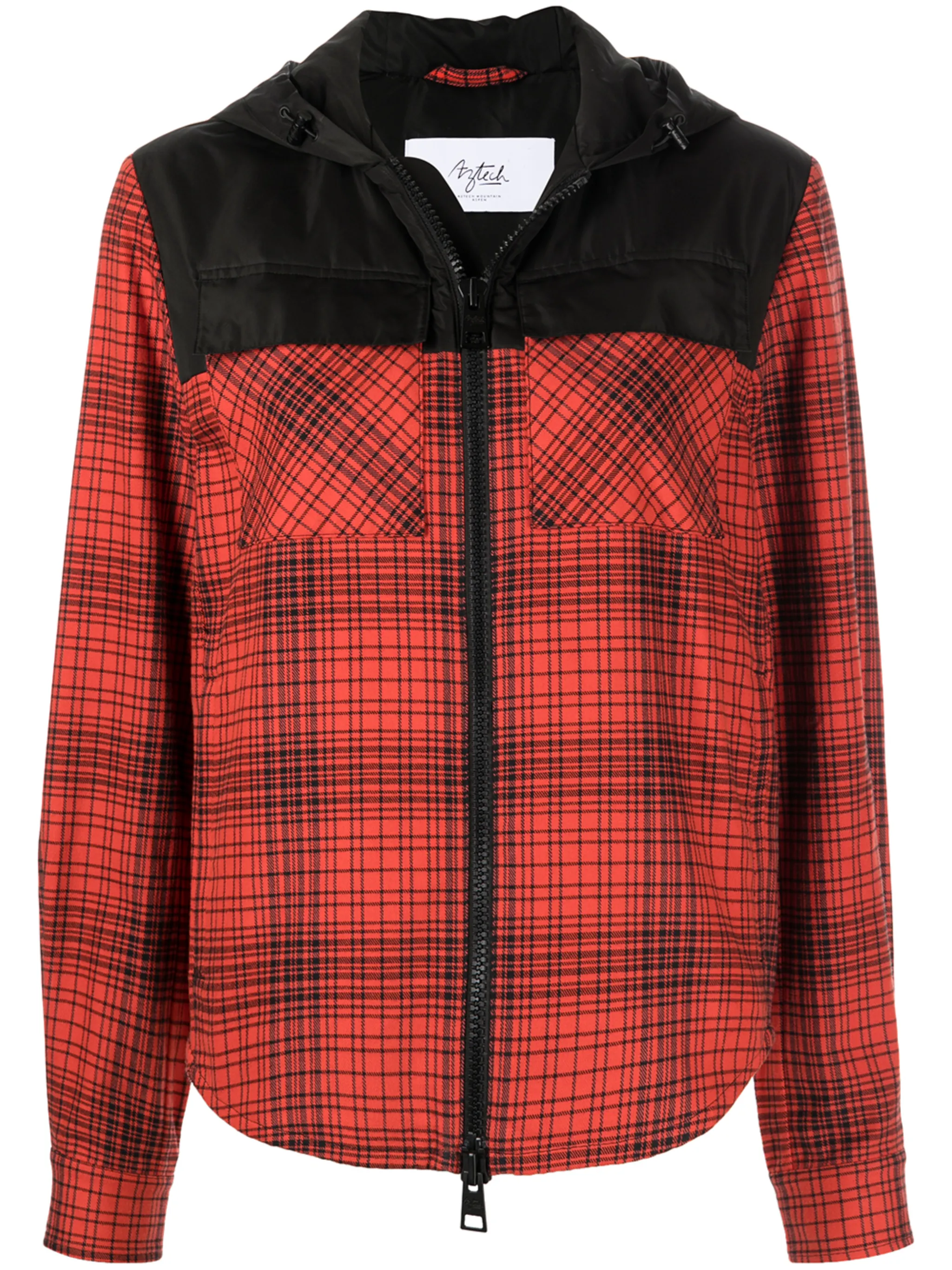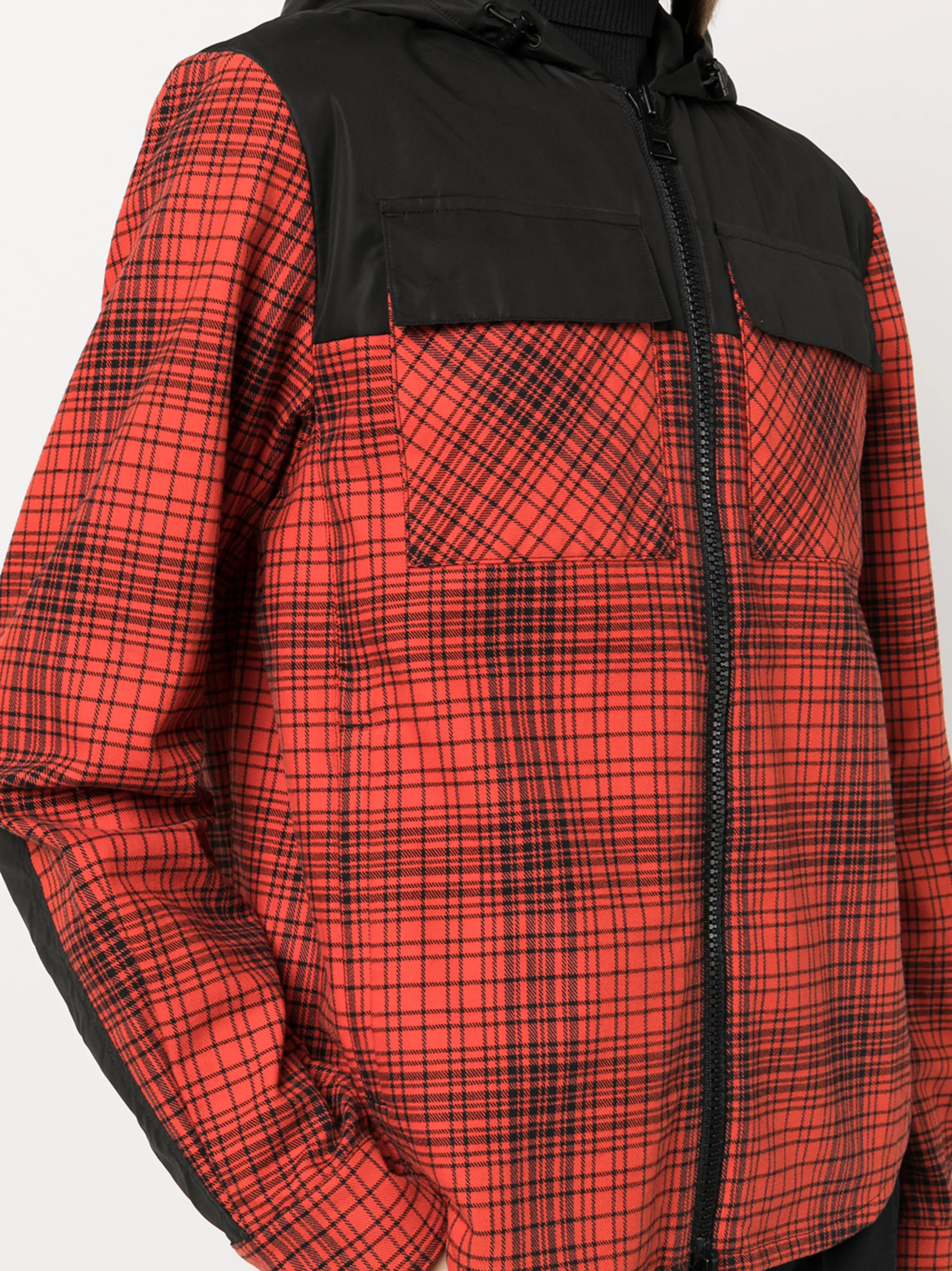 Принт в клетку, вставки, два передних кармана с клапанами, застежка на молнии спереди, классический капюшон, длинные рукава и закругленный подол.