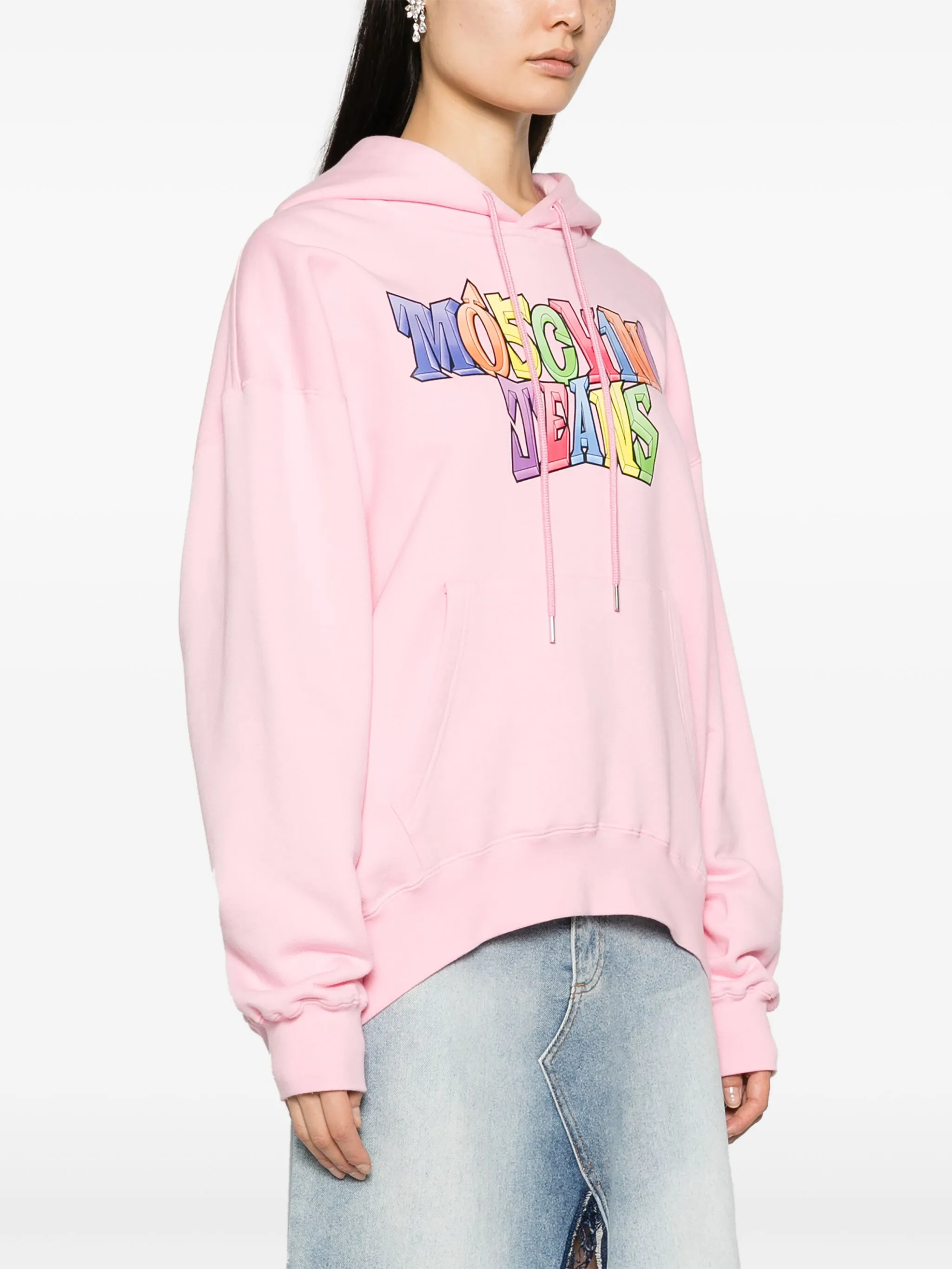 Розовый, хлопок, логотип спереди, приспущенные плечи, длинные рукава, карман-муфта, неравномерный подол и затягивающийся на шнурок капюшон.