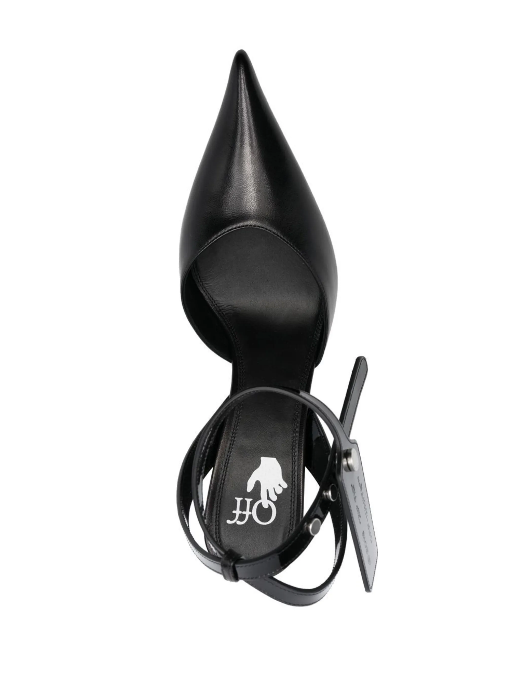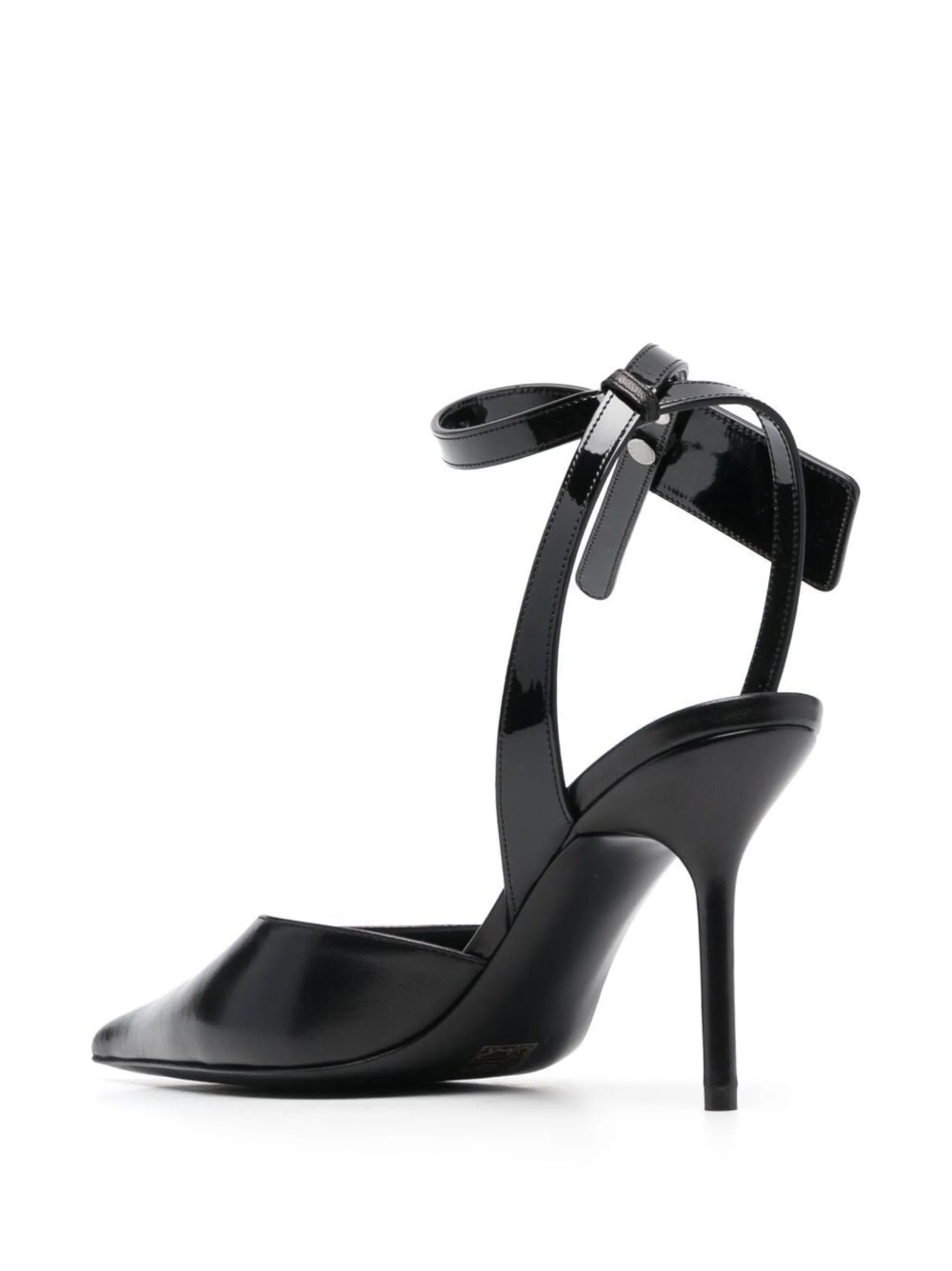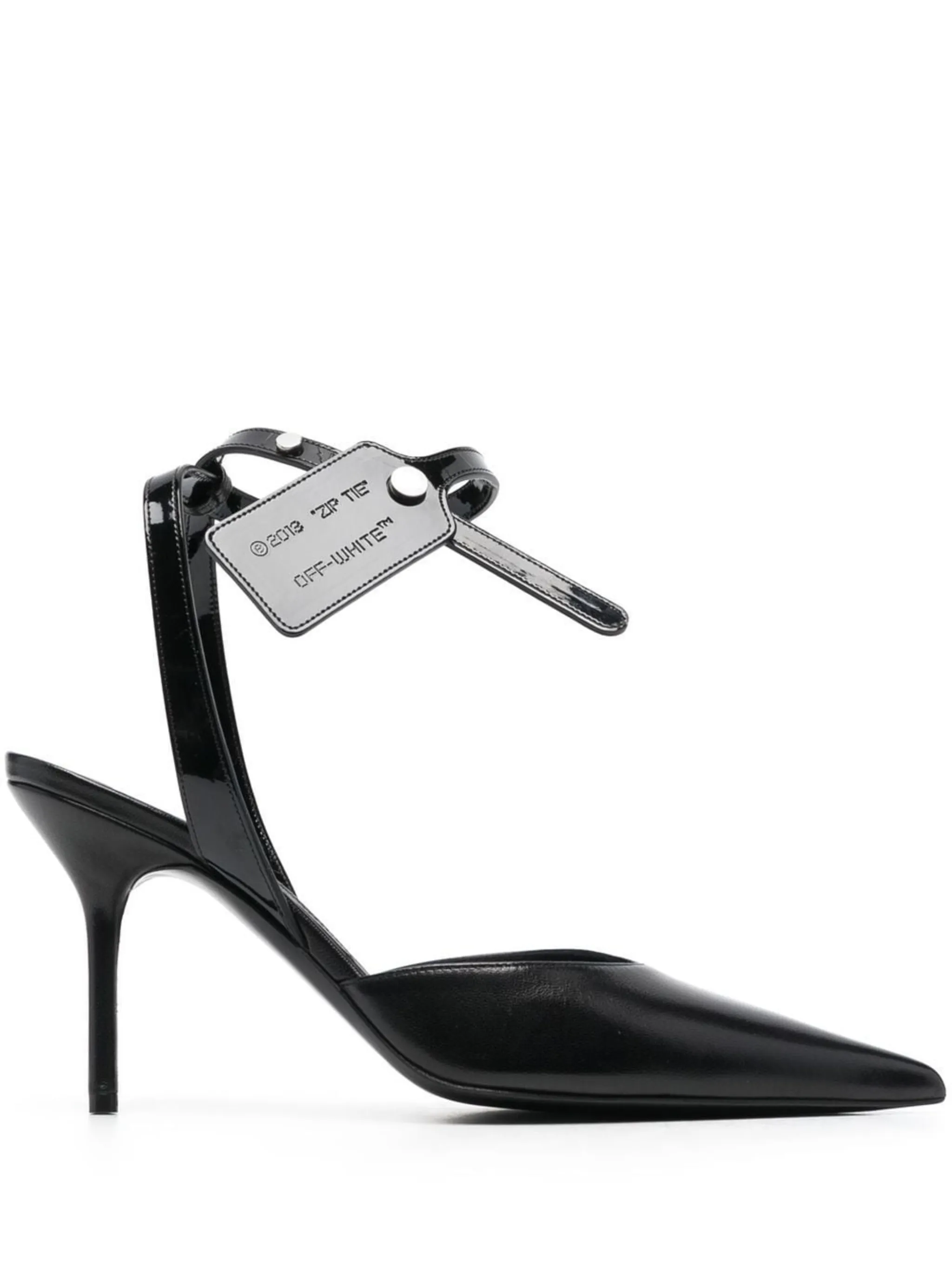 Черный, телячья кожа, заостренный носок, ремешок на щиколотке с пряжкой, бирка Zip Tie и каблук на высокой шпильке.