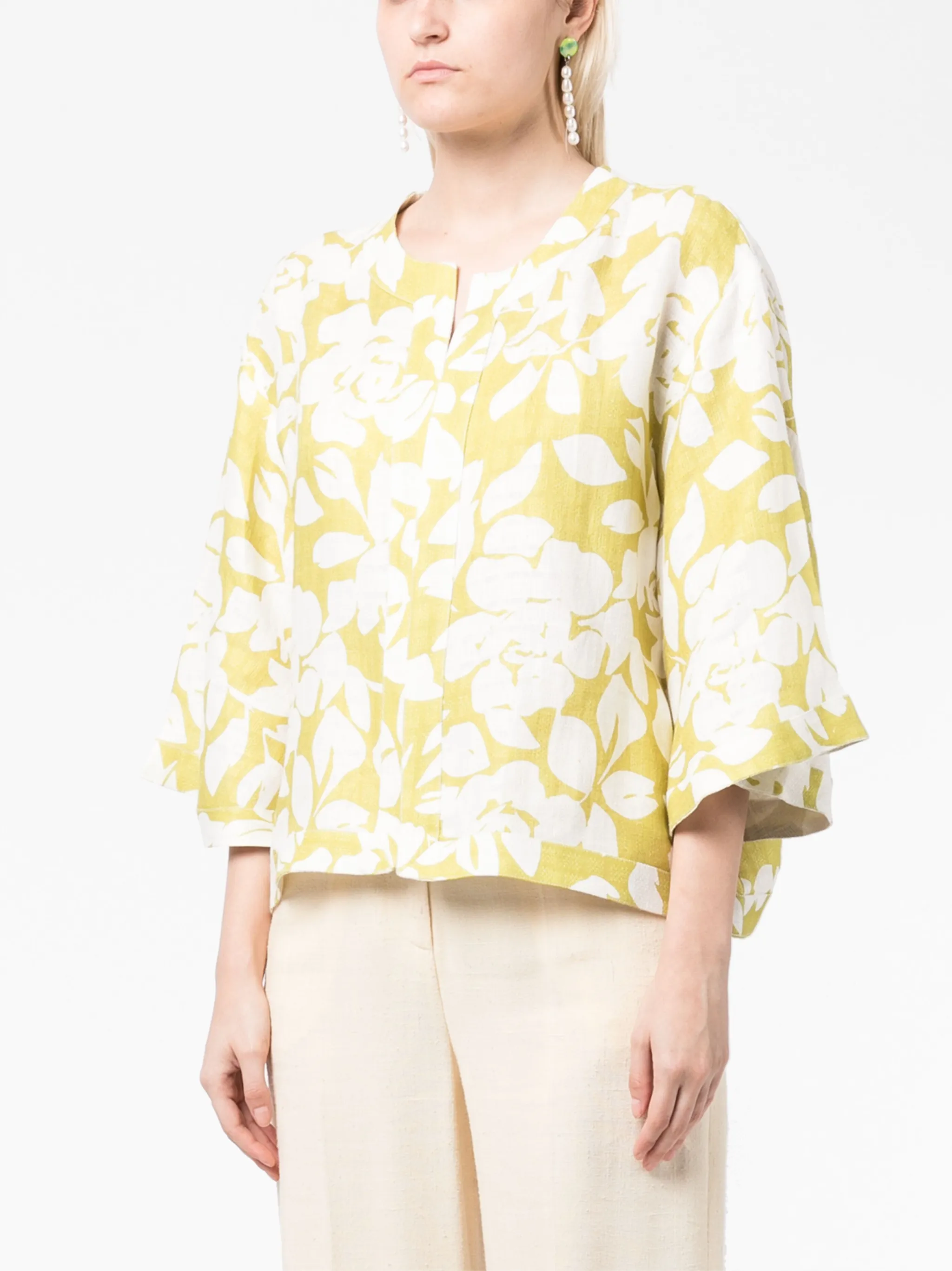 Салатовый, хлопок, сплошной цветочный принт, модель без застежки, приспущенные плечи, рукава три четверти и прямой подол.