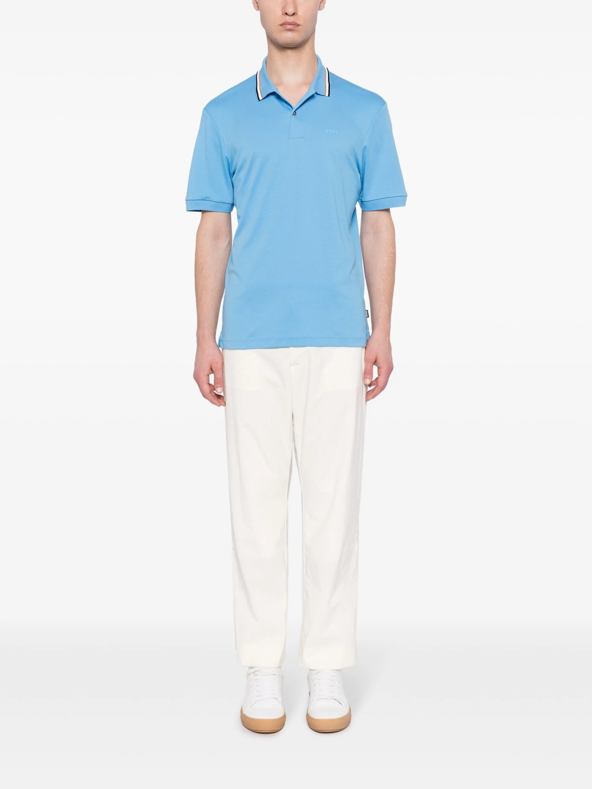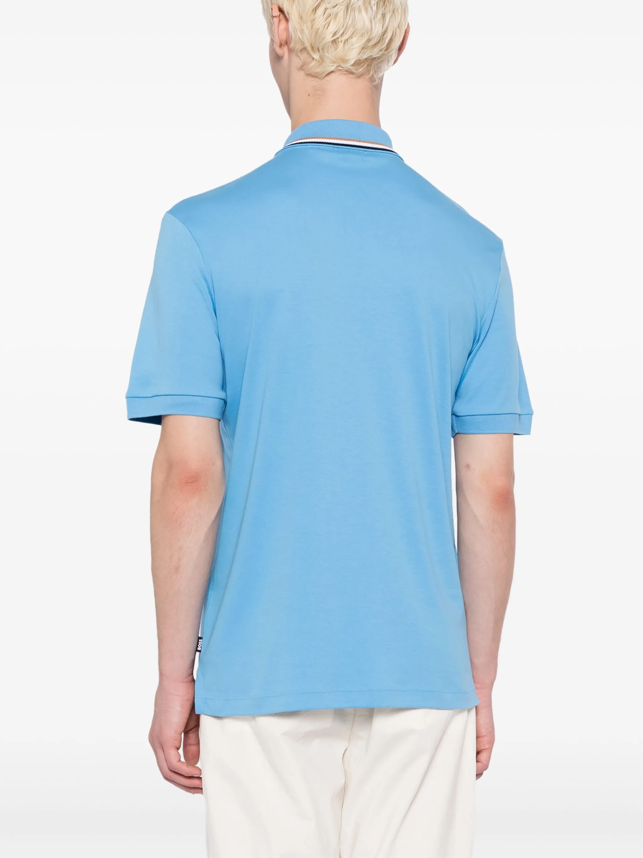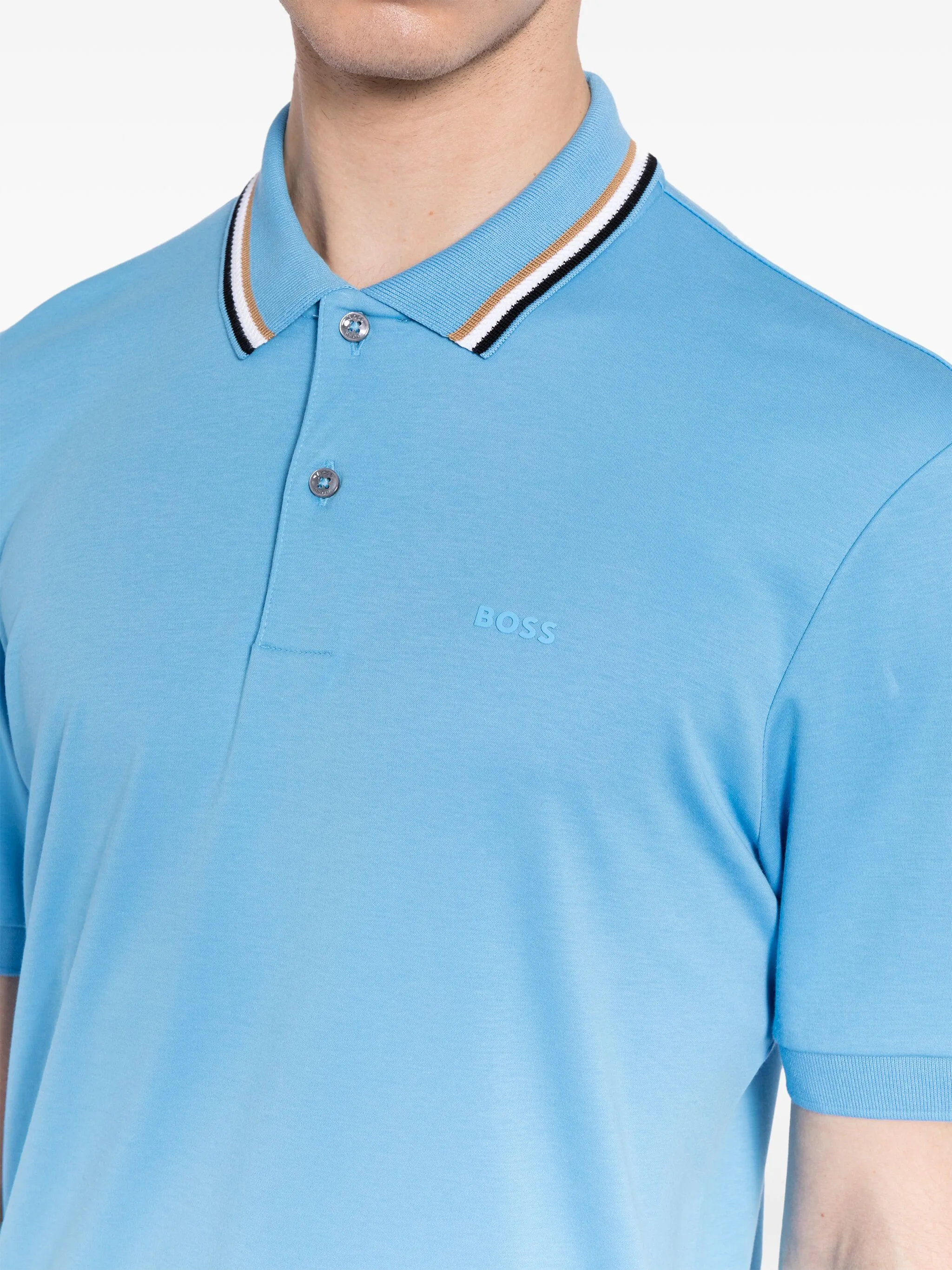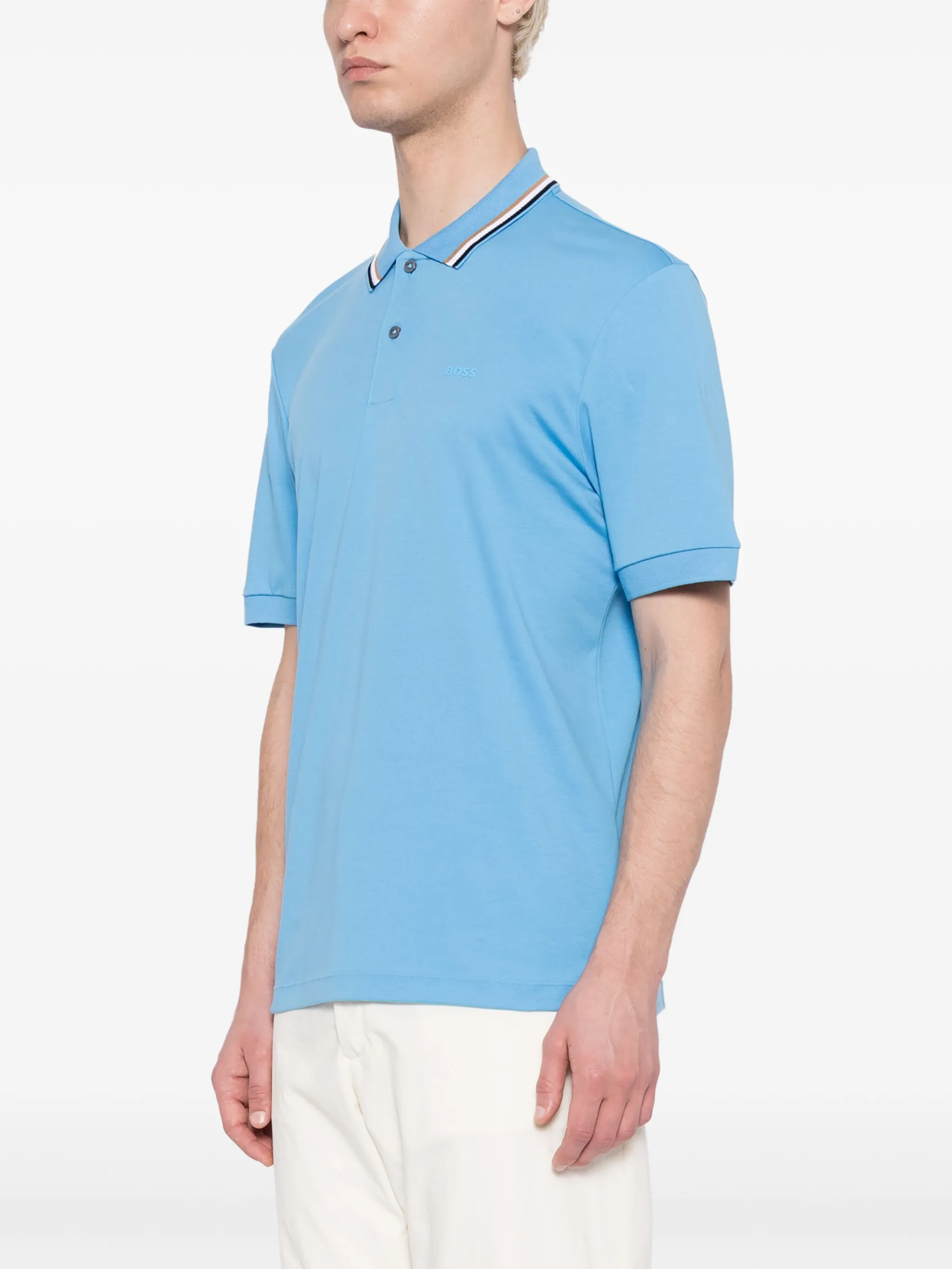 Голубой, хлопок, принт с логотипом на груди, полоски, воротник поло, планка на пуговицах спереди, короткие рукава и прямой подол.