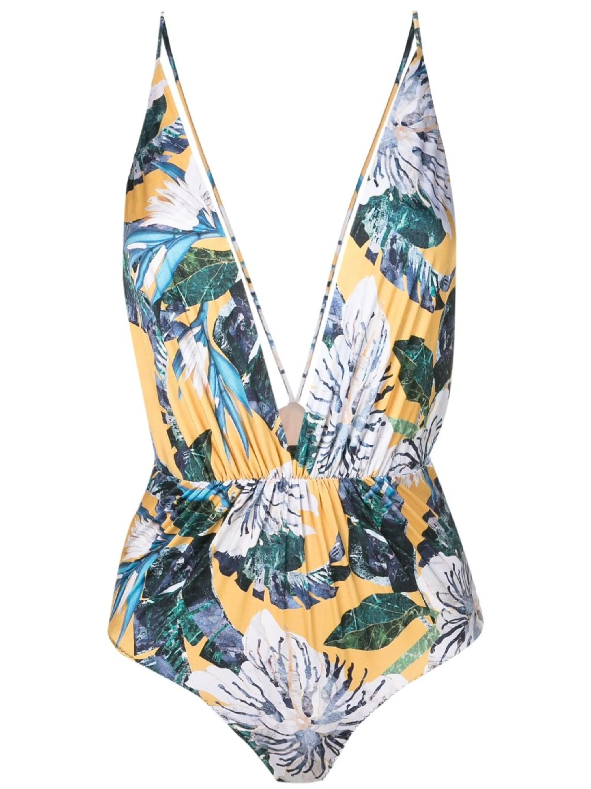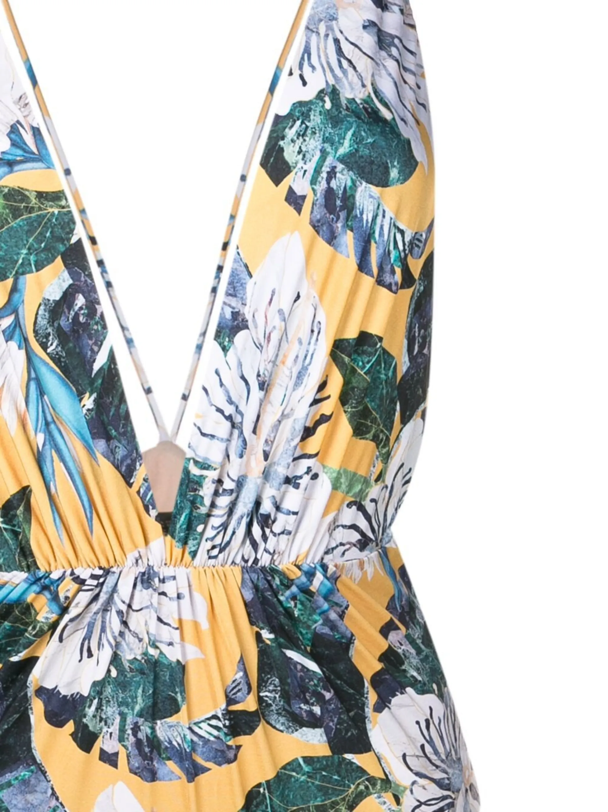 Желтый, синий, сплошной цветочный принт, глубокий V-образный вырез и без рукавов.