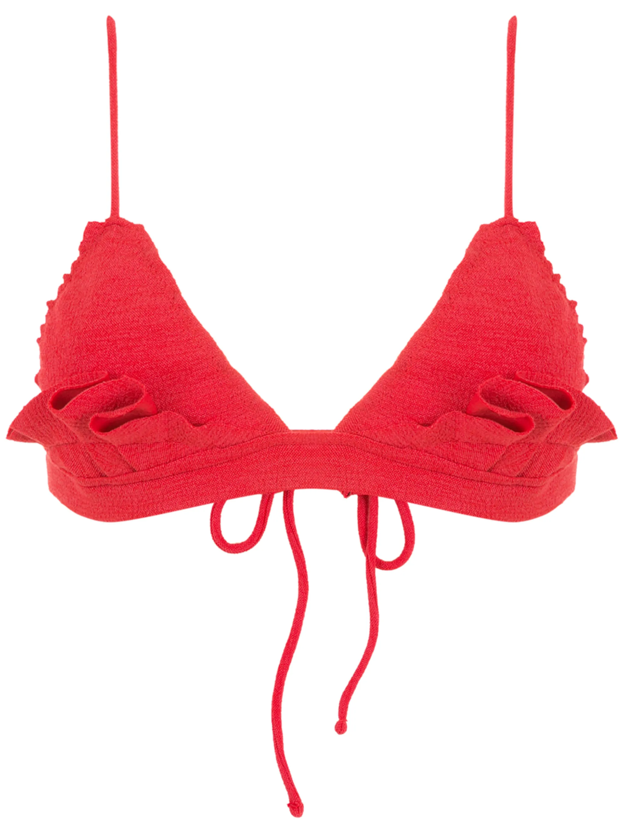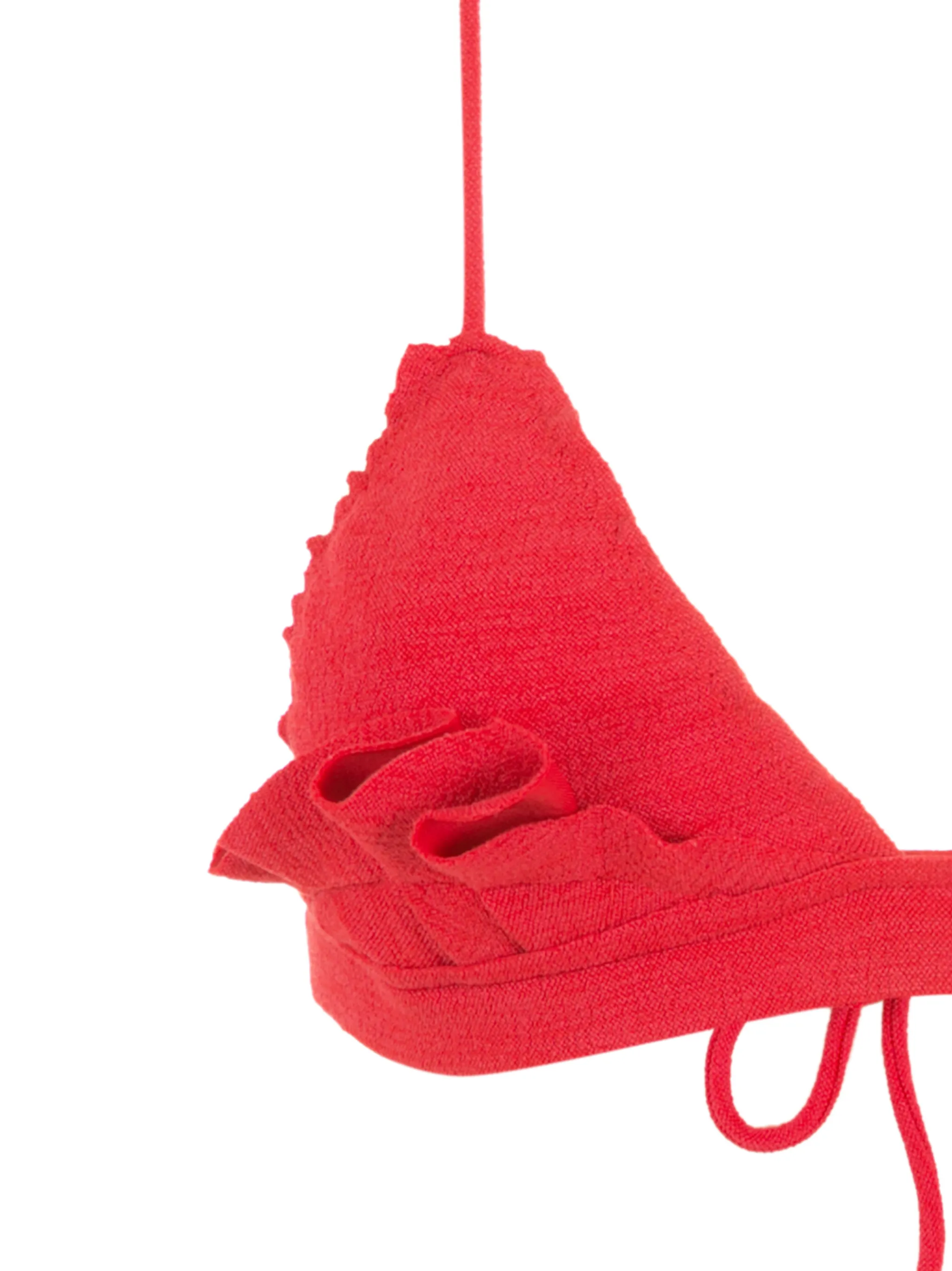 Вставки с оборками, треугольная чашка, тонкие бретели и застежка на завязке сзади. Цвет: красный.