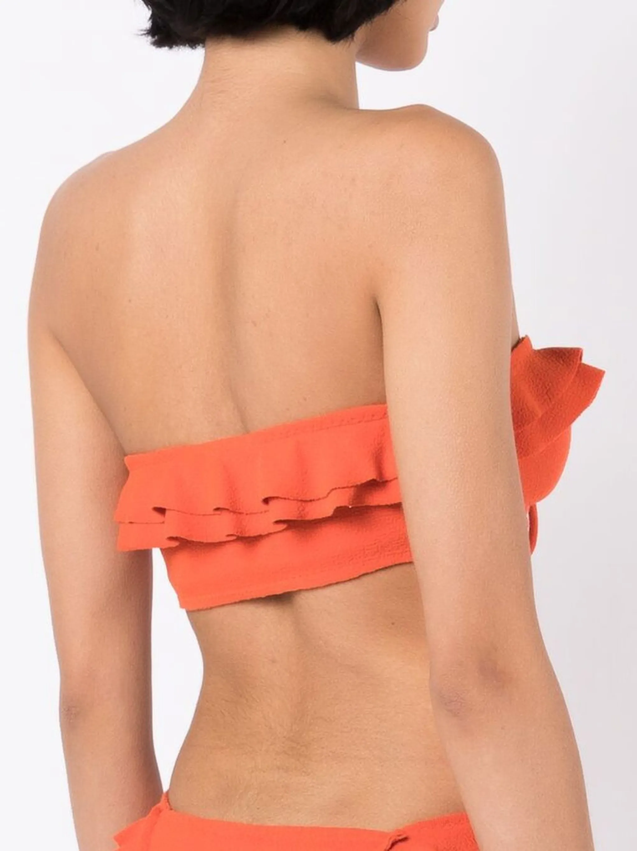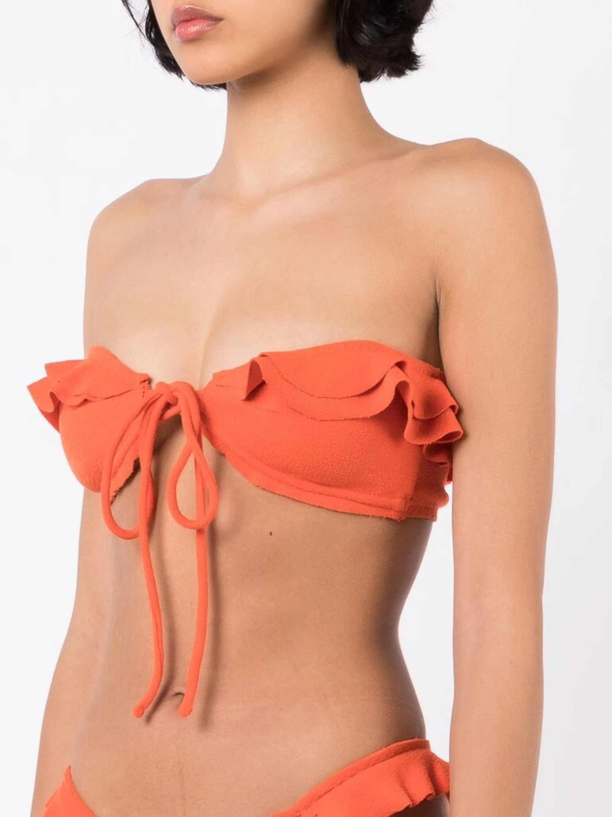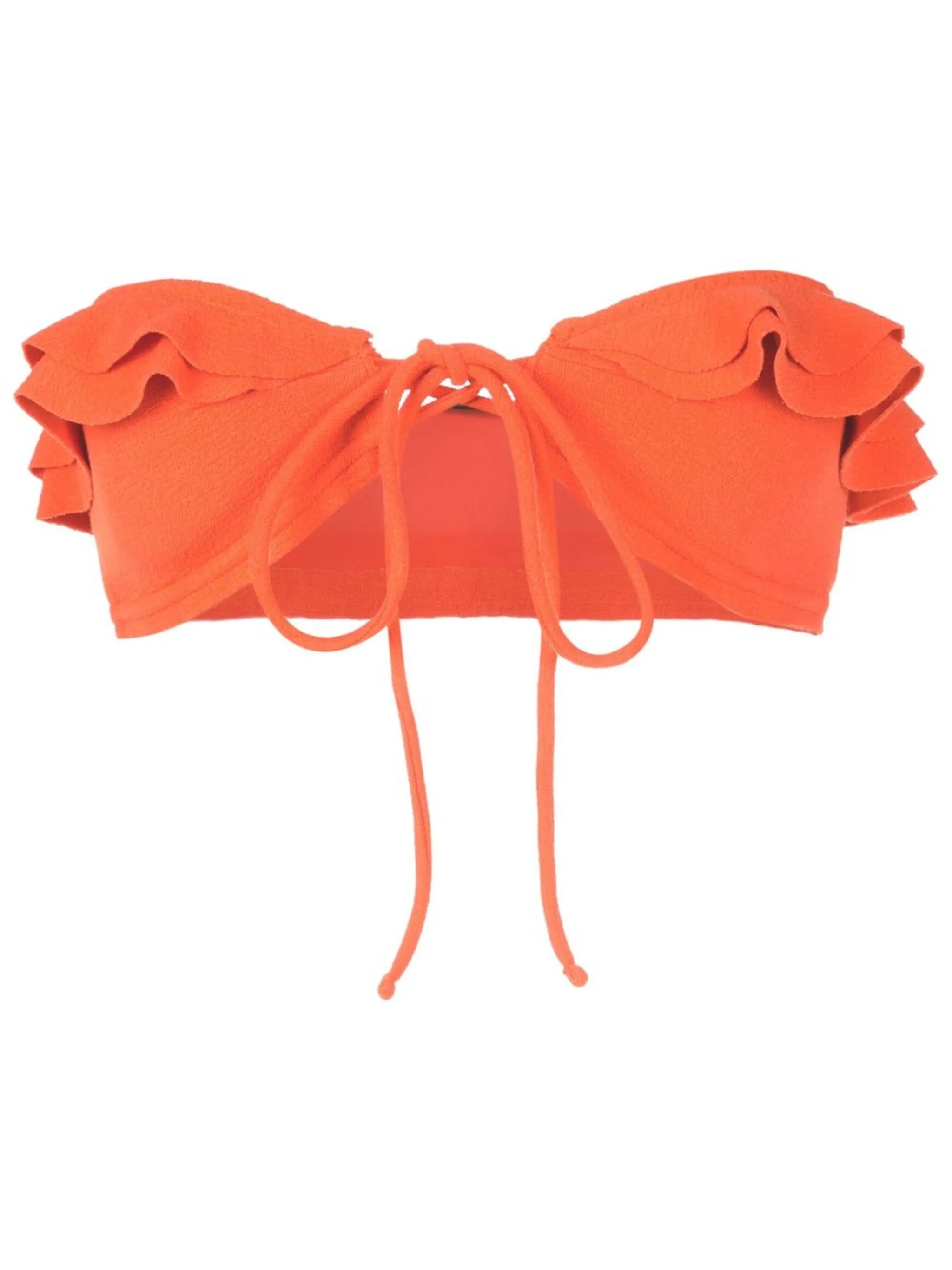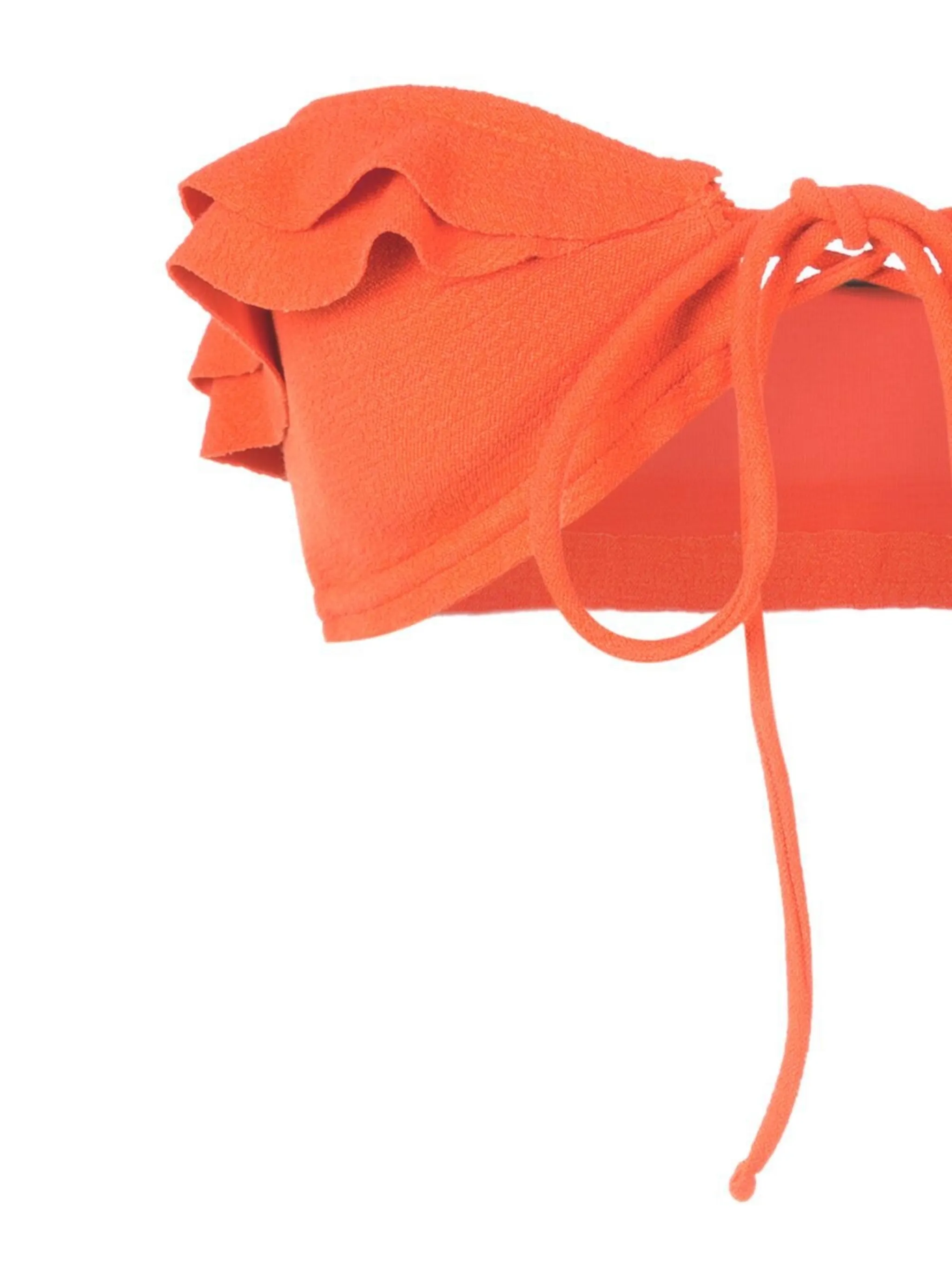 Мандариново-оранжевый, эластичный материал, модель бандо, завязки спереди, края с фестонами и присборенный воротник.