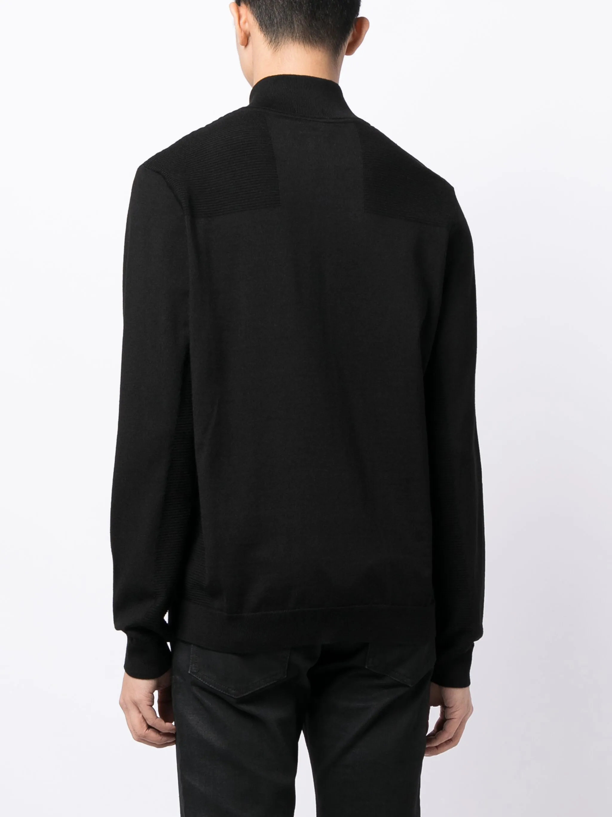 Трикотажный материал, принт с логотипом на груди, детали в рубчик, высокий воротник, застежка на молнии спереди и длинные рукава.