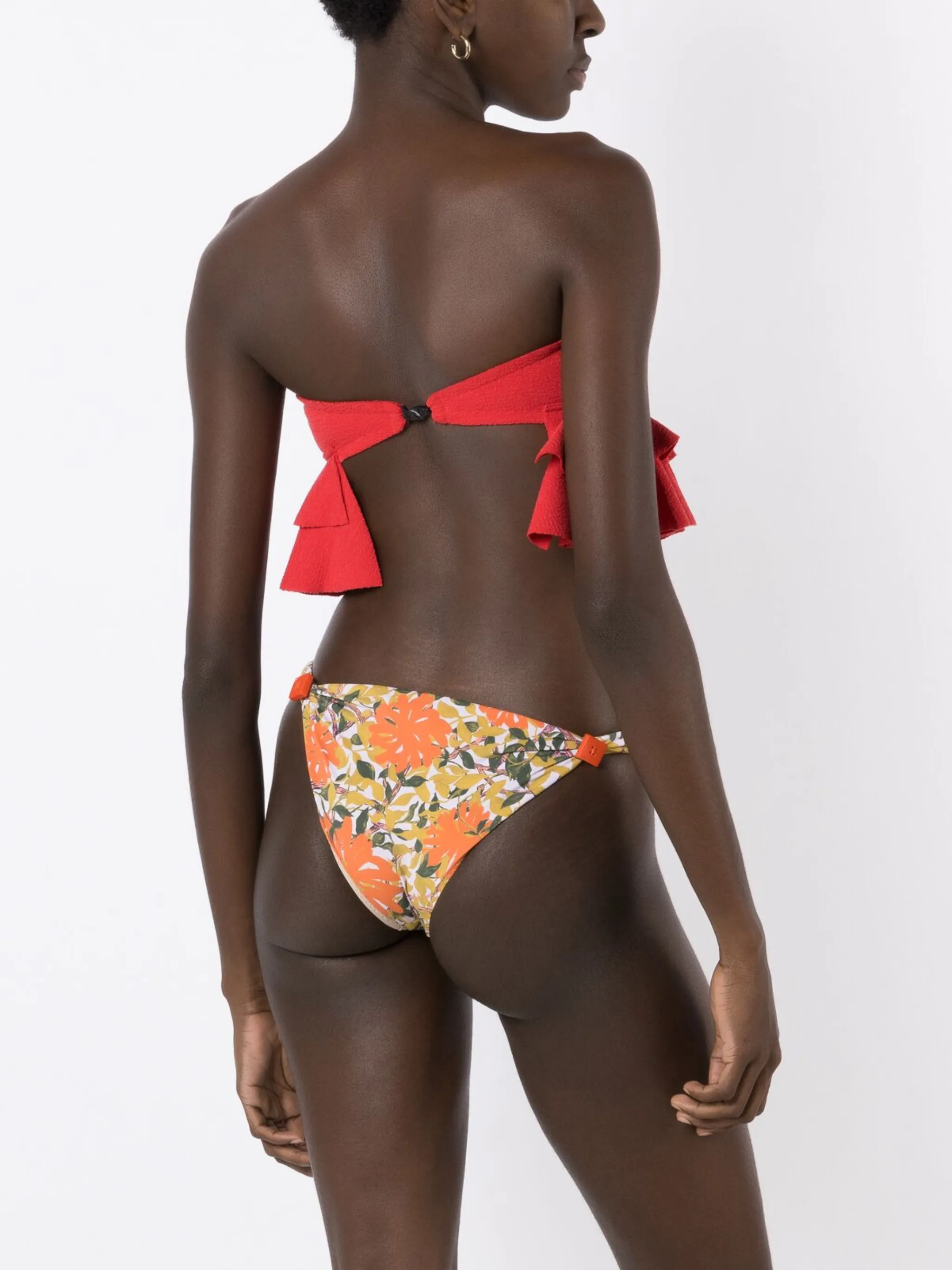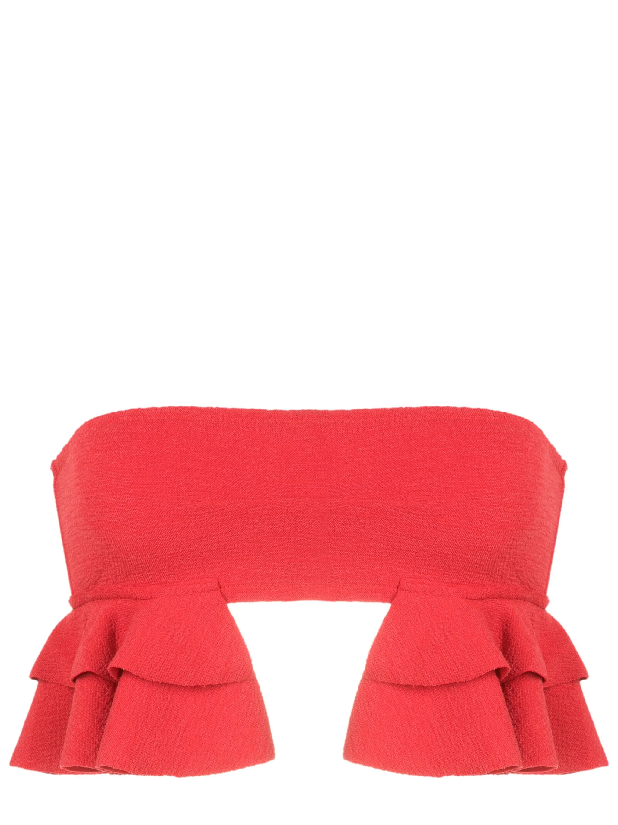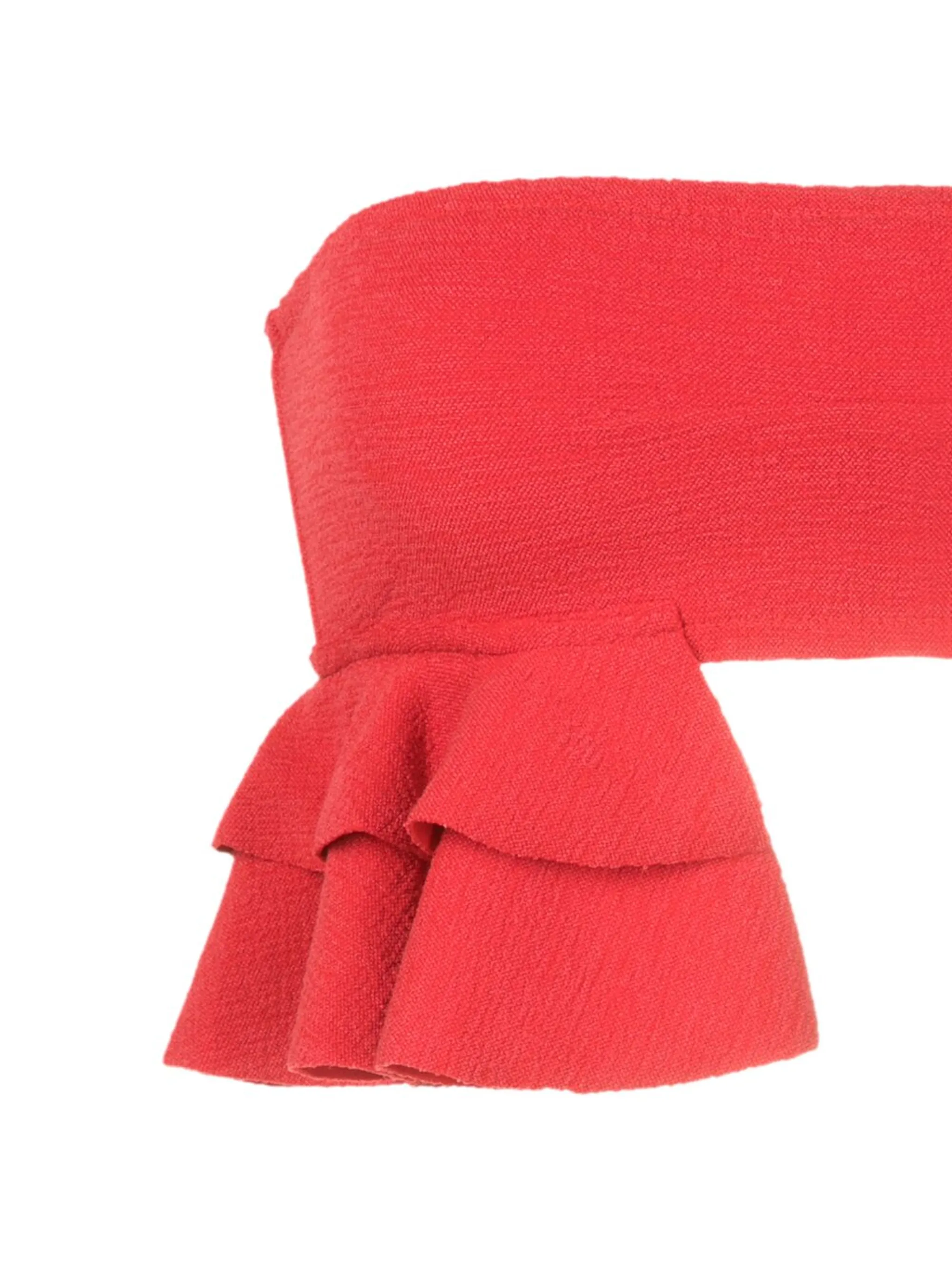 Красный, эластичный материал, модель бандо, вставки с оборками, застежка на крючок сзади и без бретелей.