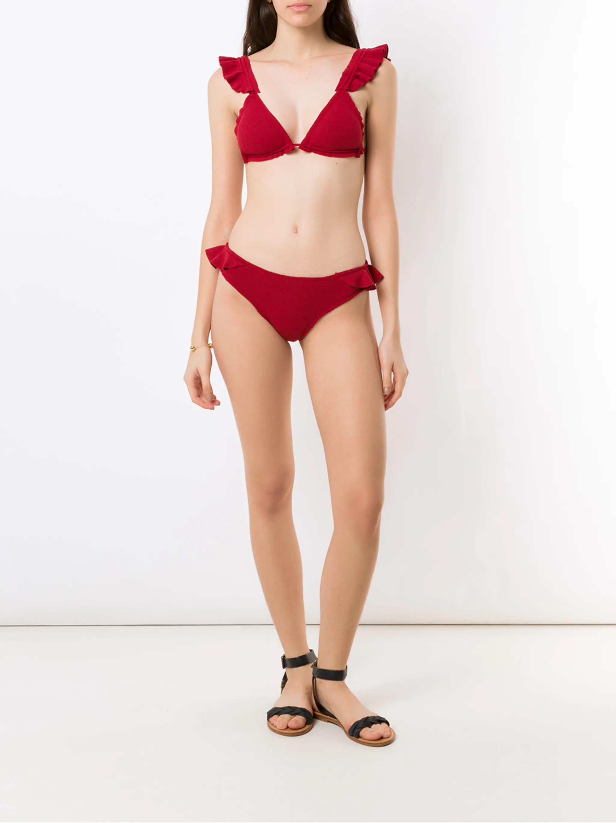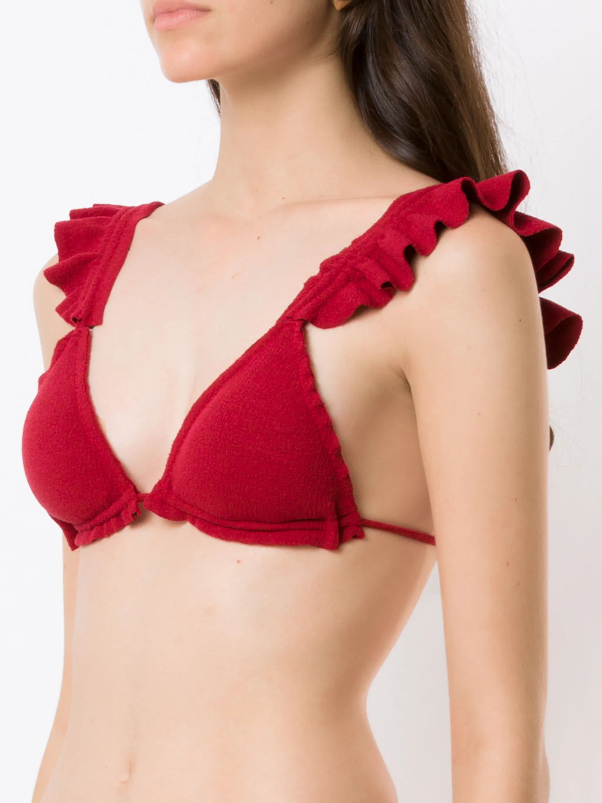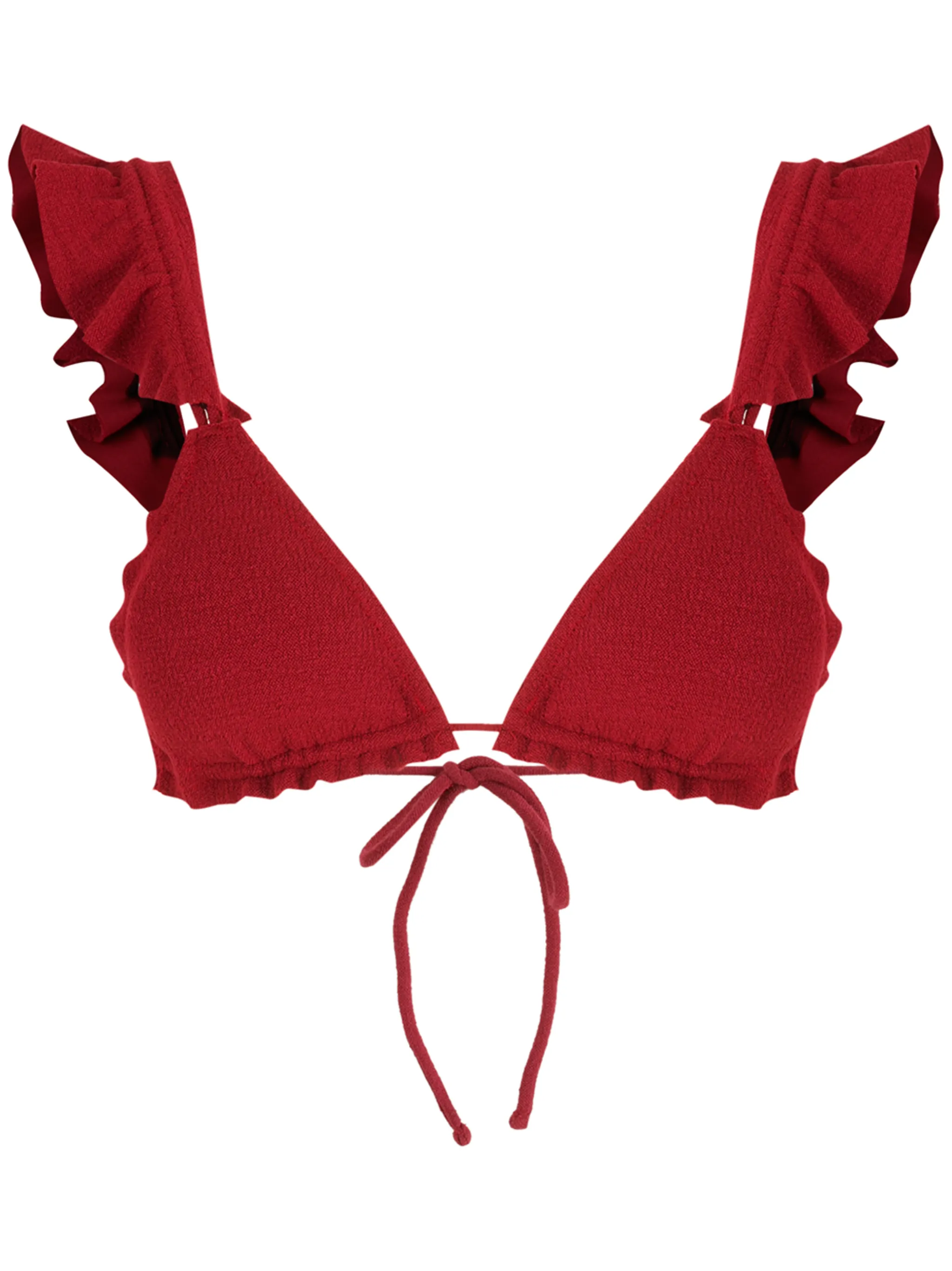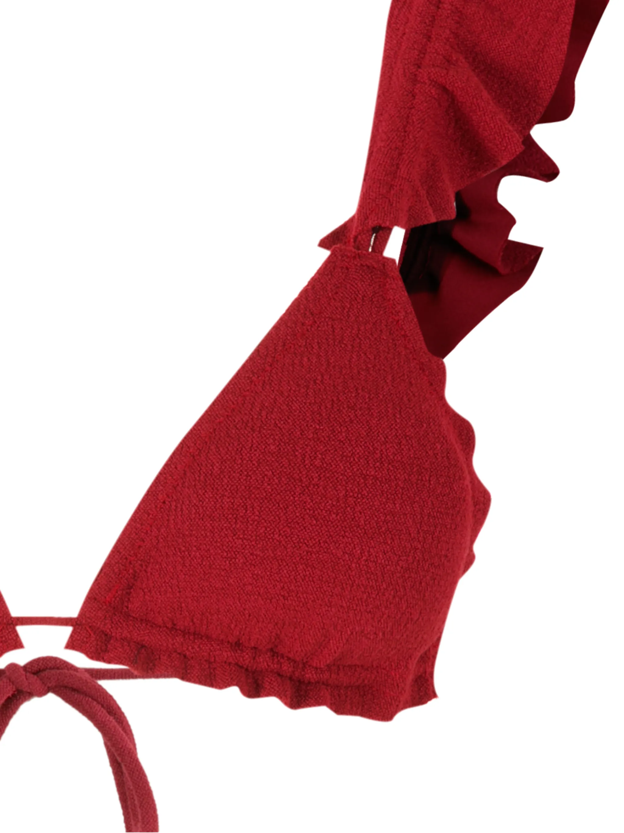 Треугольная чашка, вставки с оборками, застежка на завязке сзади и фактурная отделка.