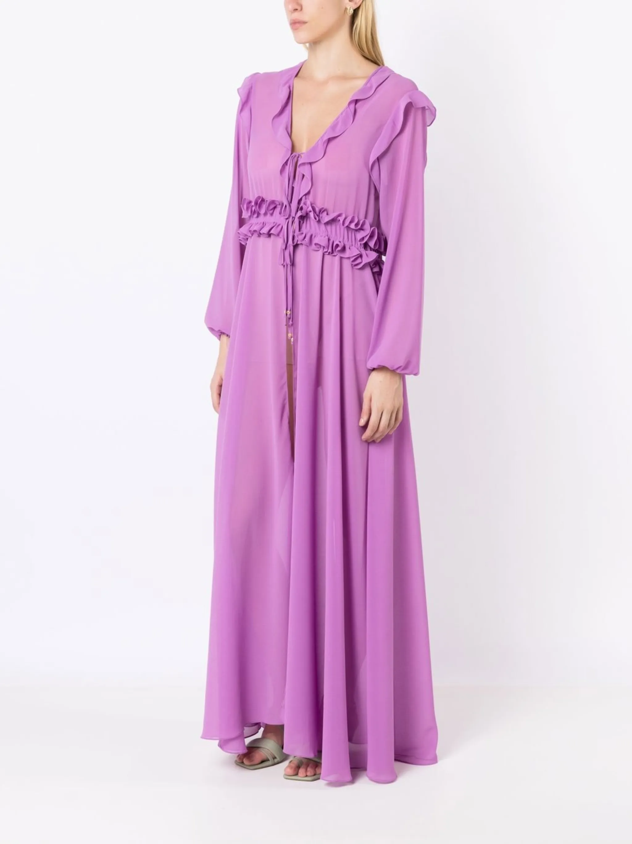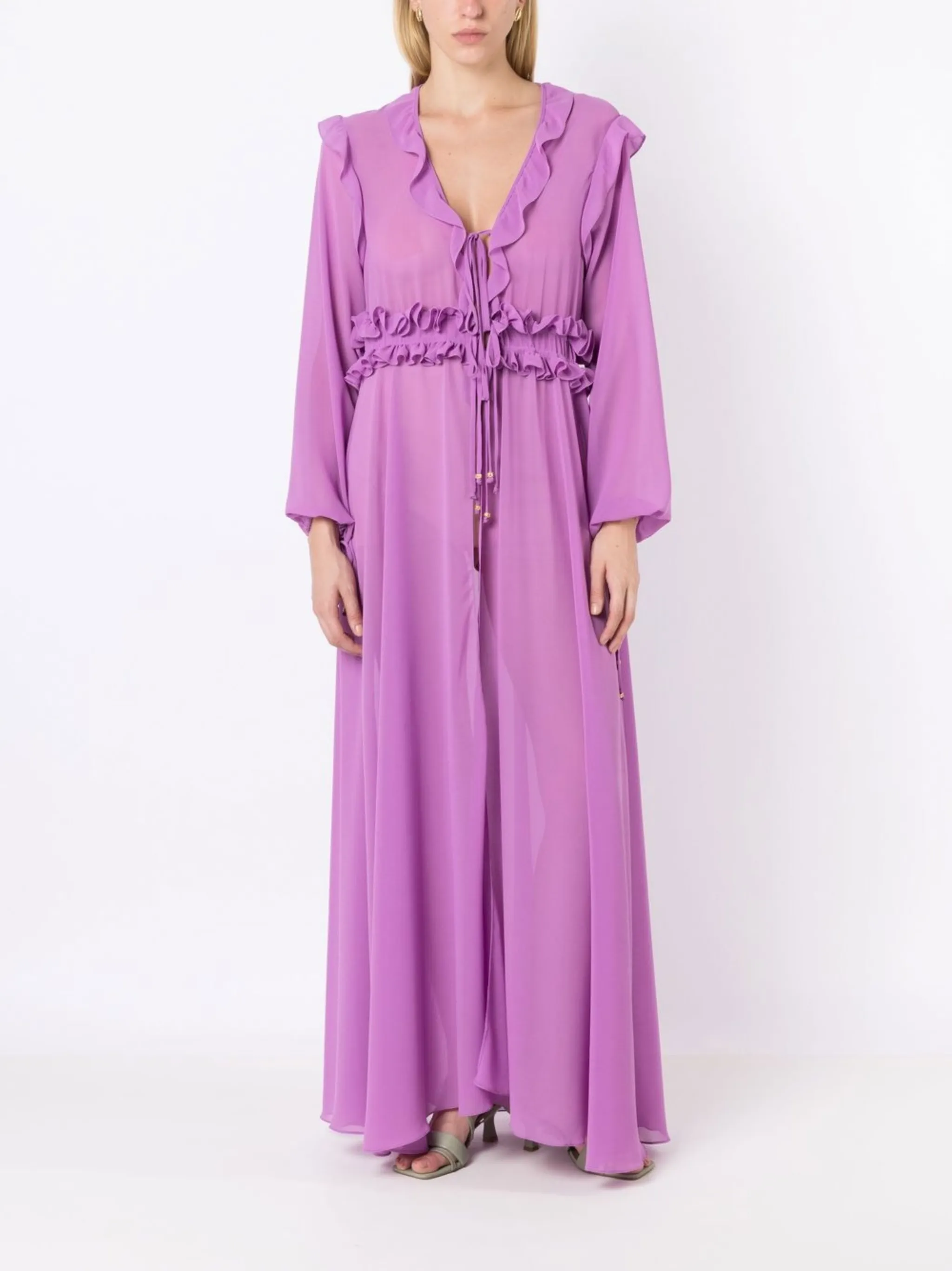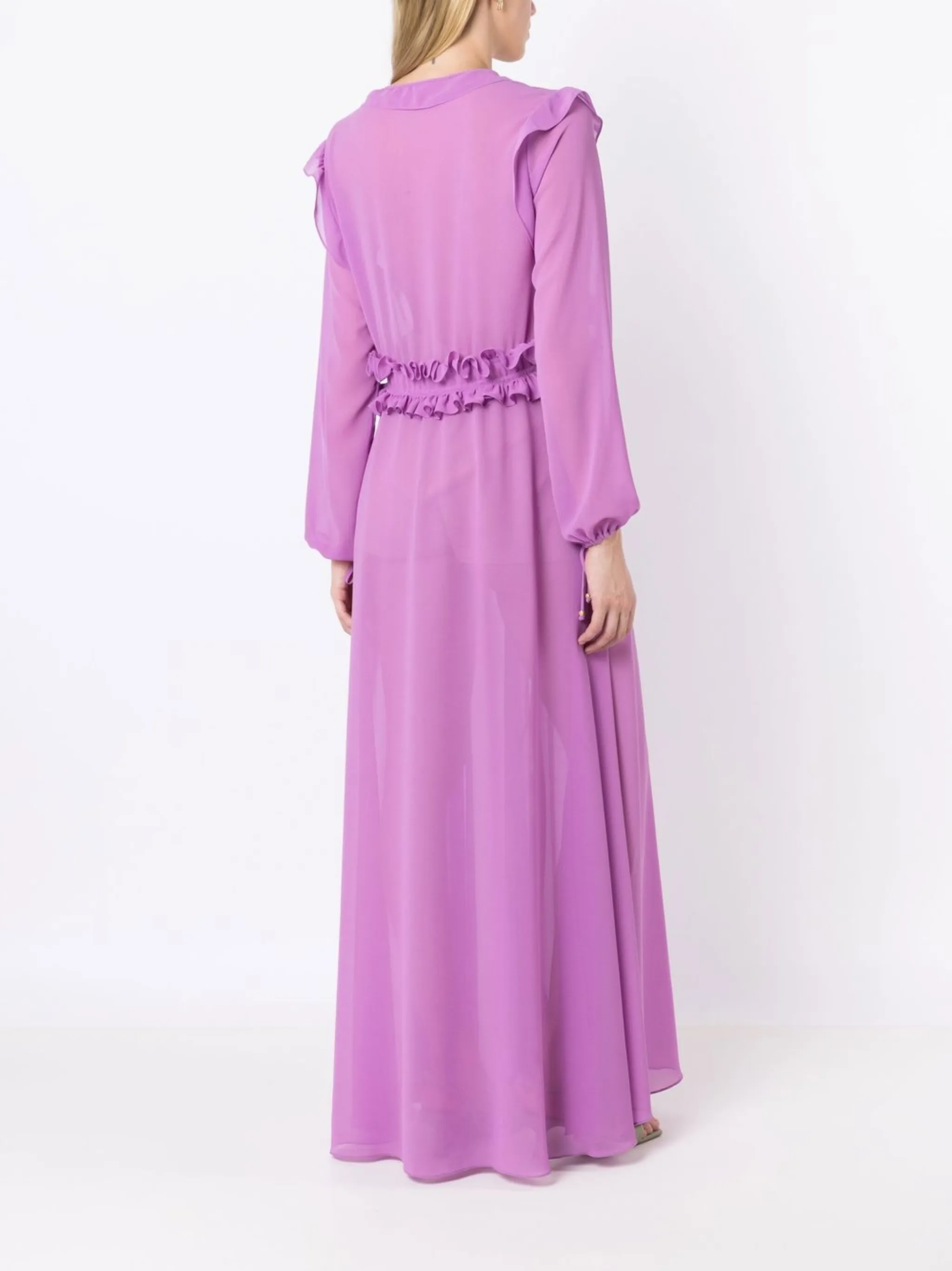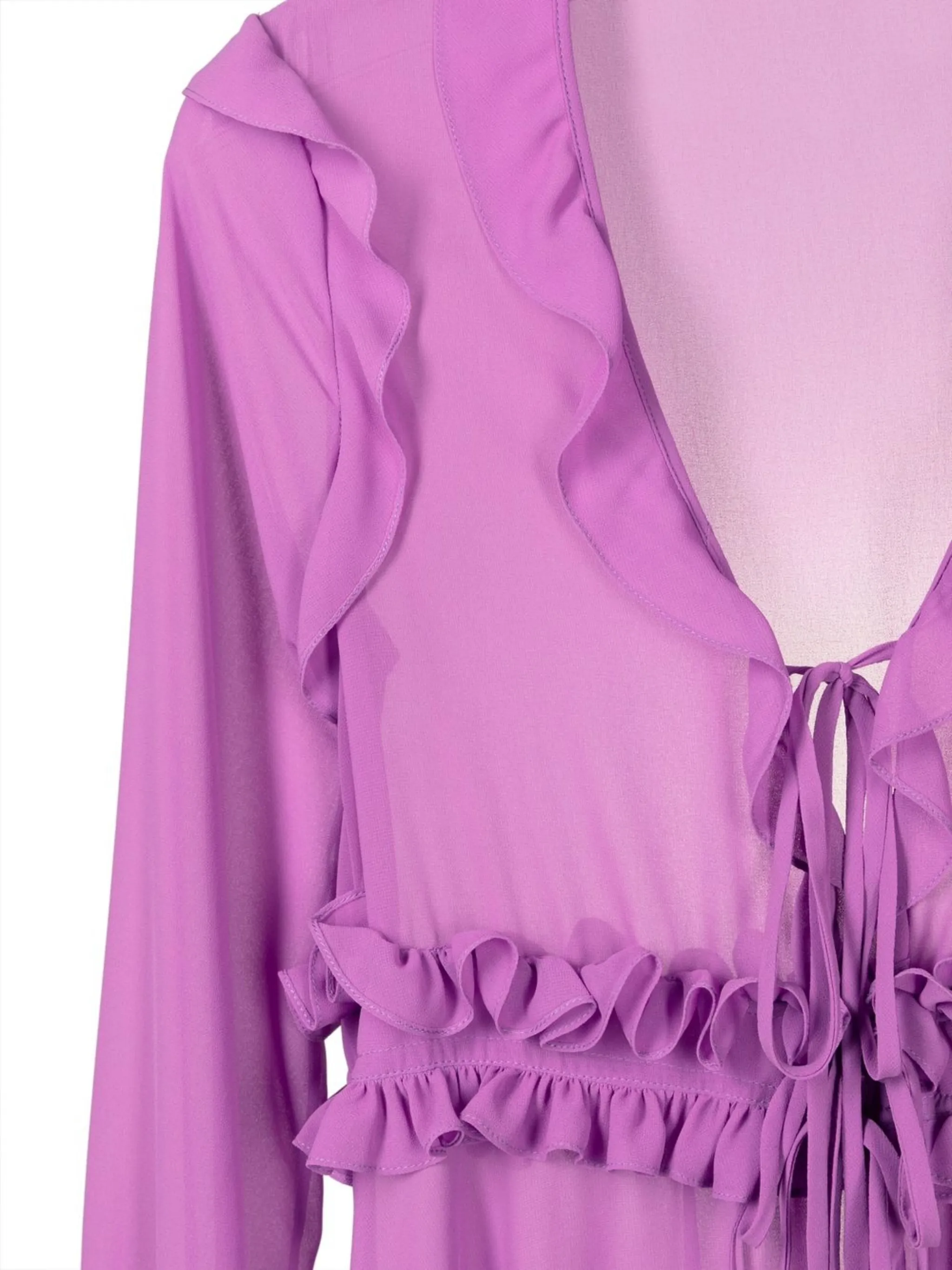 Лавандовый, шифон, вставки с оборками, V-образный вырез, кулиска на талии, завязки спереди, длинные рукава, манжеты с завязками и длина макси.