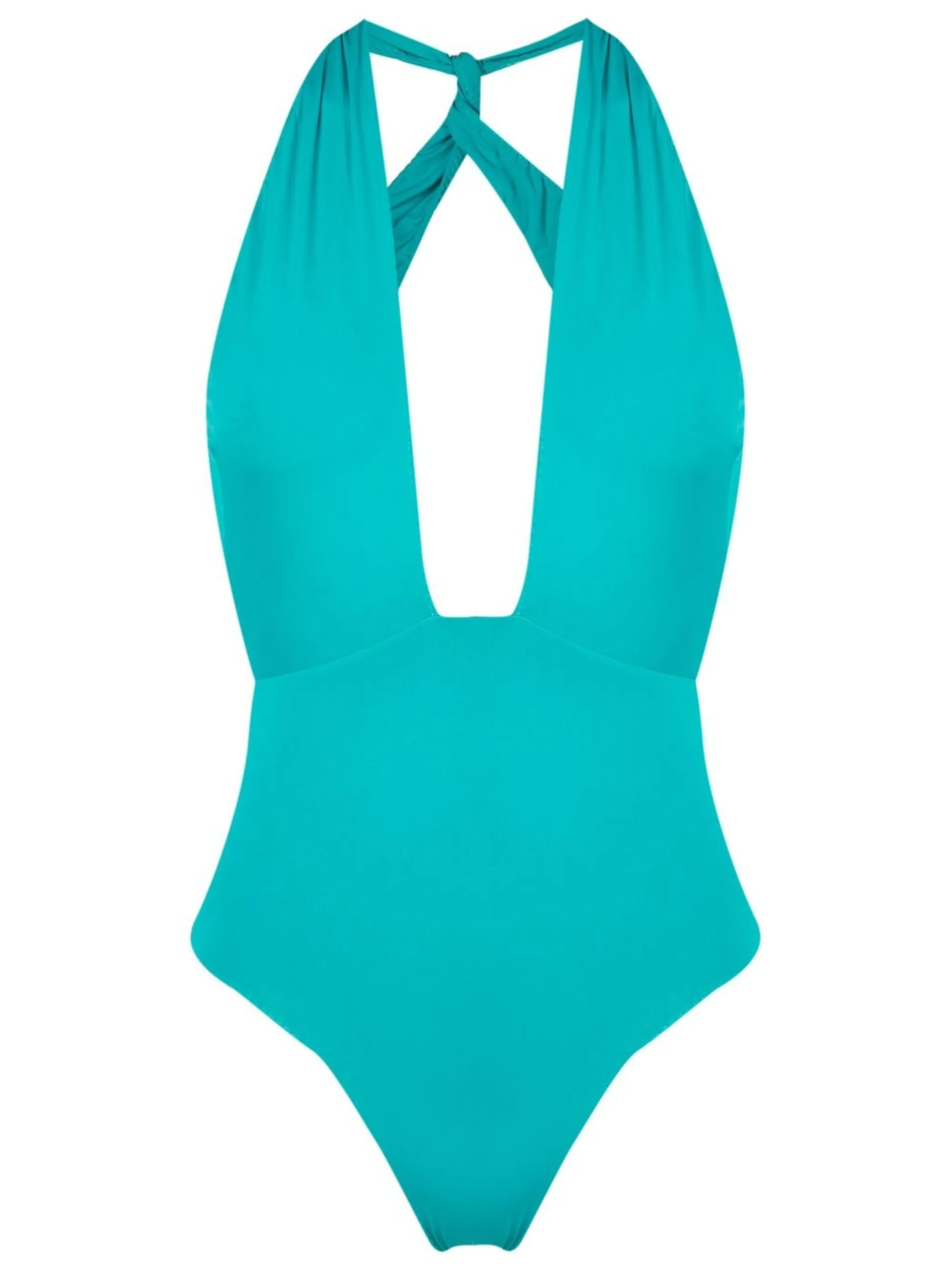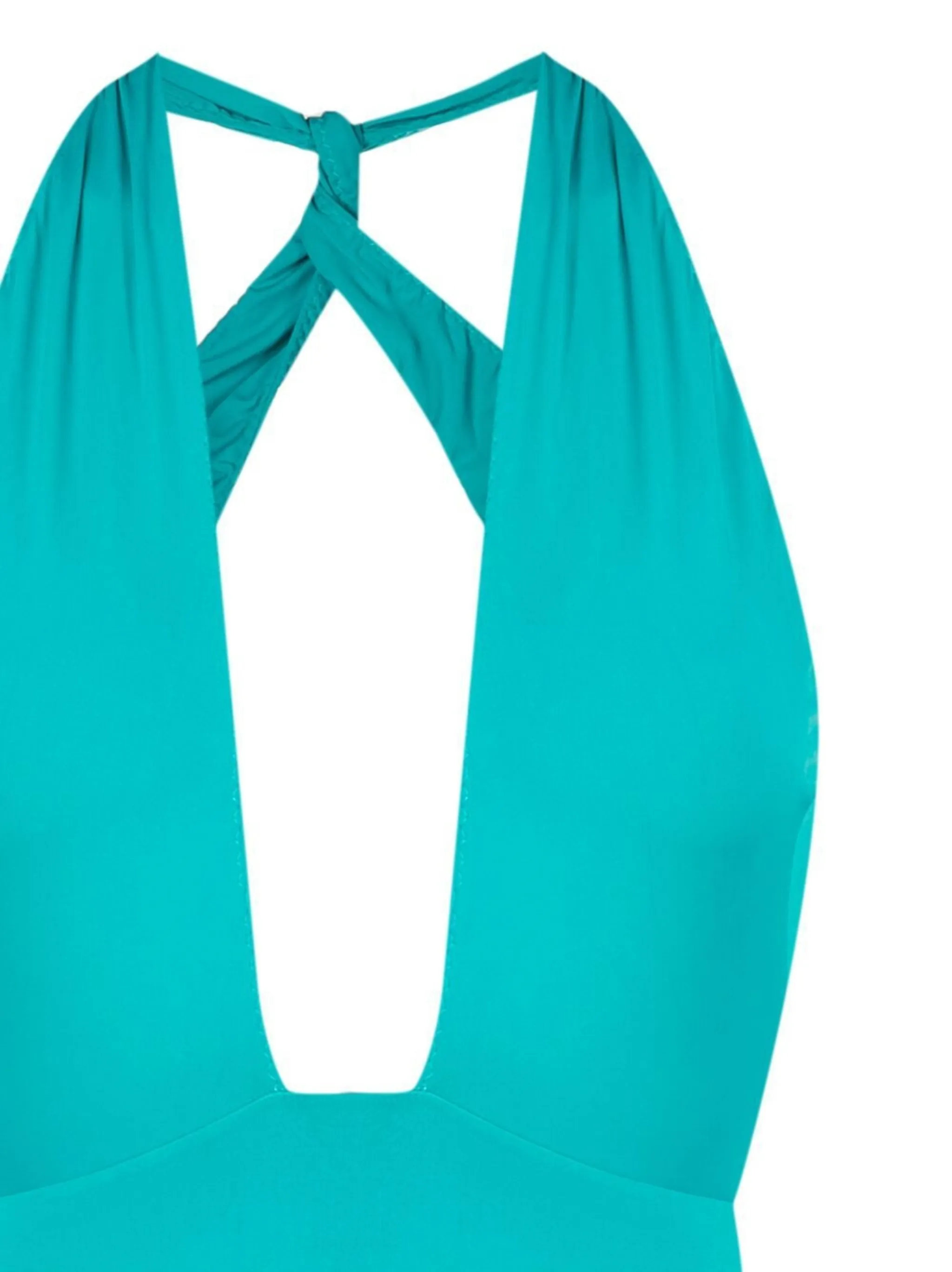 Бирюзовый, глубокий V-образный вырез и вырез-петля халтер.
