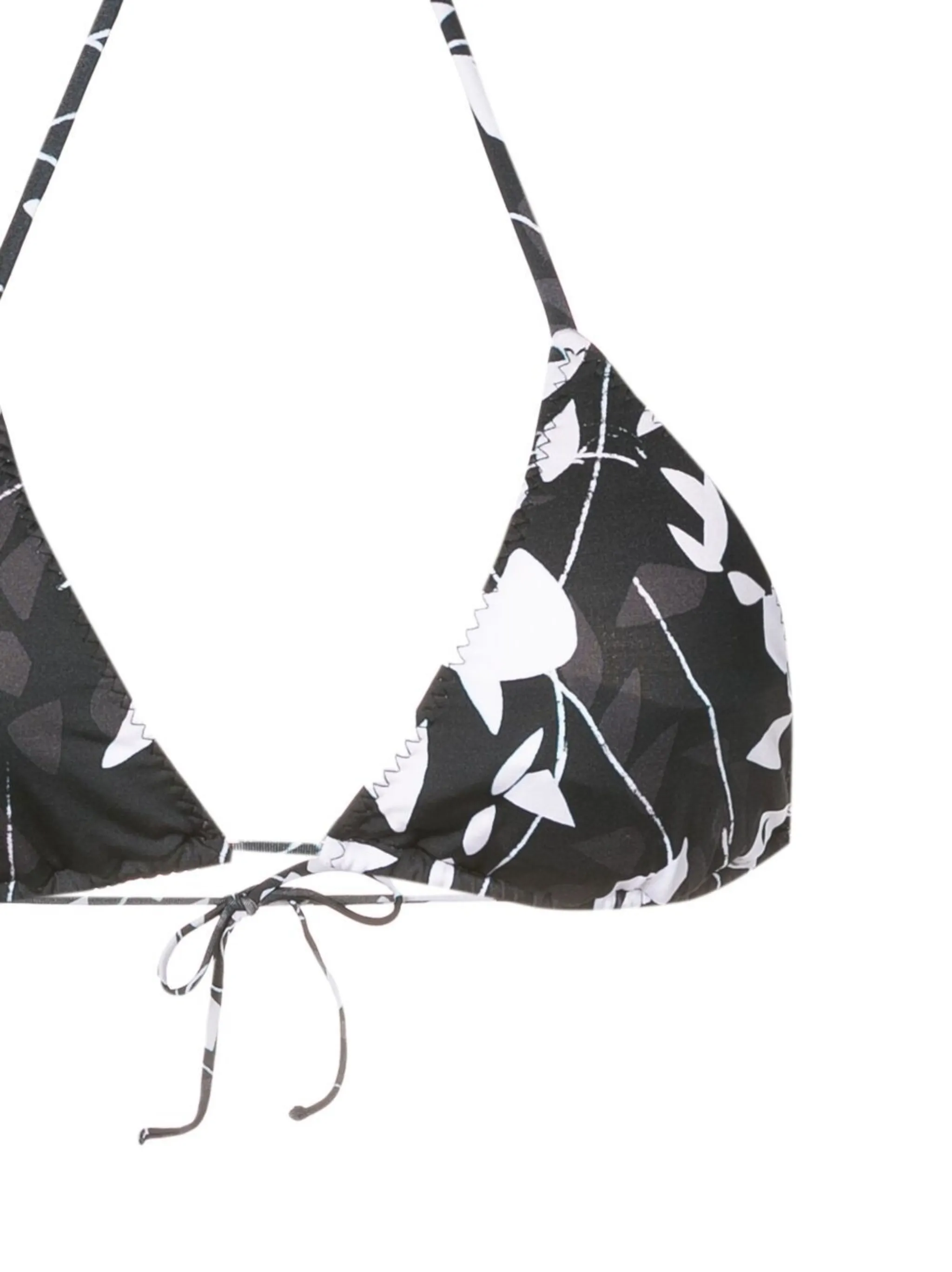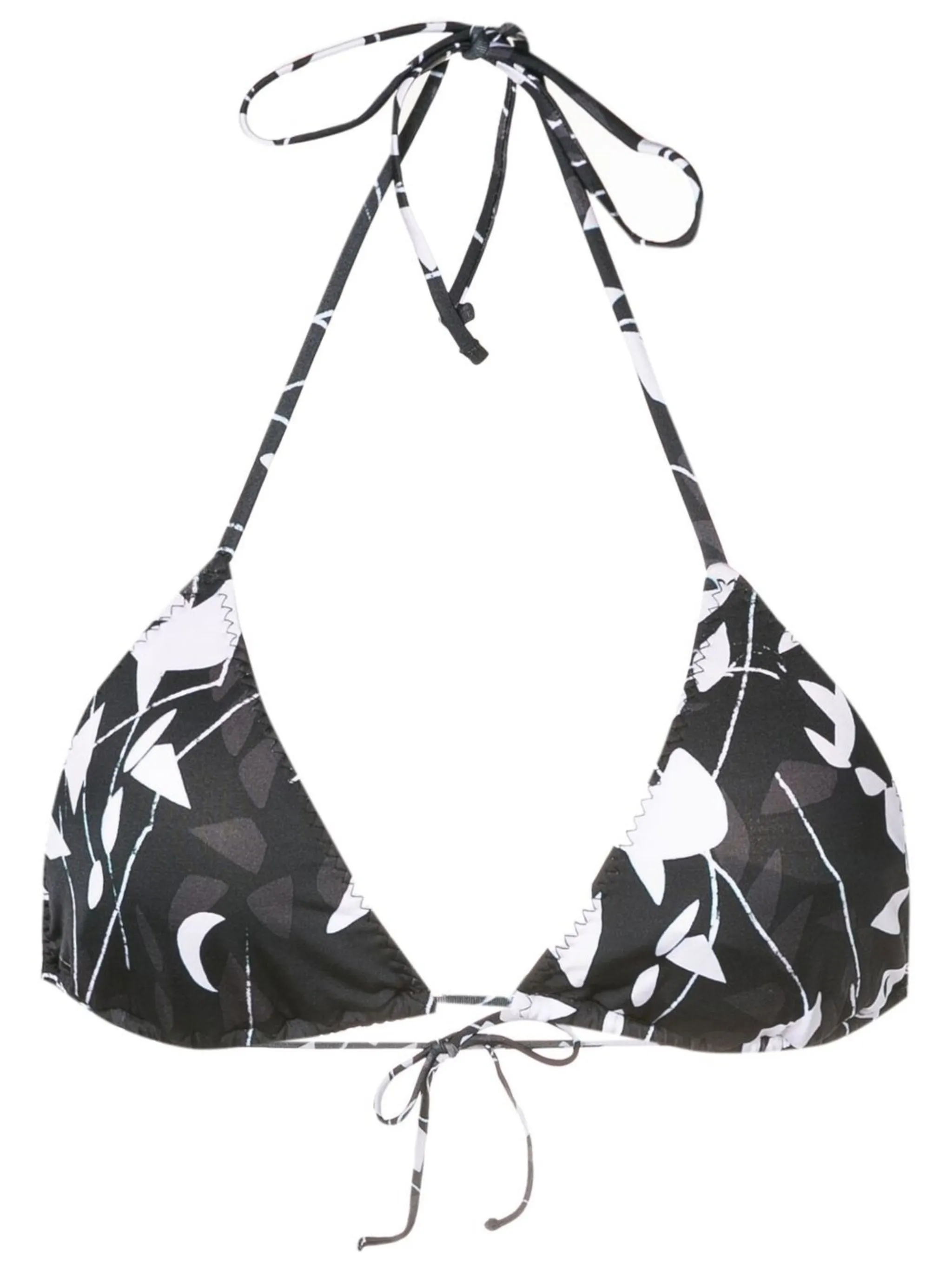Эластичная модель, абстрактный принт, треугольная чашка, завязки вокруг шеи и застежка на завязке сзади.