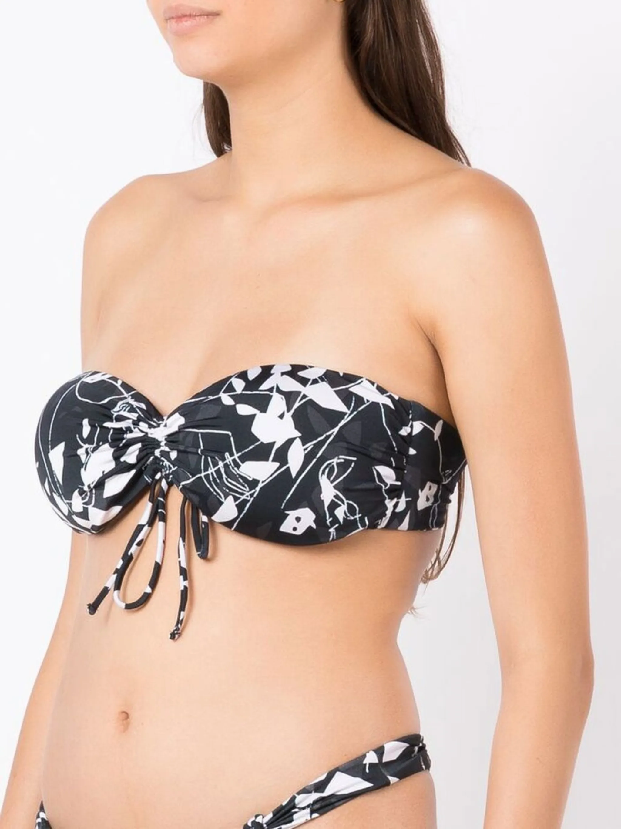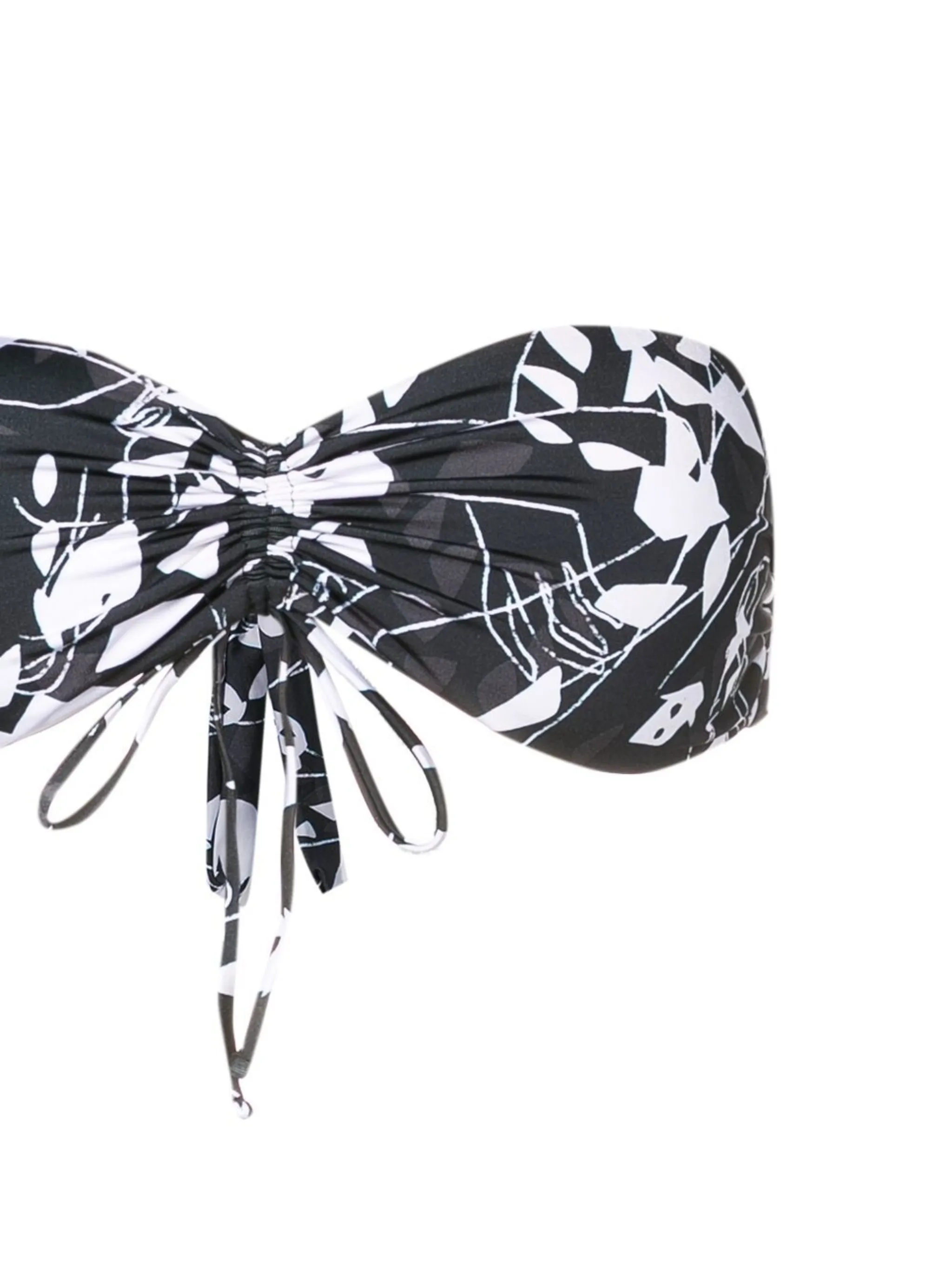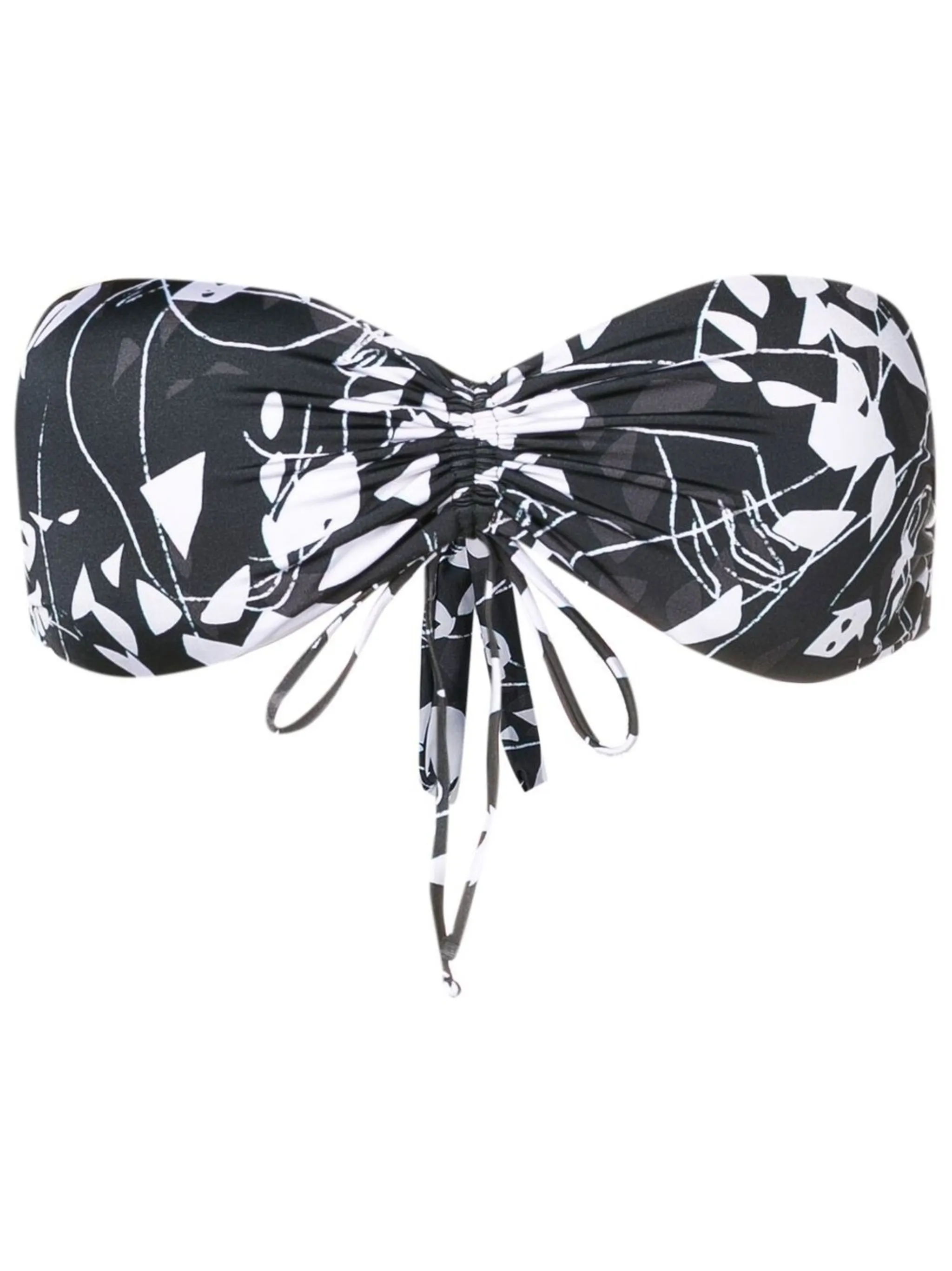 Черный, эластичная модель, абстрактный принт, модель бандо, завязки спереди и застежка на завязке сзади.