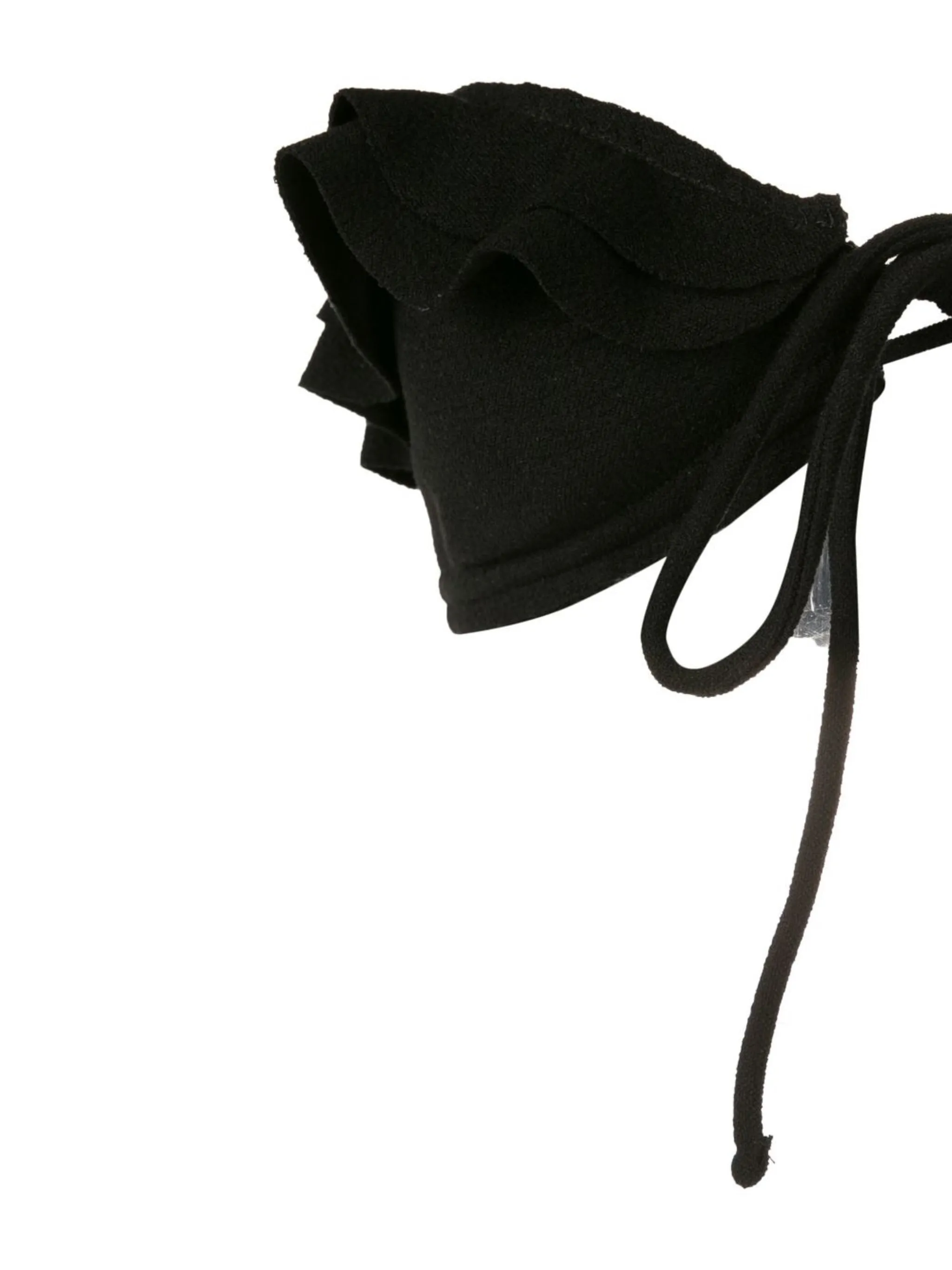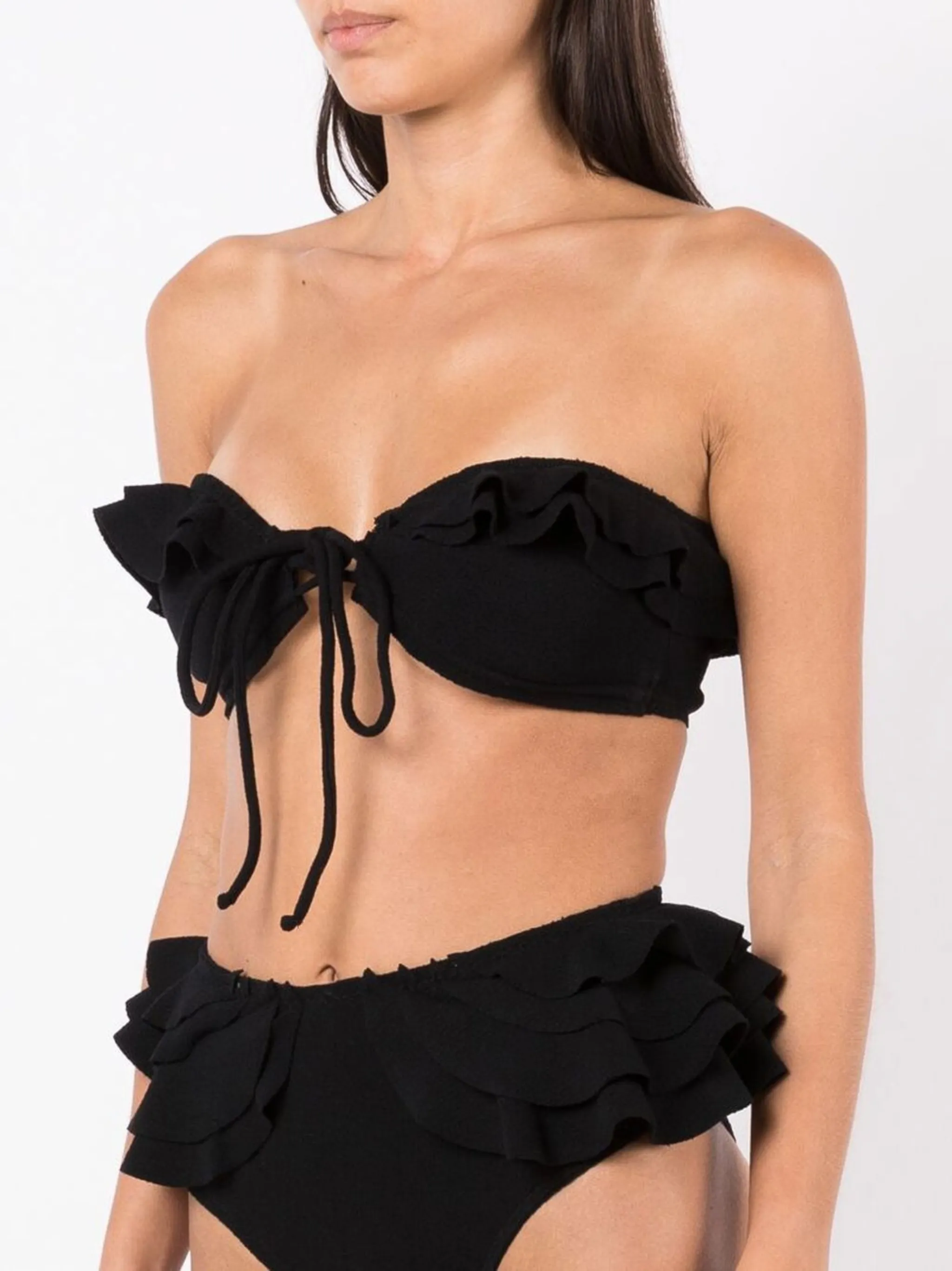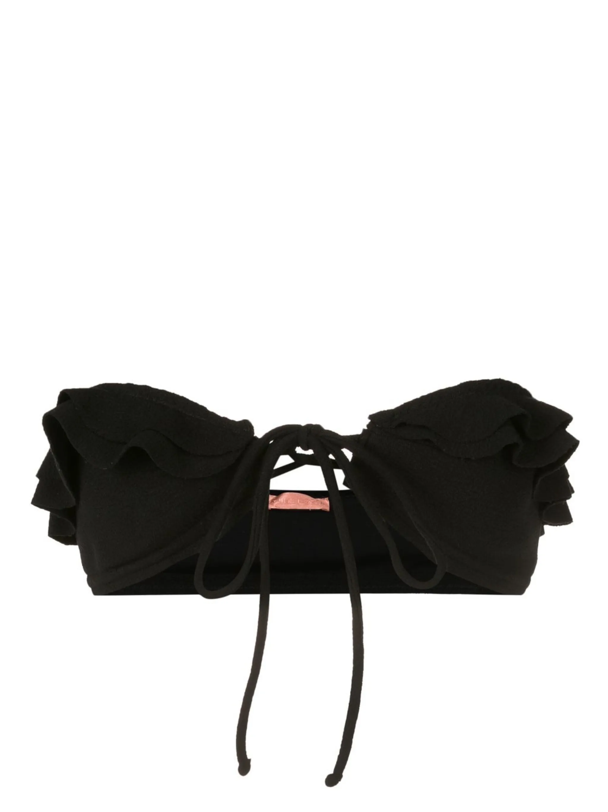 Черный, эластичный материал, модель бандо, завязки спереди, края с фестонами и присборенный воротник.