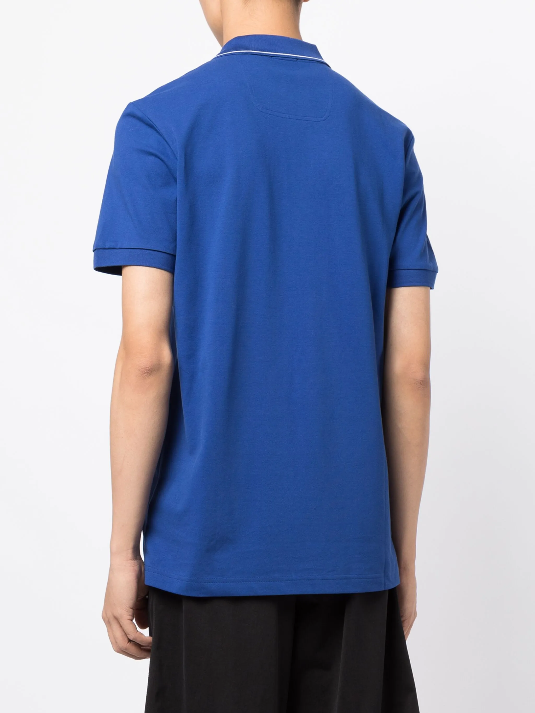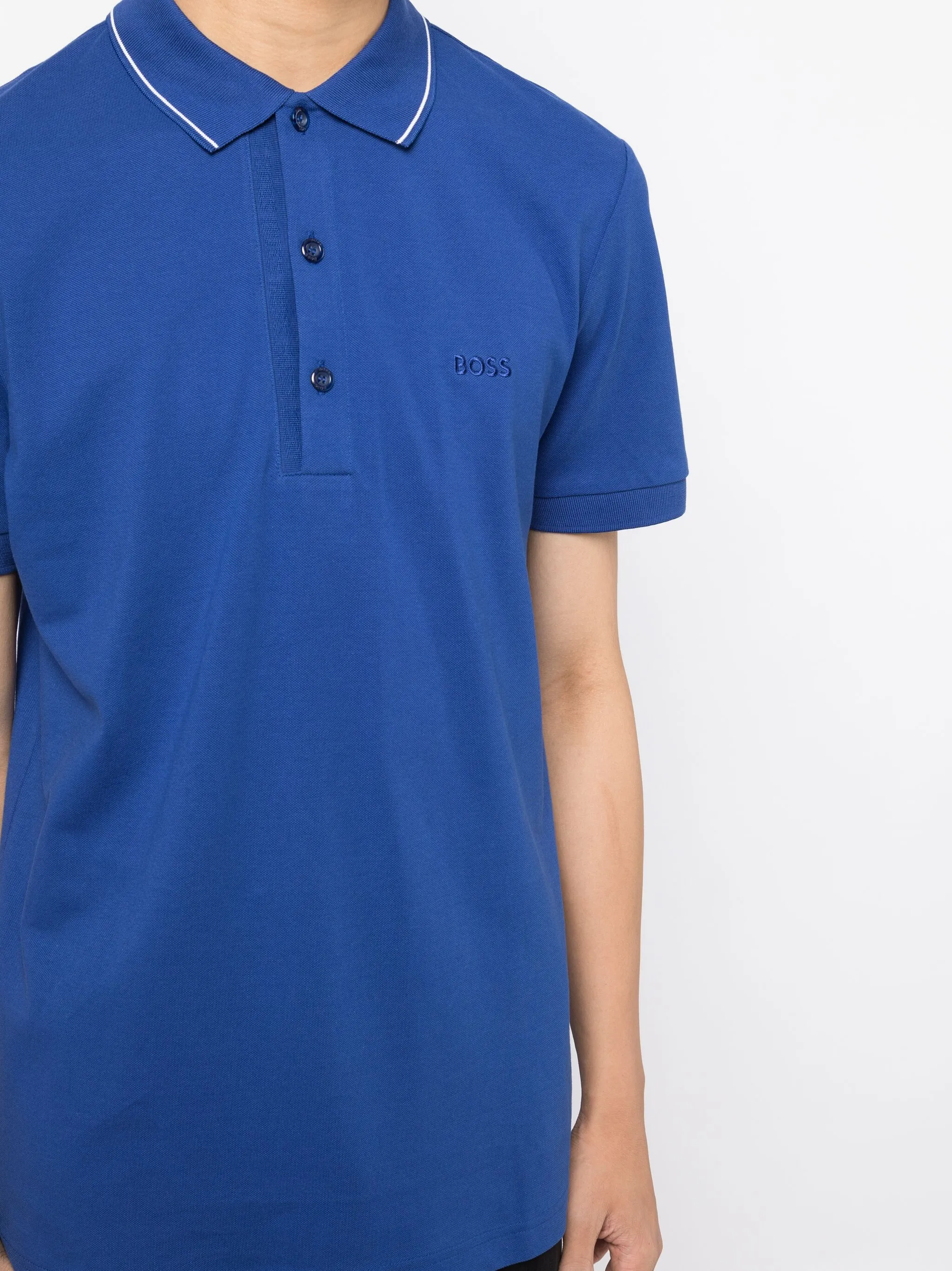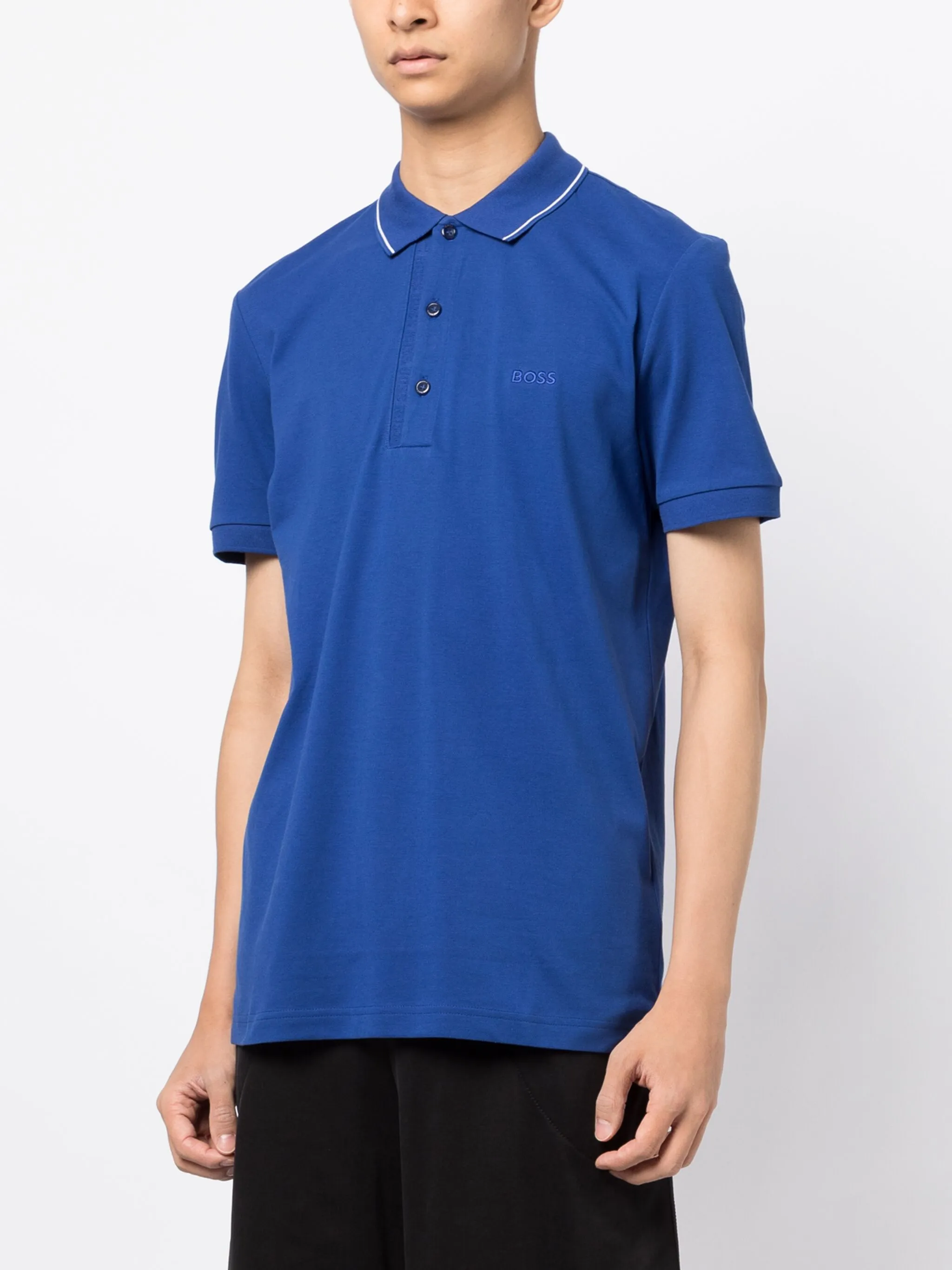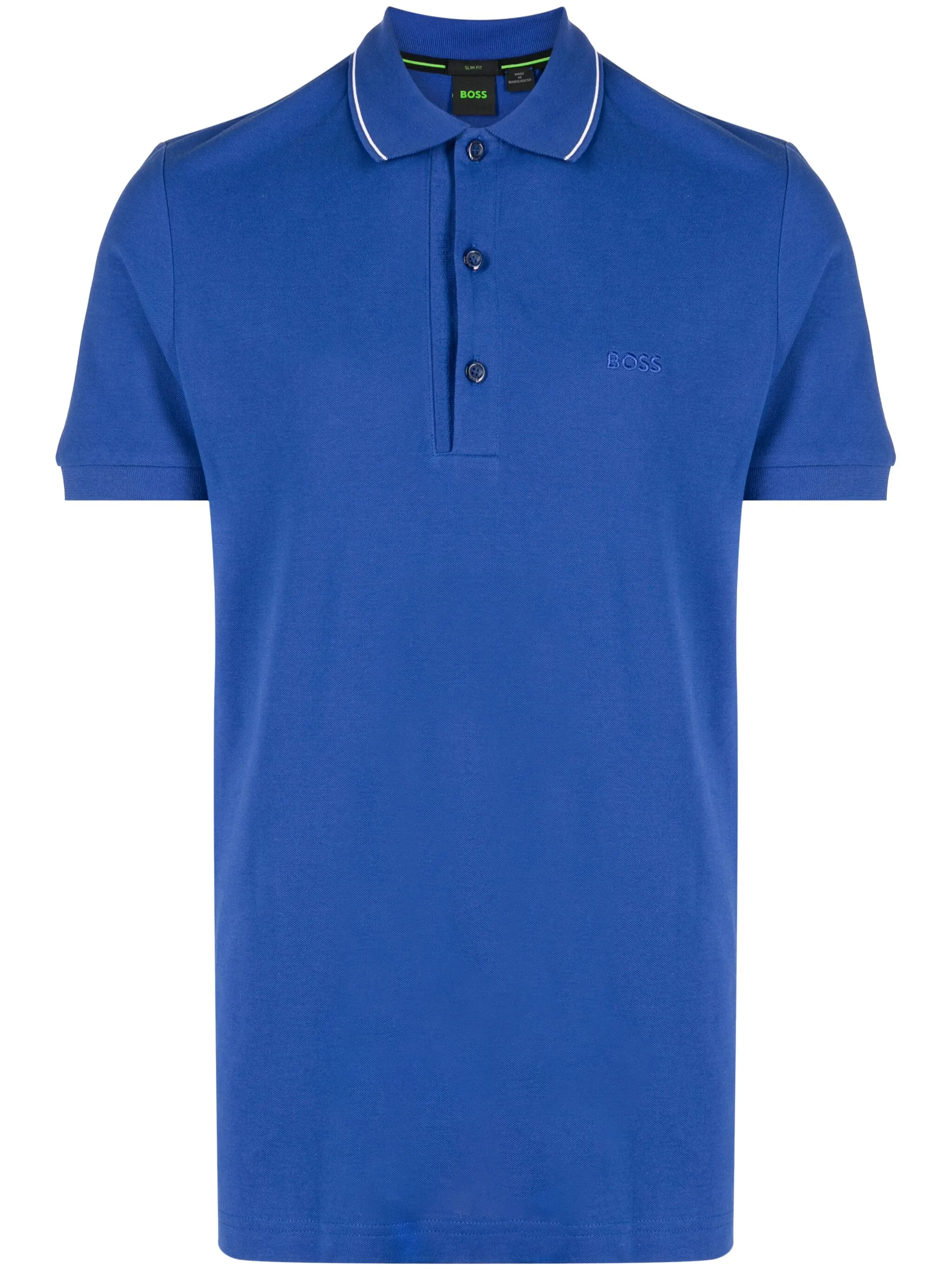 Синий, хлопок, вышитый логотип на груди, полоски, воротник поло, планка на пуговицах спереди, короткие рукава и прямой подол.