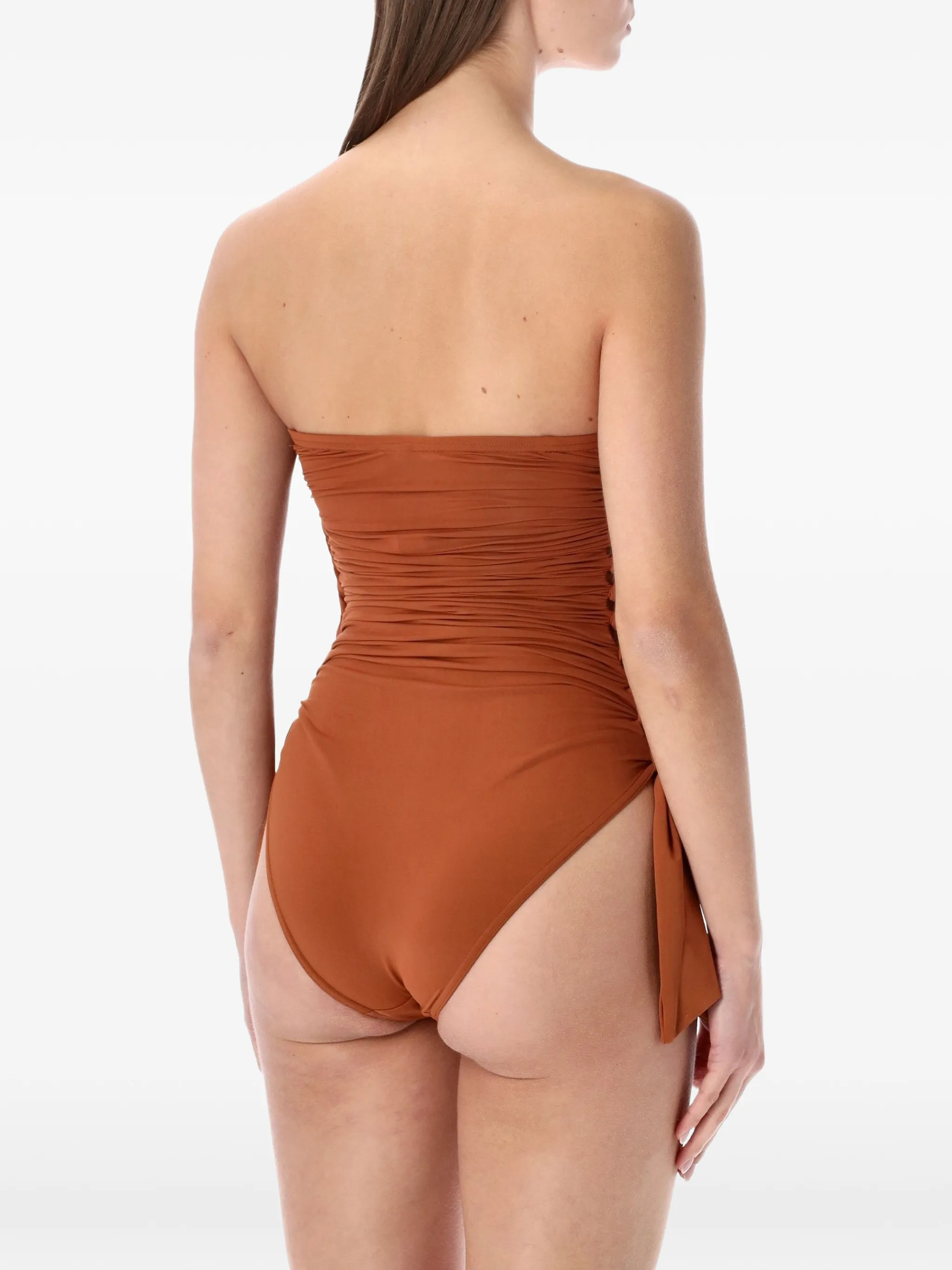 Медно-коричневые детали с рюшами, боковые завязки без бретелек, детали узлов Будьте внимательны, примеряя купальники поверх собственной одежды.