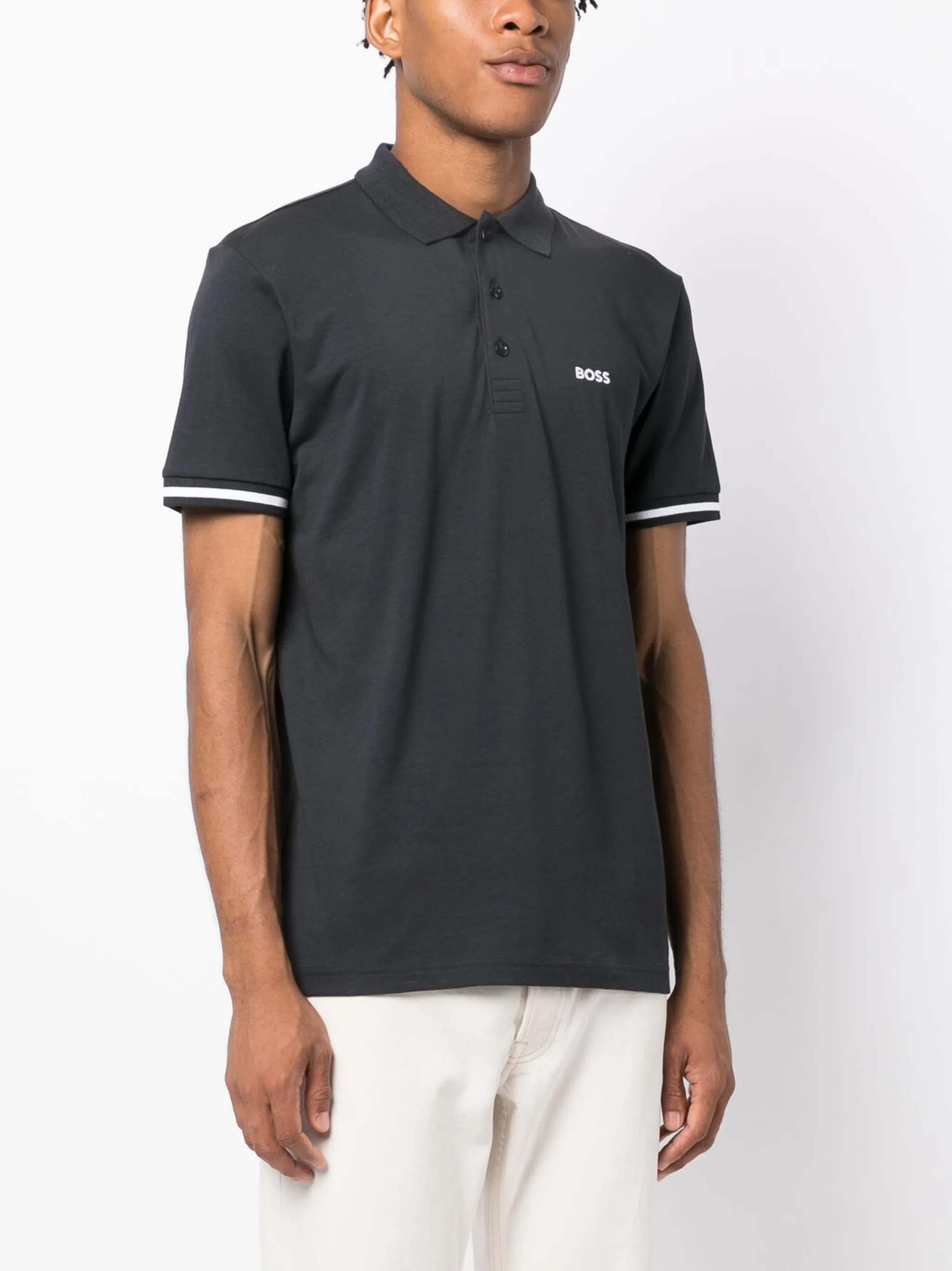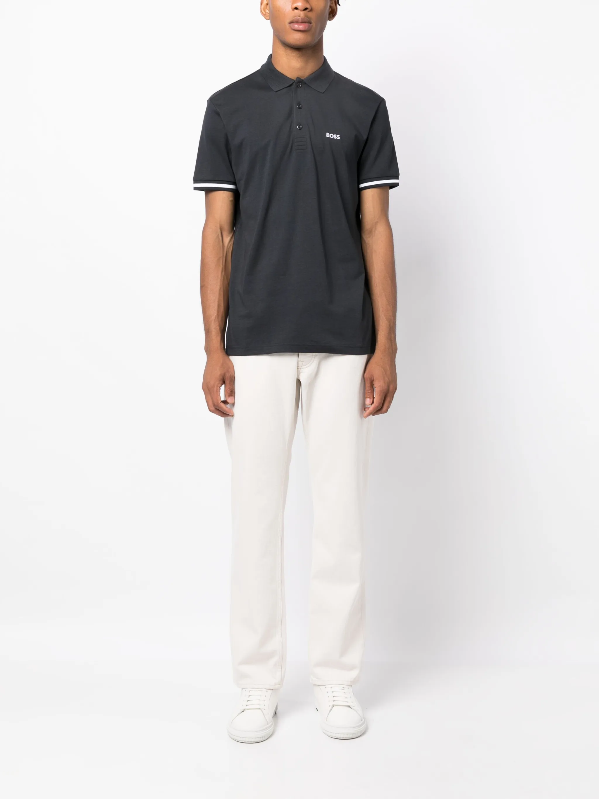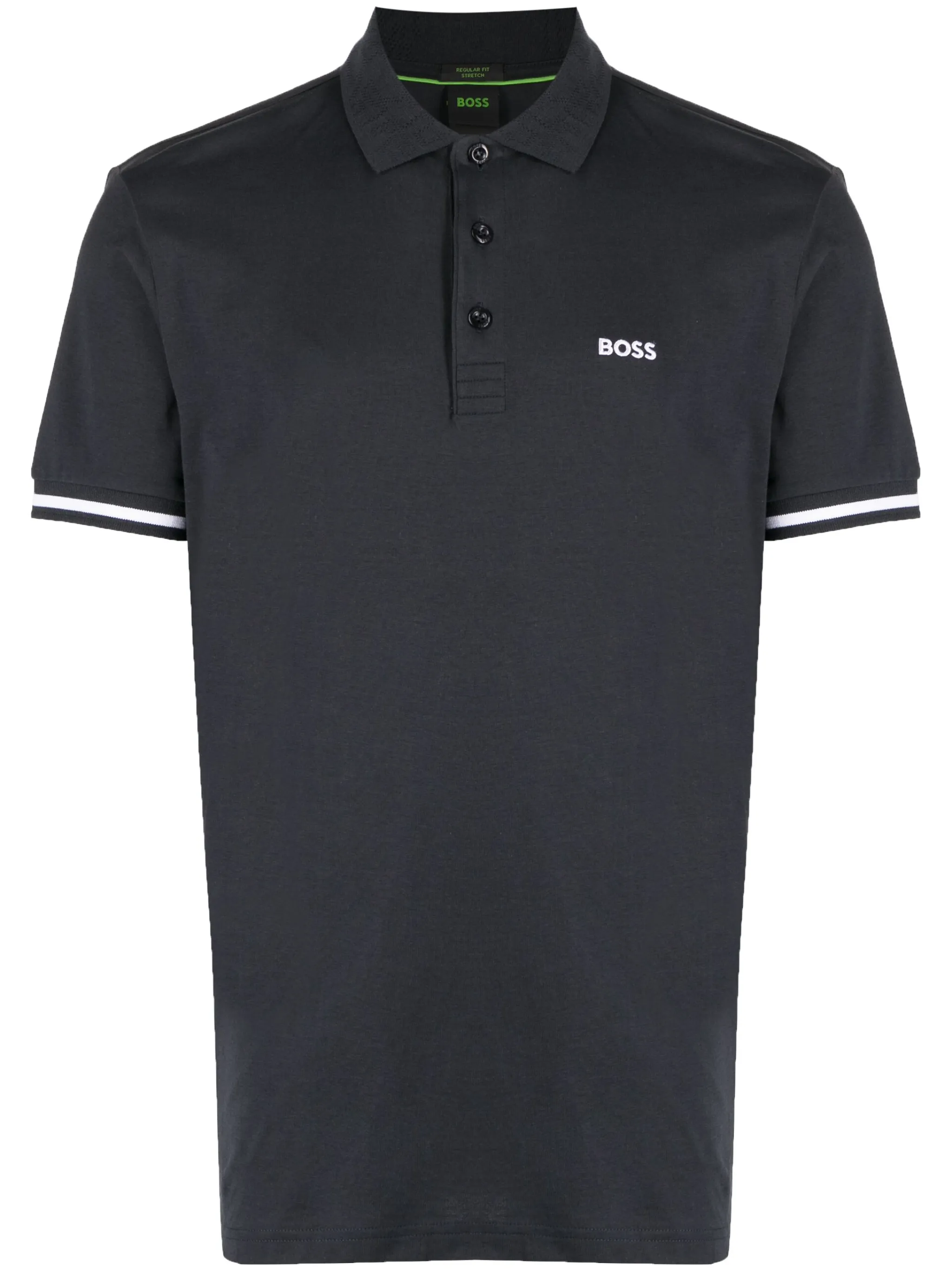 Темно-синий, хлопок, ткань пике, вышитый логотип на груди, полоски, воротник поло, планка на пуговицах спереди, короткие рукава и прямой подол.