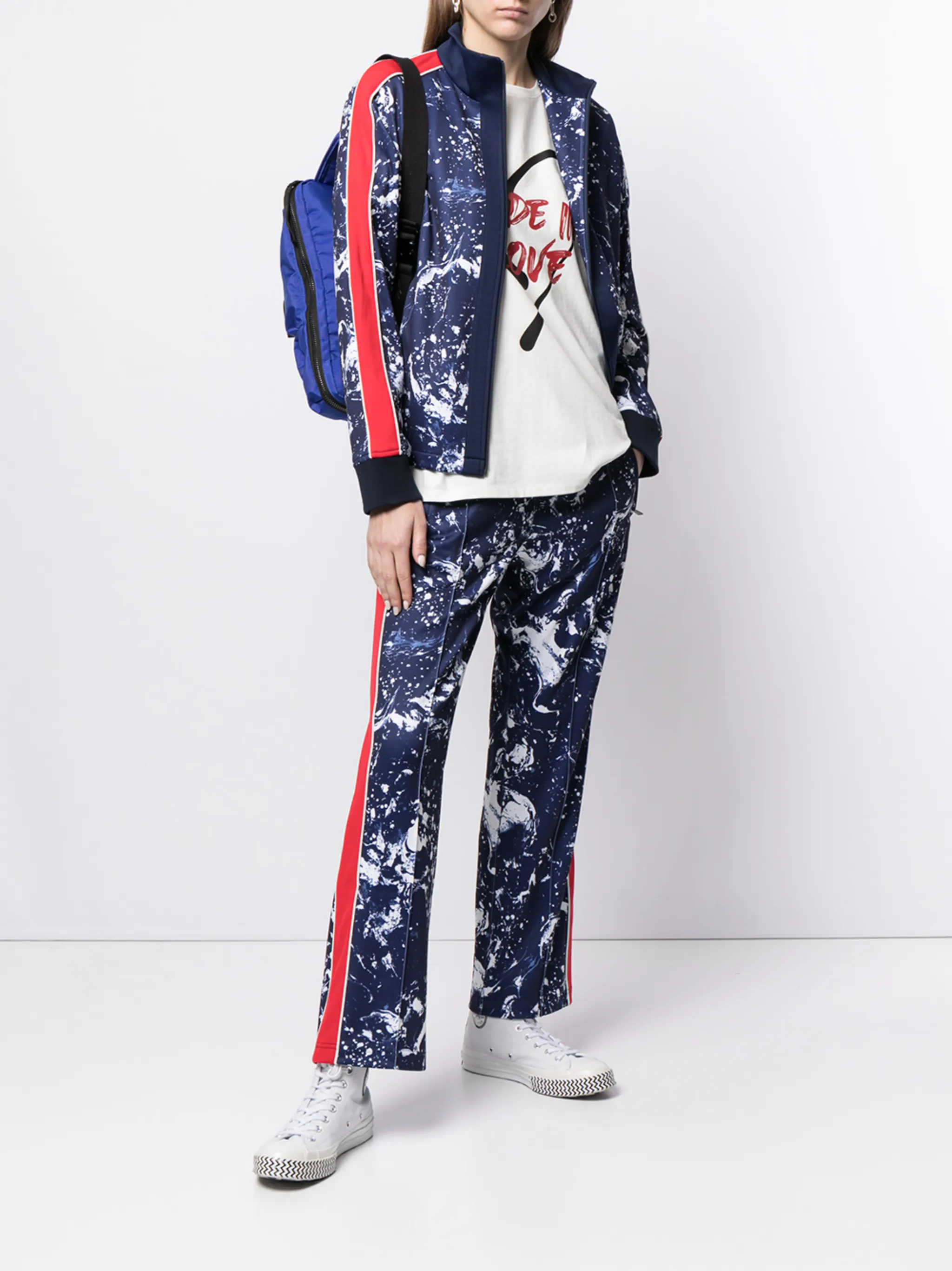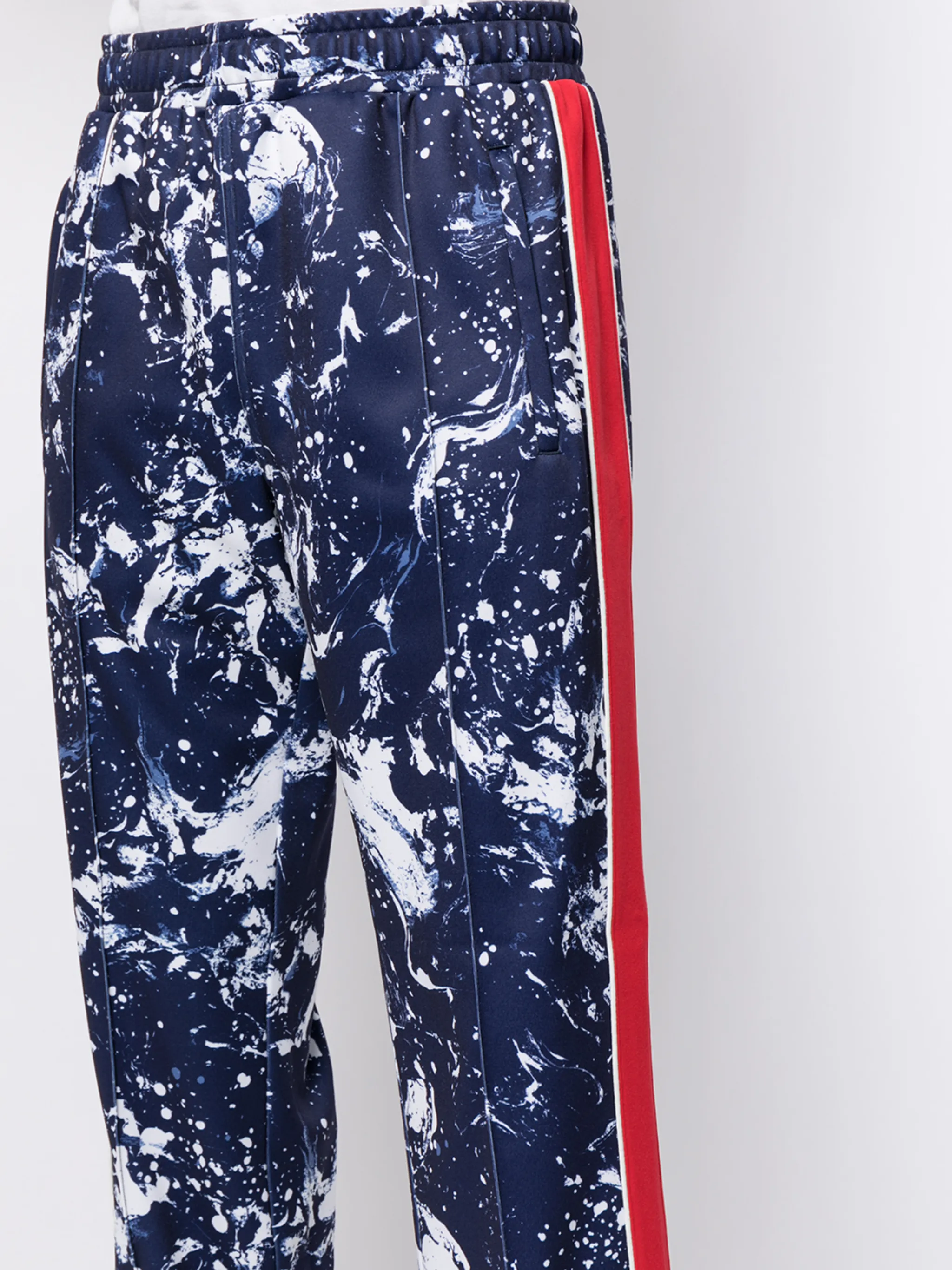 Абстрактный принт, полоска сбоку, эластичный пояс и два кармана по бокам.