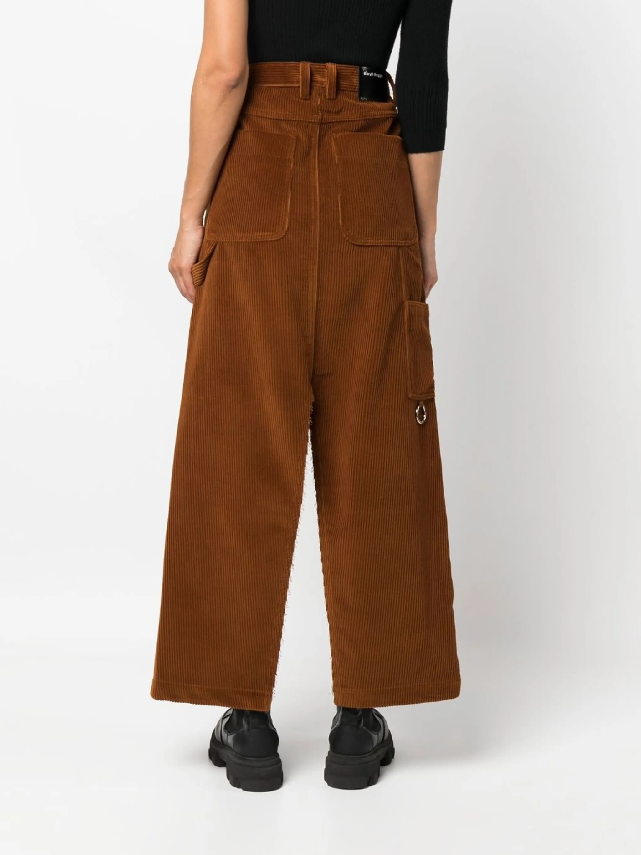 Бежево-коричневый, хлопок, телячья кожа, нашивка с логотипом сзади, необработанные края, металлические кольца, разрез спереди, вырез сзади, завышенная талия, потайная застежка на молнии и пуговицах, петли для ремня, два кармана по бокам, два накладных кармана сзади, накладной карман сбоку, прямой подол и высота по щиколотку.
