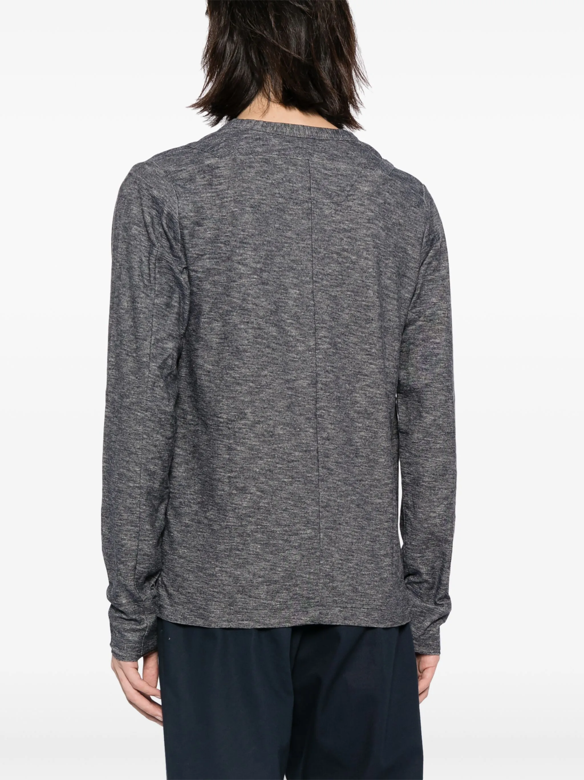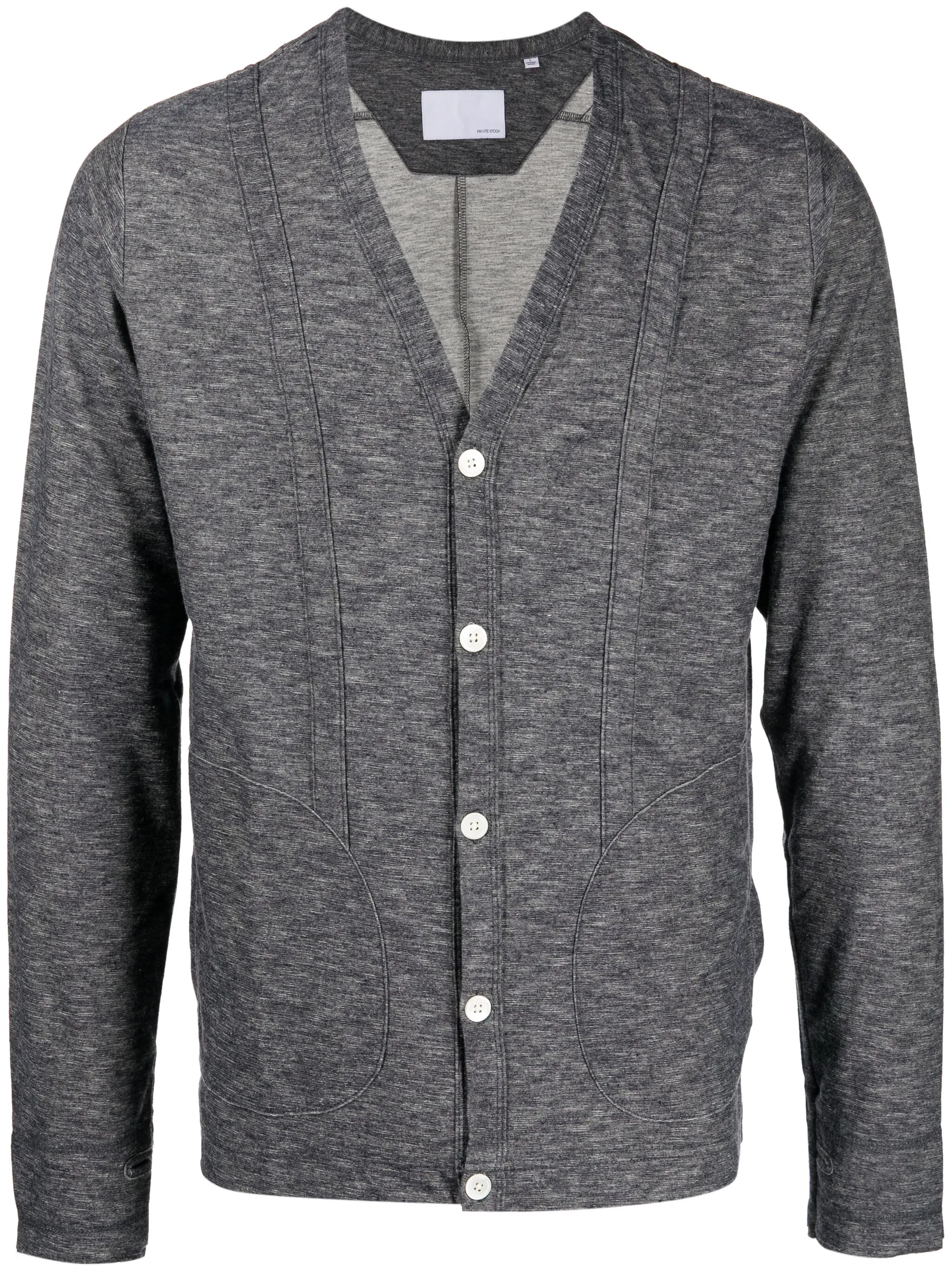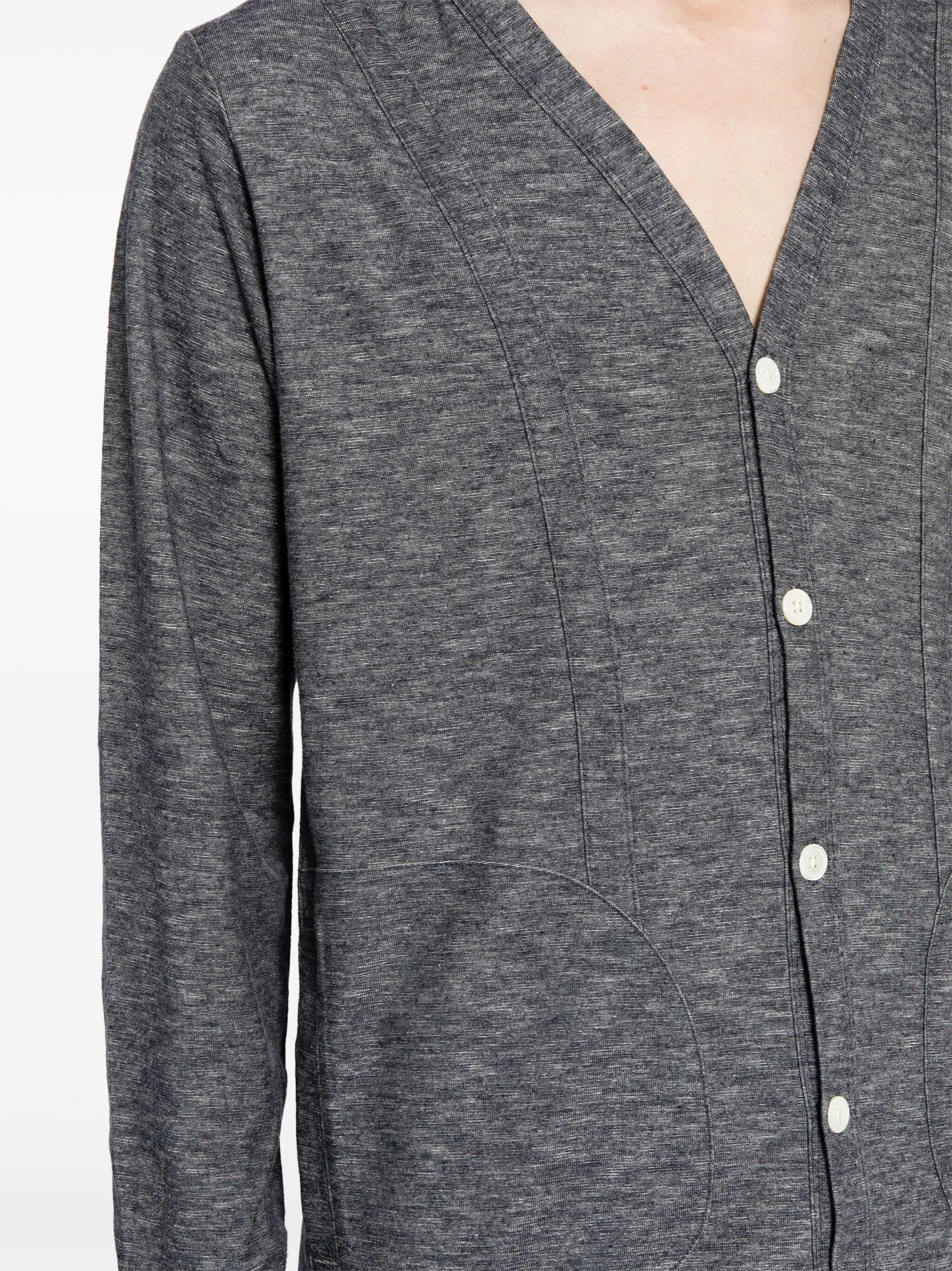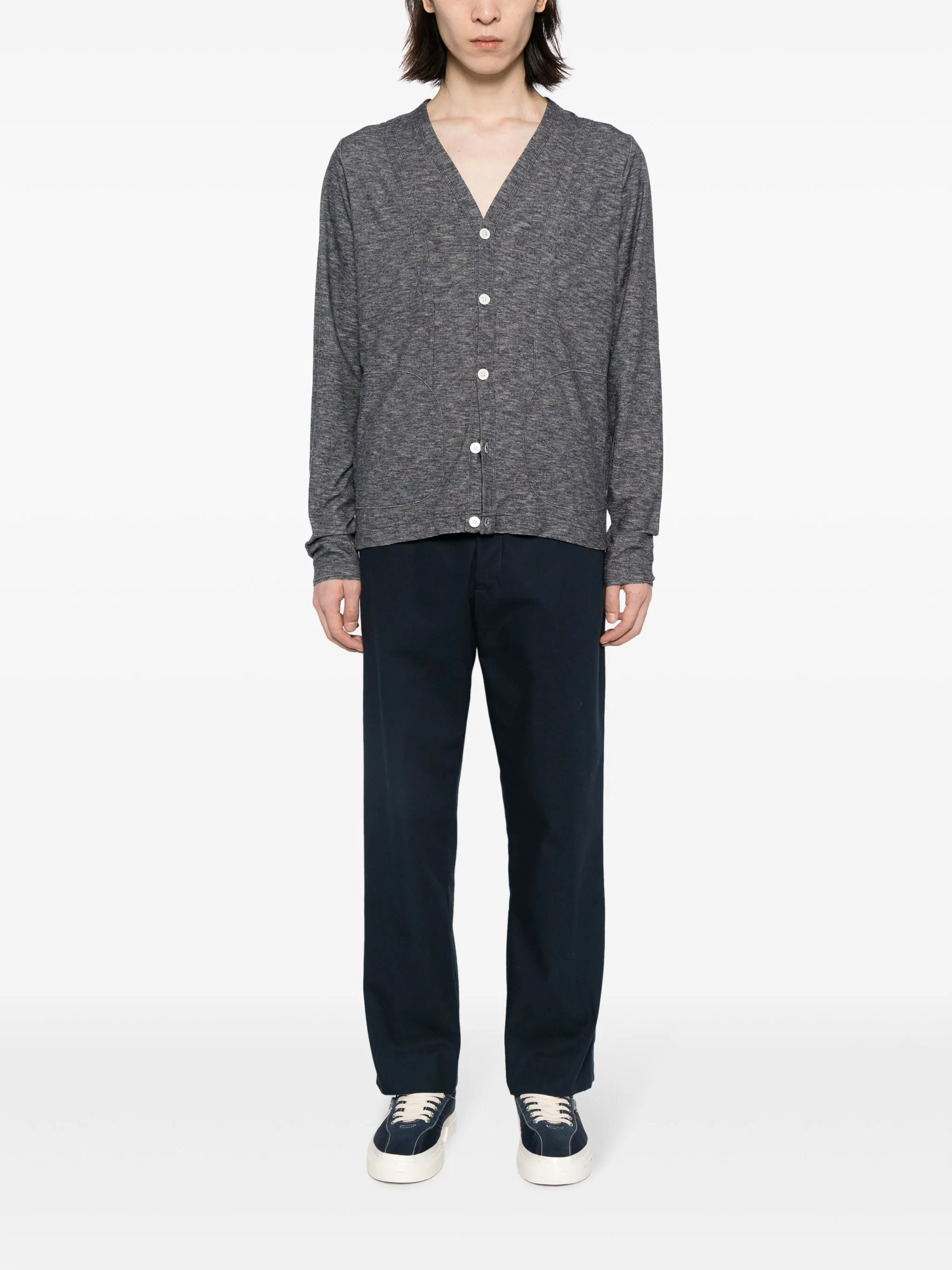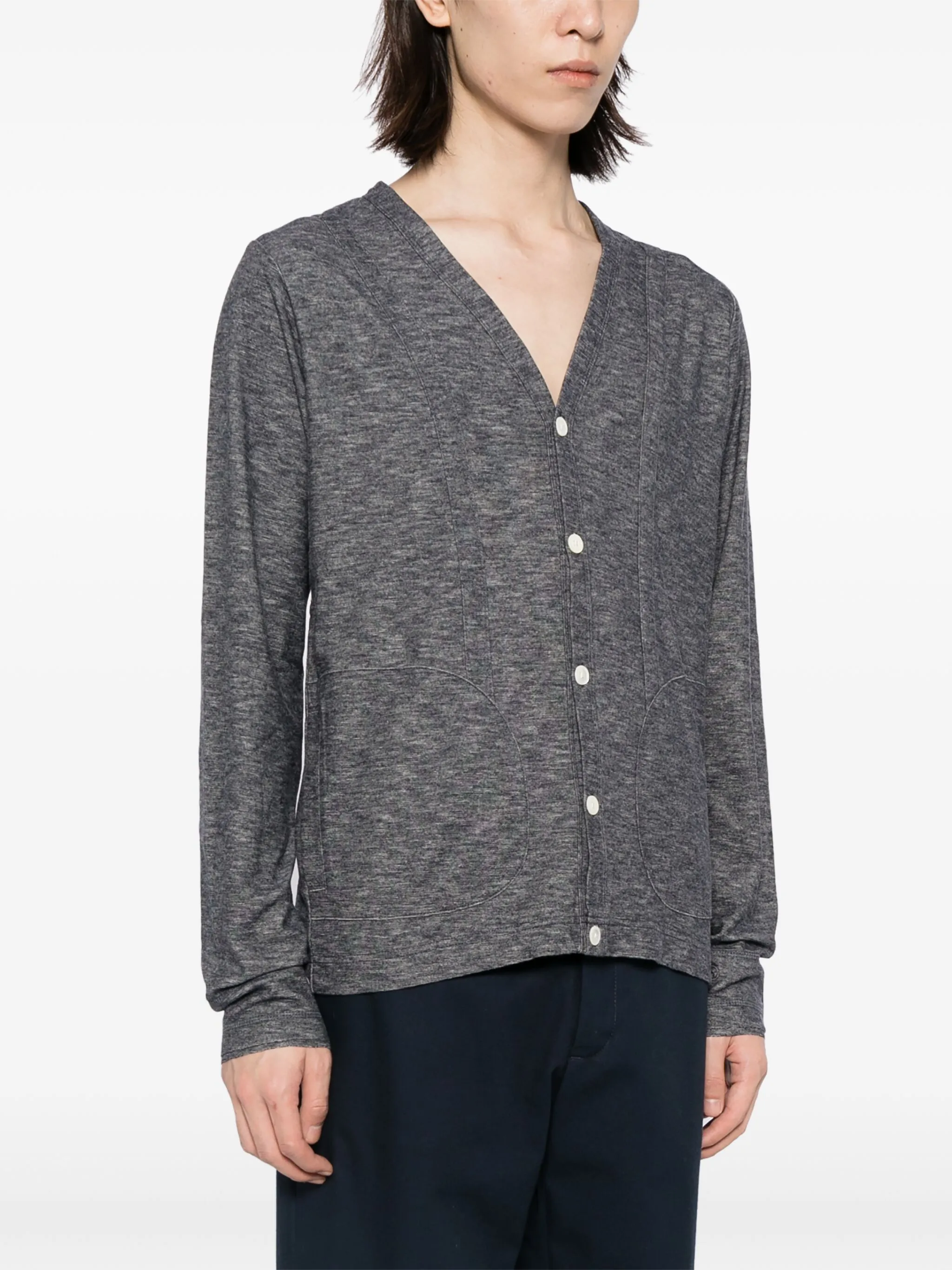 Светло-серый, хлопок, тонкая вязка, эффект меланж, V-образный вырез, застежка на пуговицах спереди, длинные рукава, два накладных кармана по бокам и прямой подол.