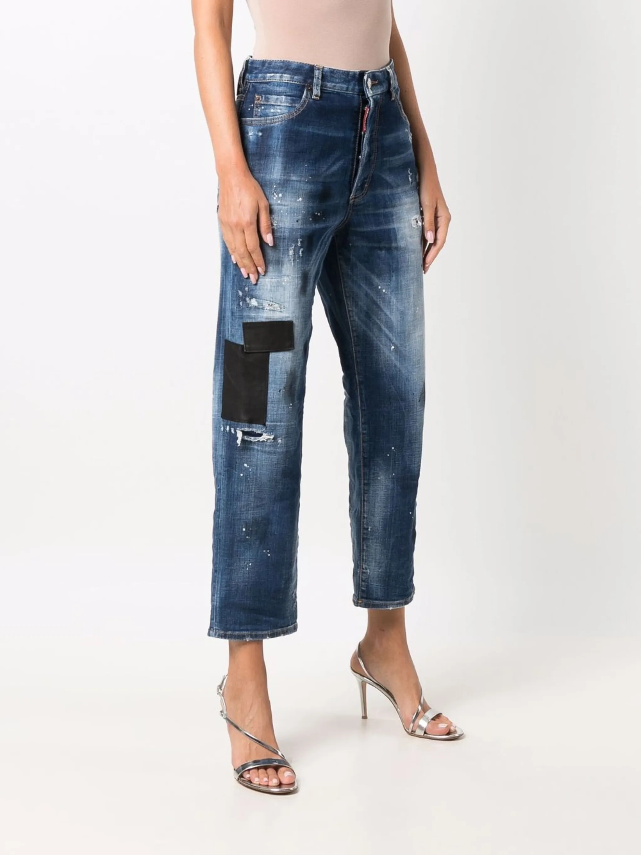 Эффект потертости, нашивка с логотипом спереди, нашивка с логотипом сзади, петли для ремня, средняя посадка, прямой крой, укороченная длина, потайная застежка на молнии и пуговицах и классическая пятикарманная модель.