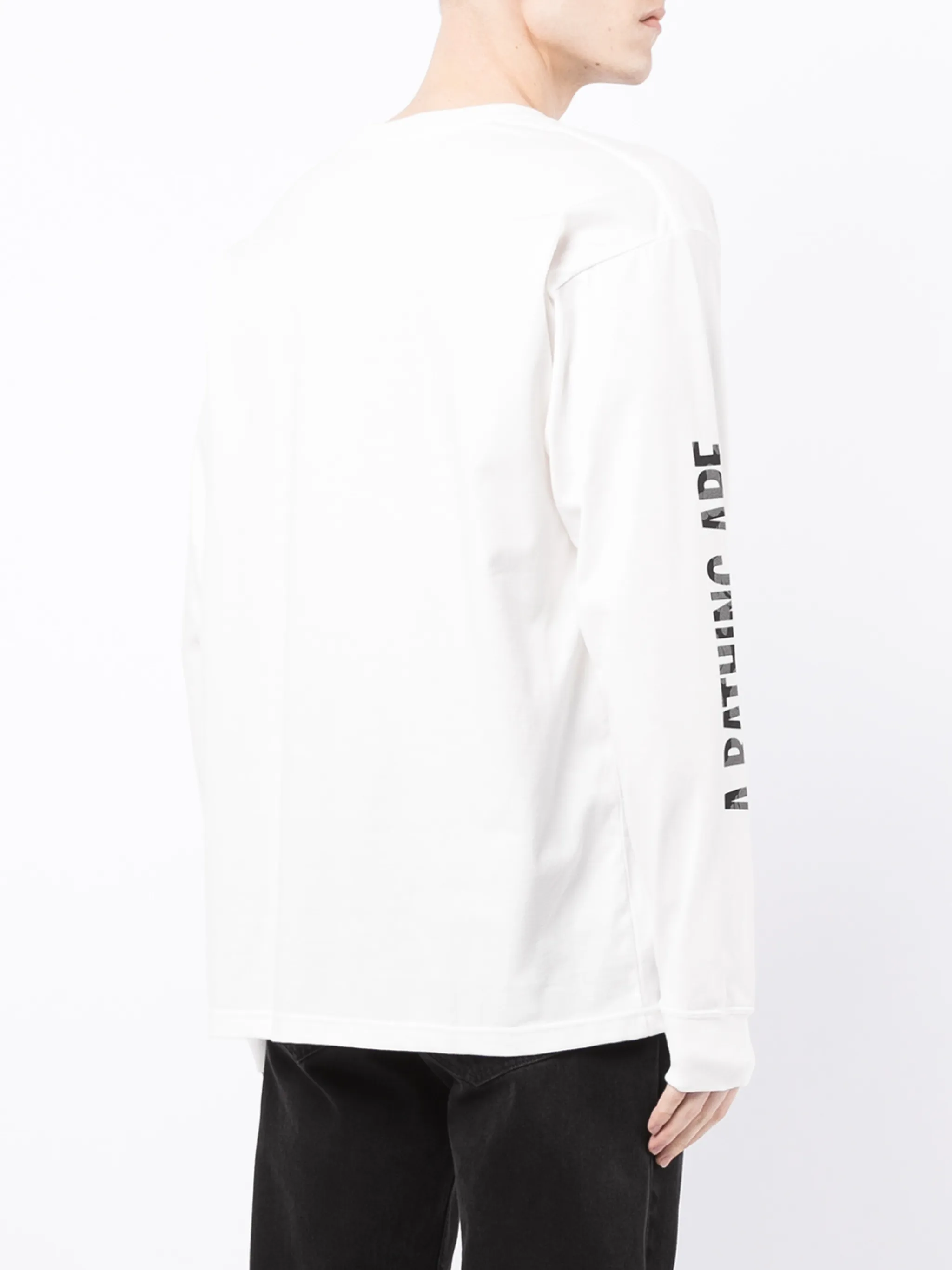 Нагрудный накладной карман, принт с логотипом на груди, принт с логотипом на рукаве, круглый вырез, длинные рукава и прямой подол. Цвет: белый.
