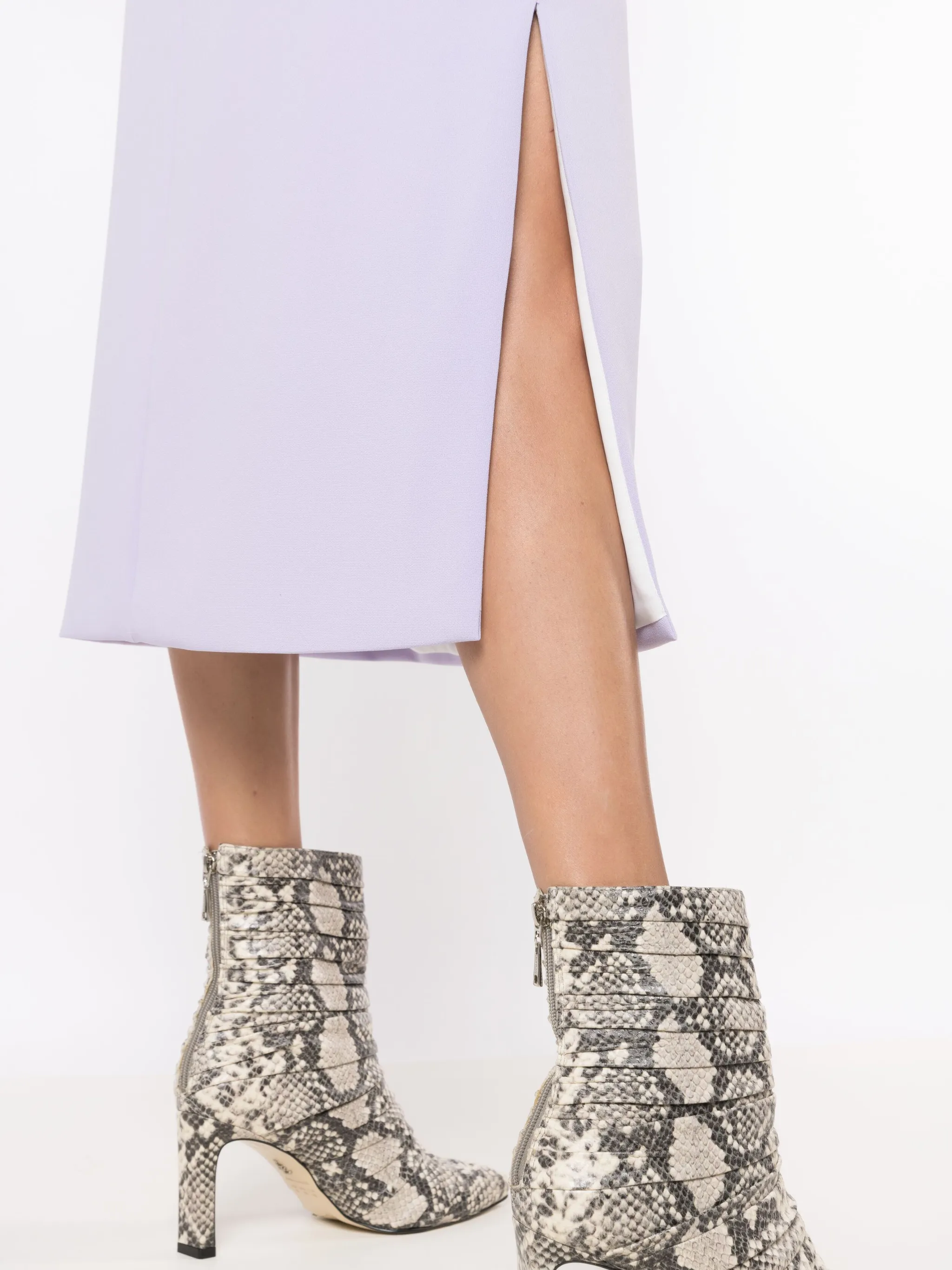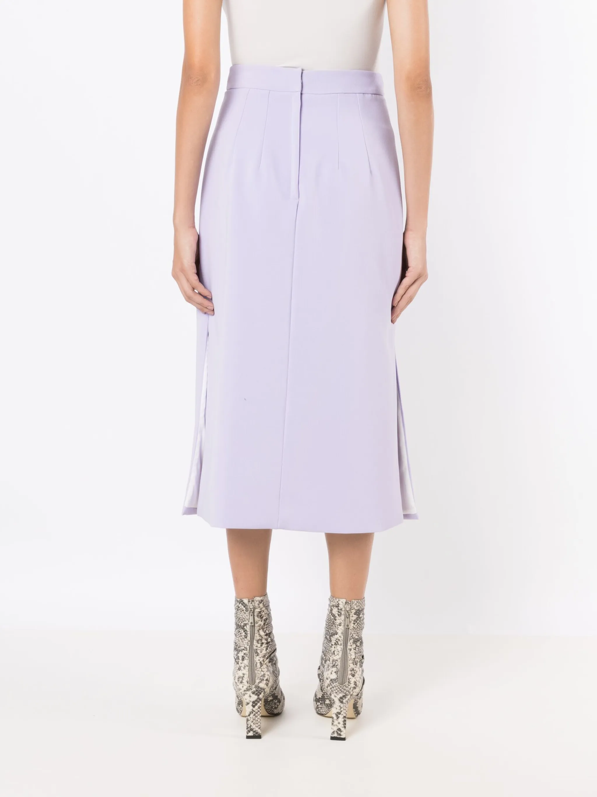 Светло-фиолетовый, эластичный материал, складки, боковые разрезы, потайная застежка сзади и длина до середины икры.