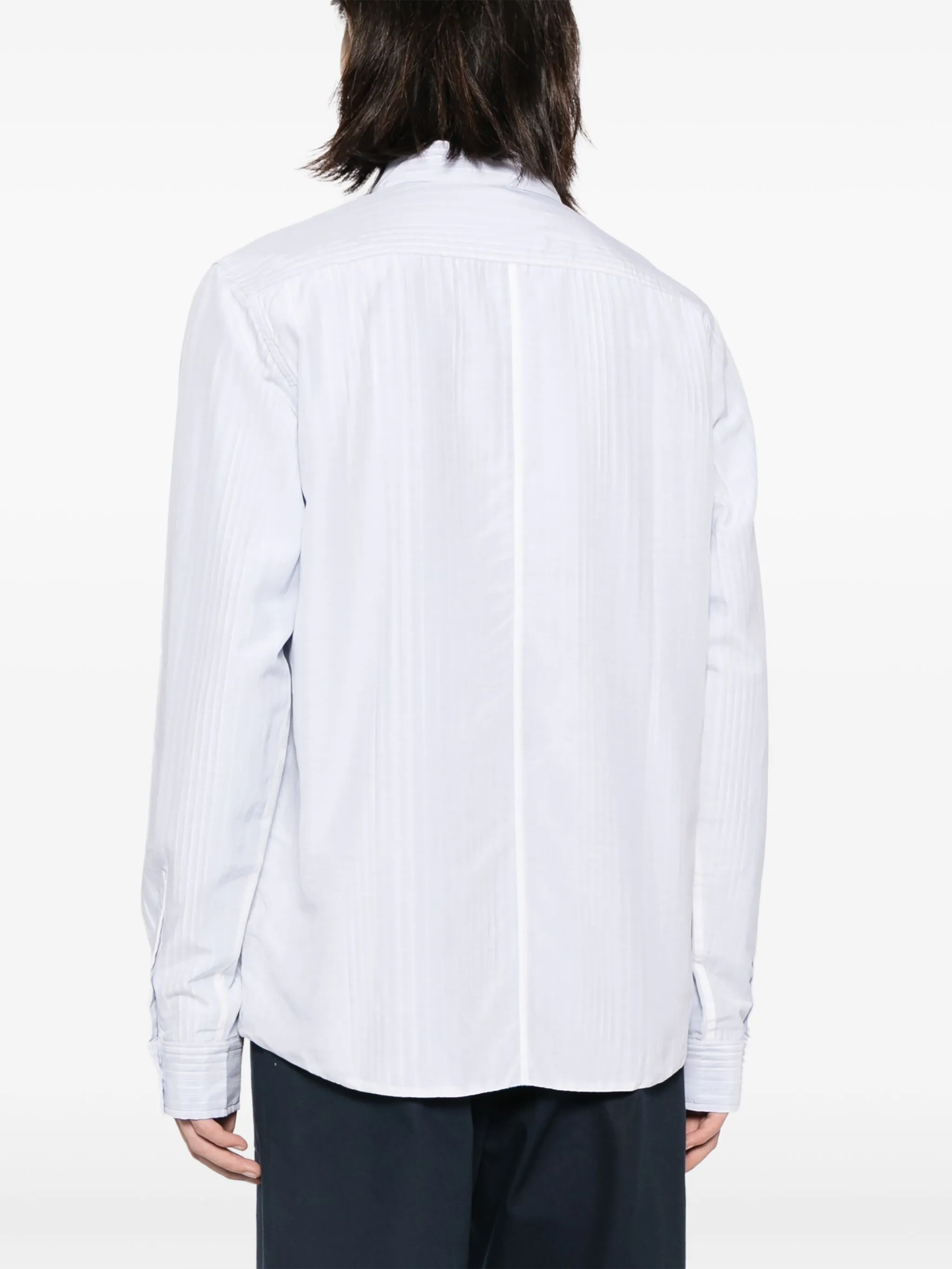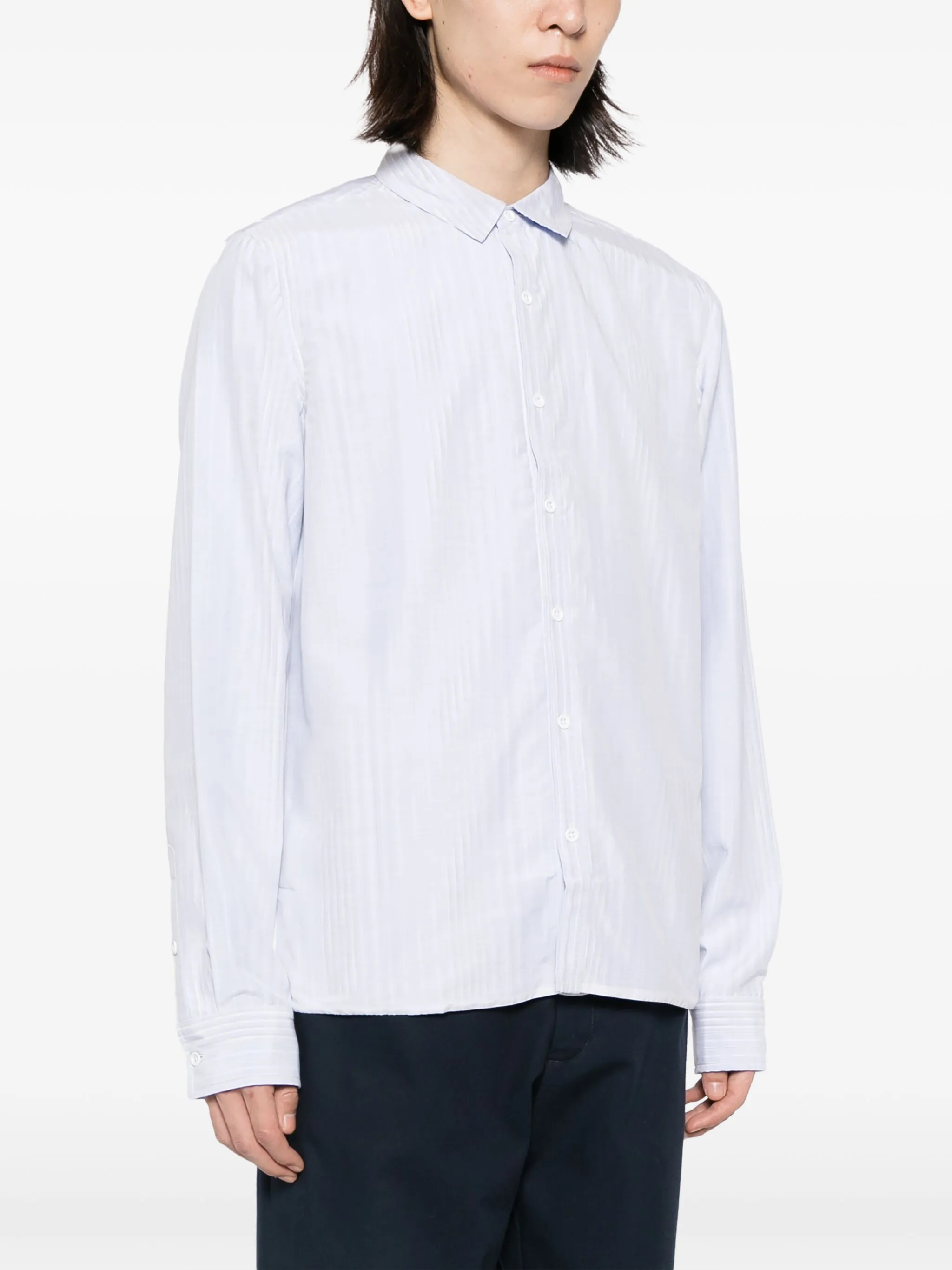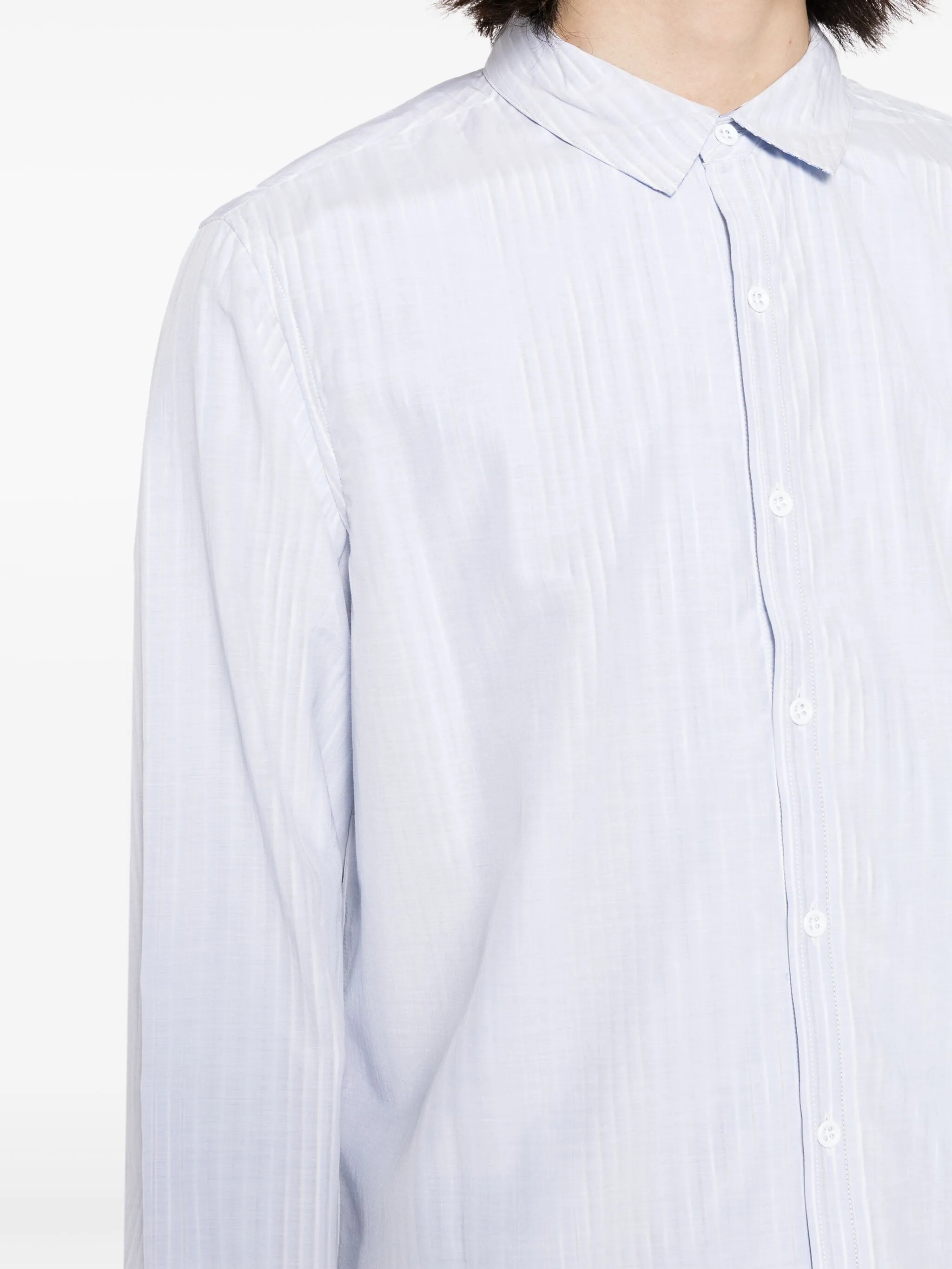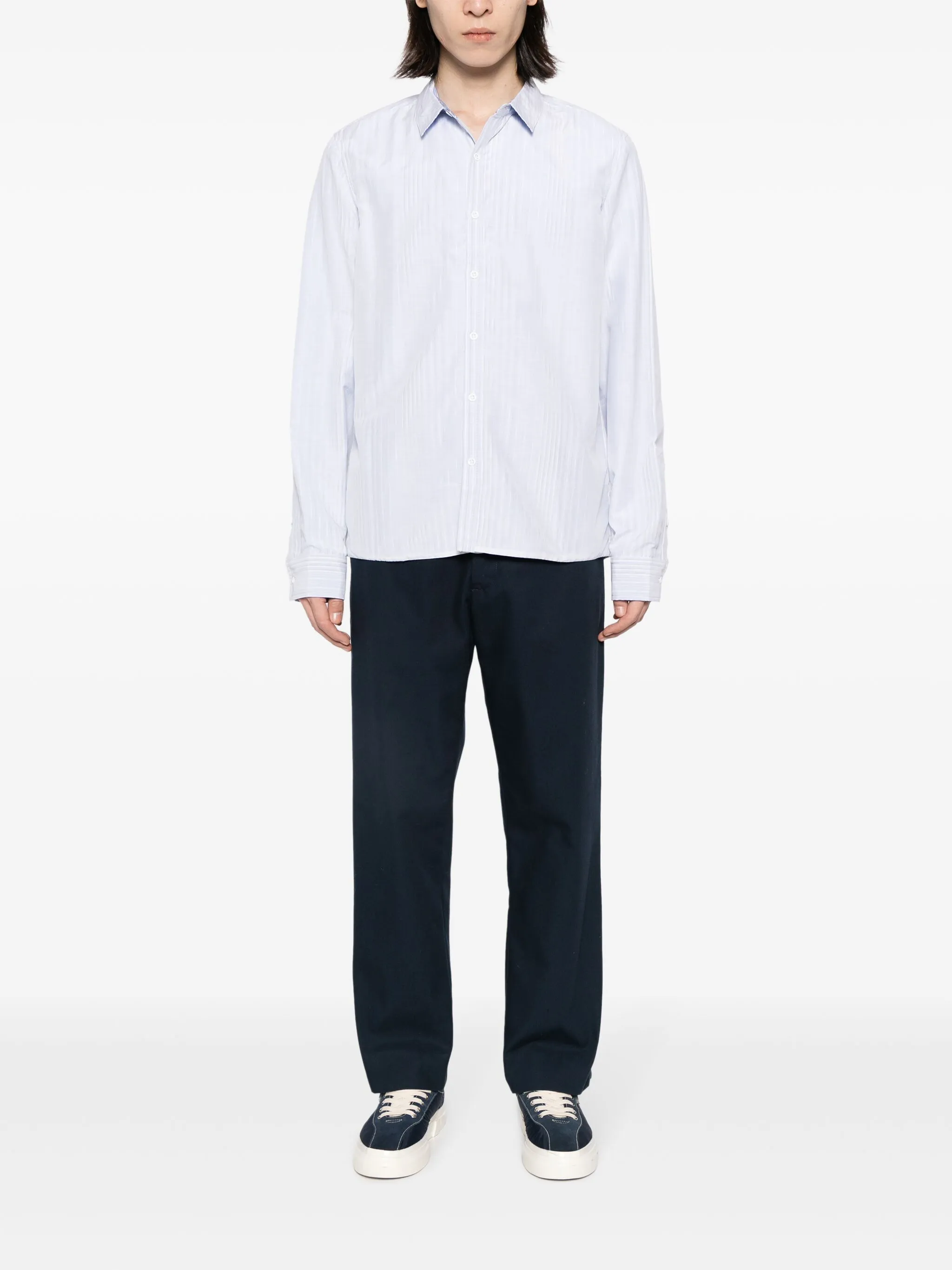 Голубой, хлопок, узор в вертикальную полоску, классический воротник, застежка на пуговицах спереди, длинные рукава, манжеты на пуговицах и закругленный подол.