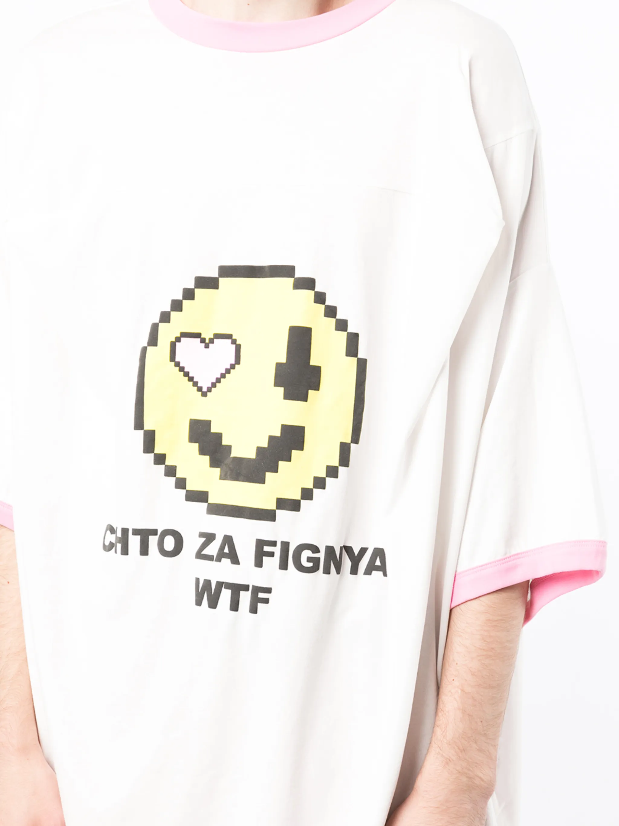Контрастная отделка, принт с изображением смайла, круглый вырез и короткие рукава. Цвет: белый.