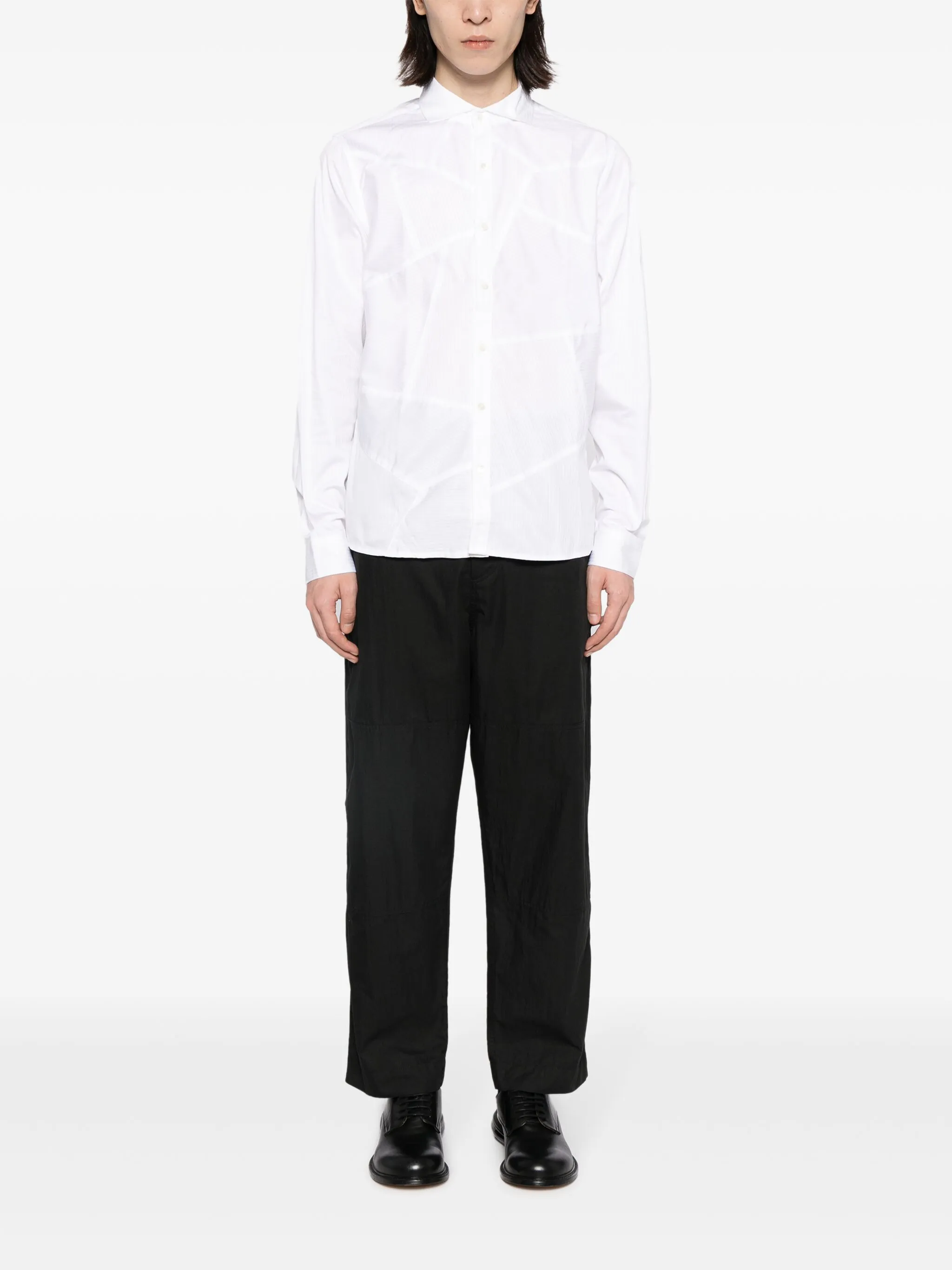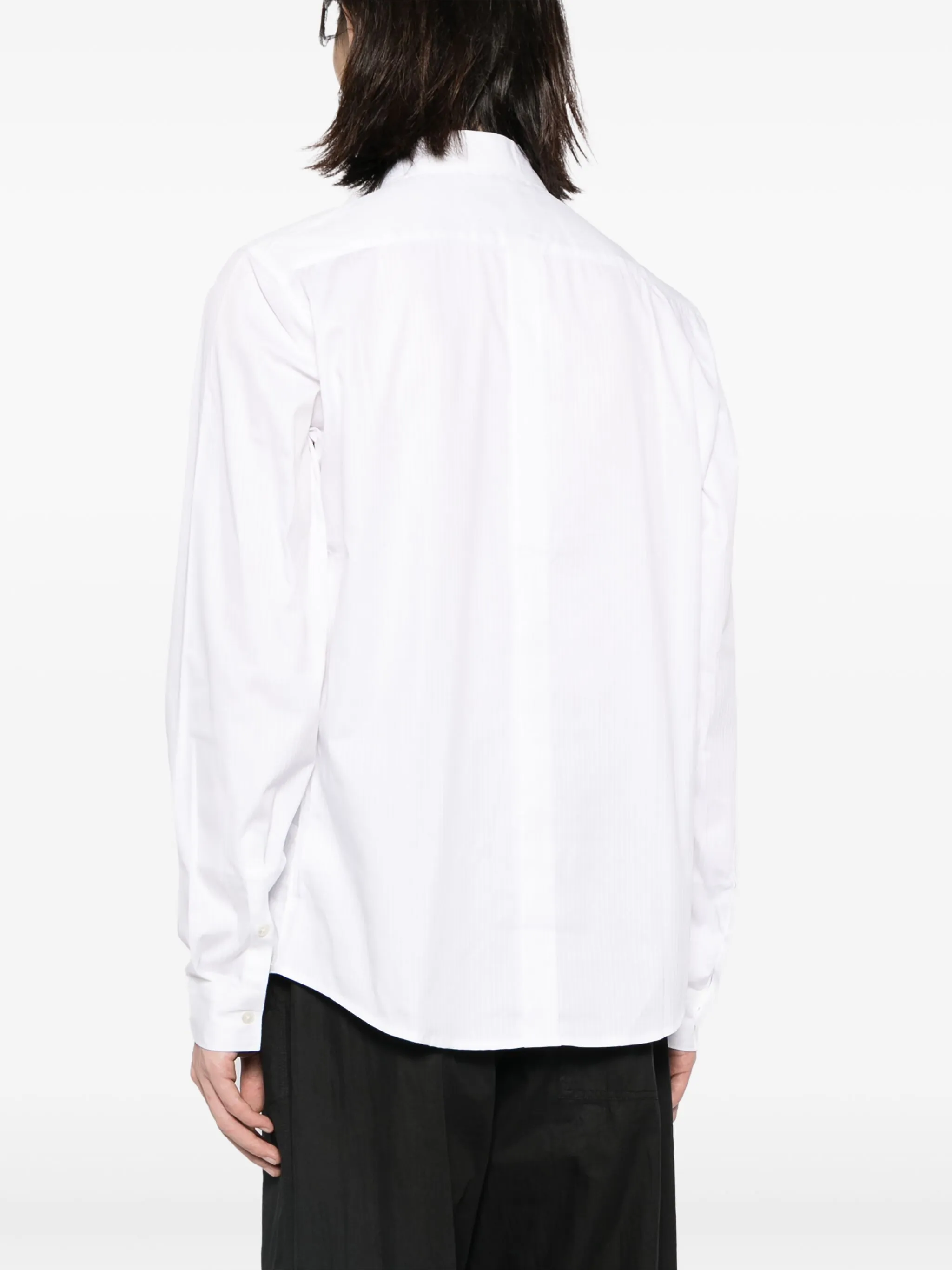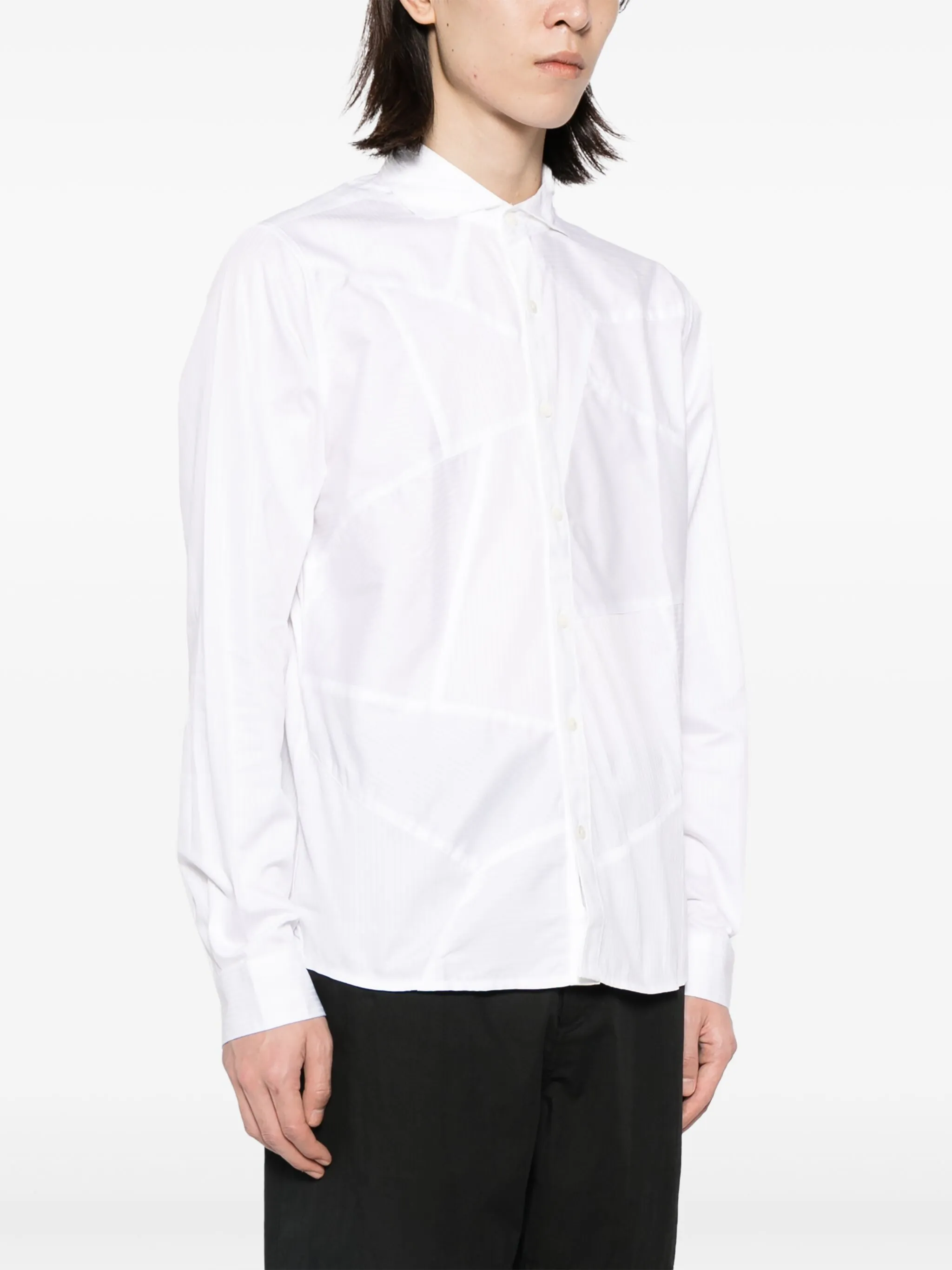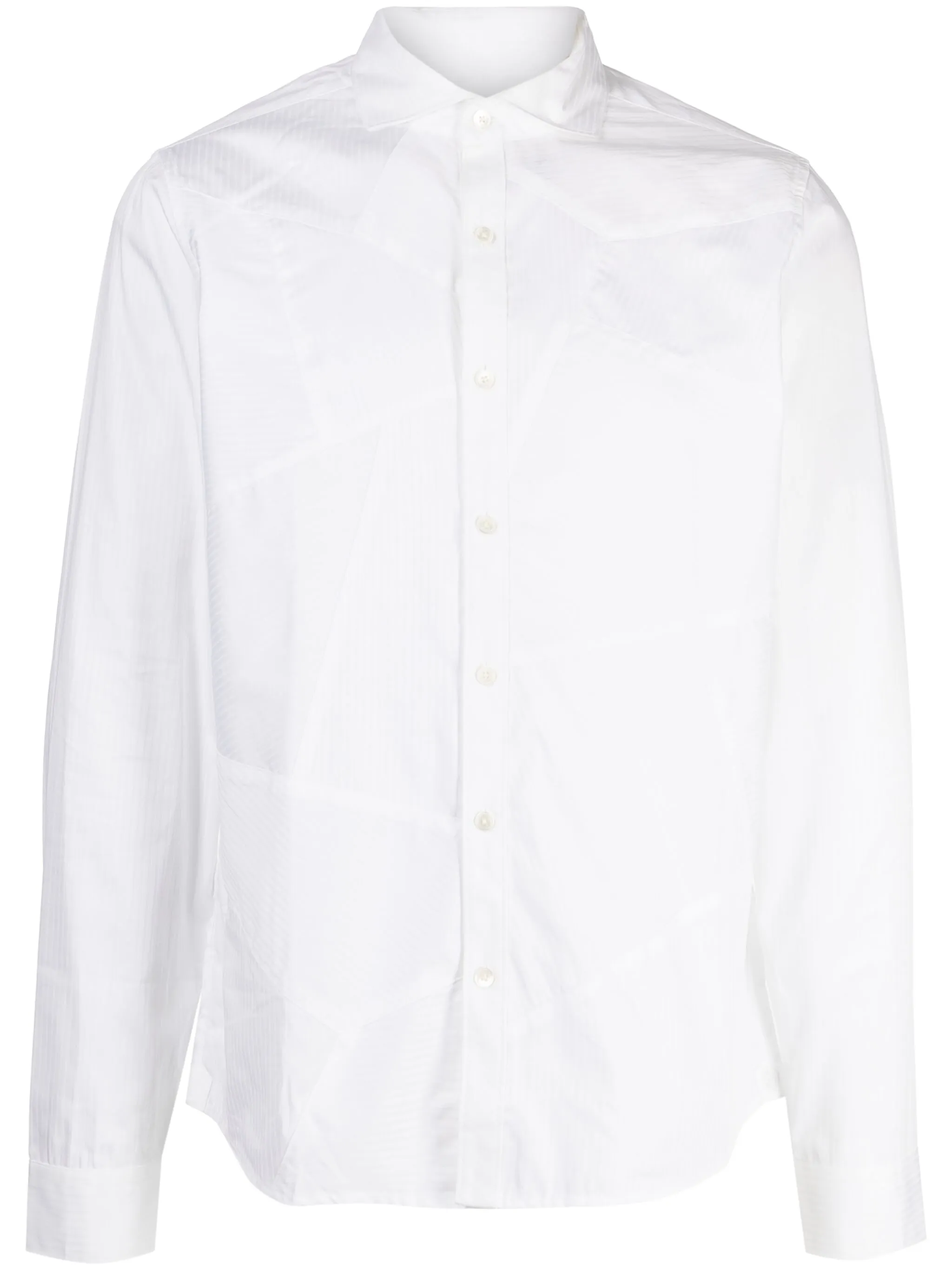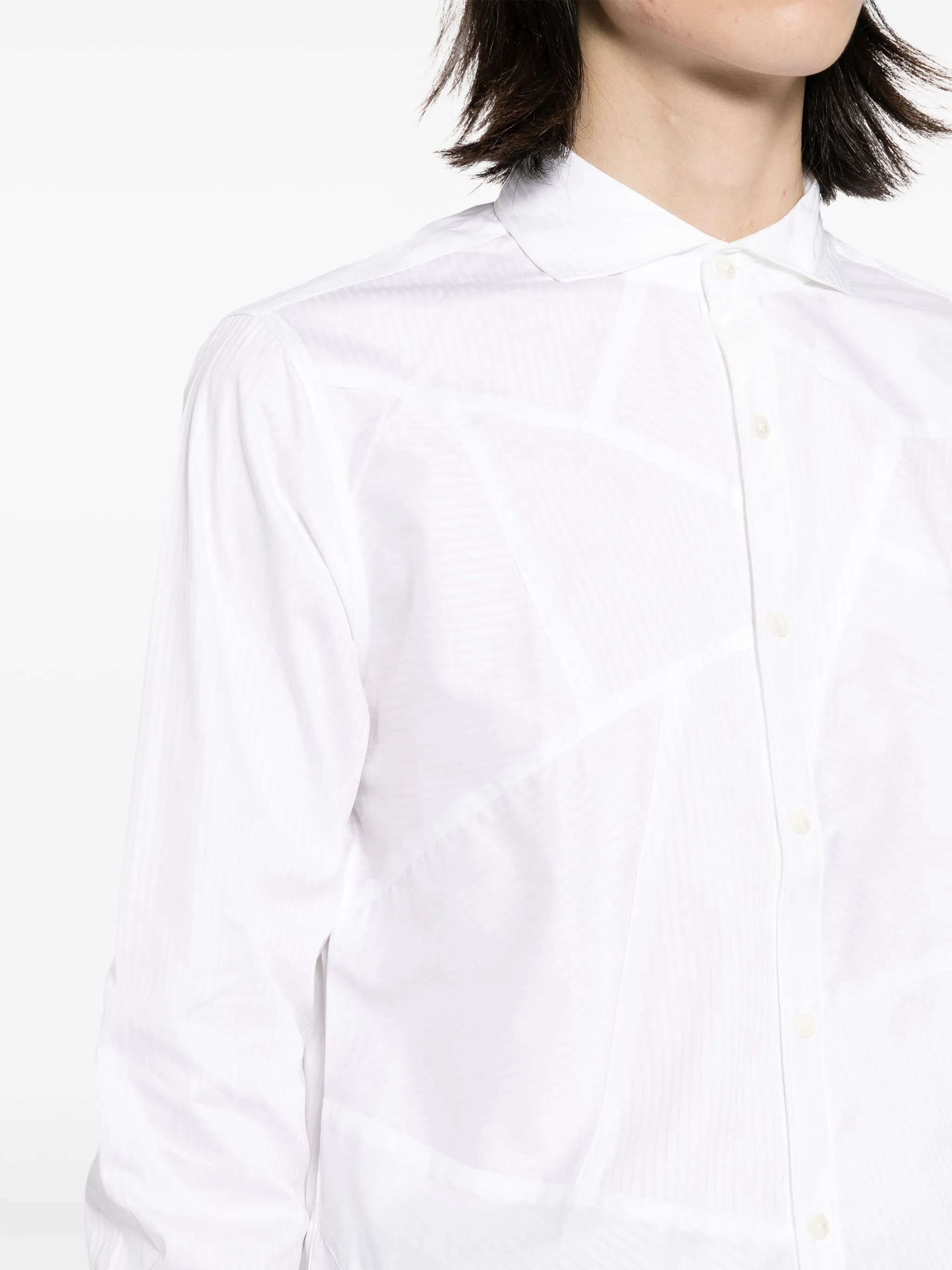 Белый, хлопок, узор в полоску нескольких видов, вставки, косой воротник, застежка на пуговицах спереди, длинные рукава, манжеты на пуговицах и закругленный подол.