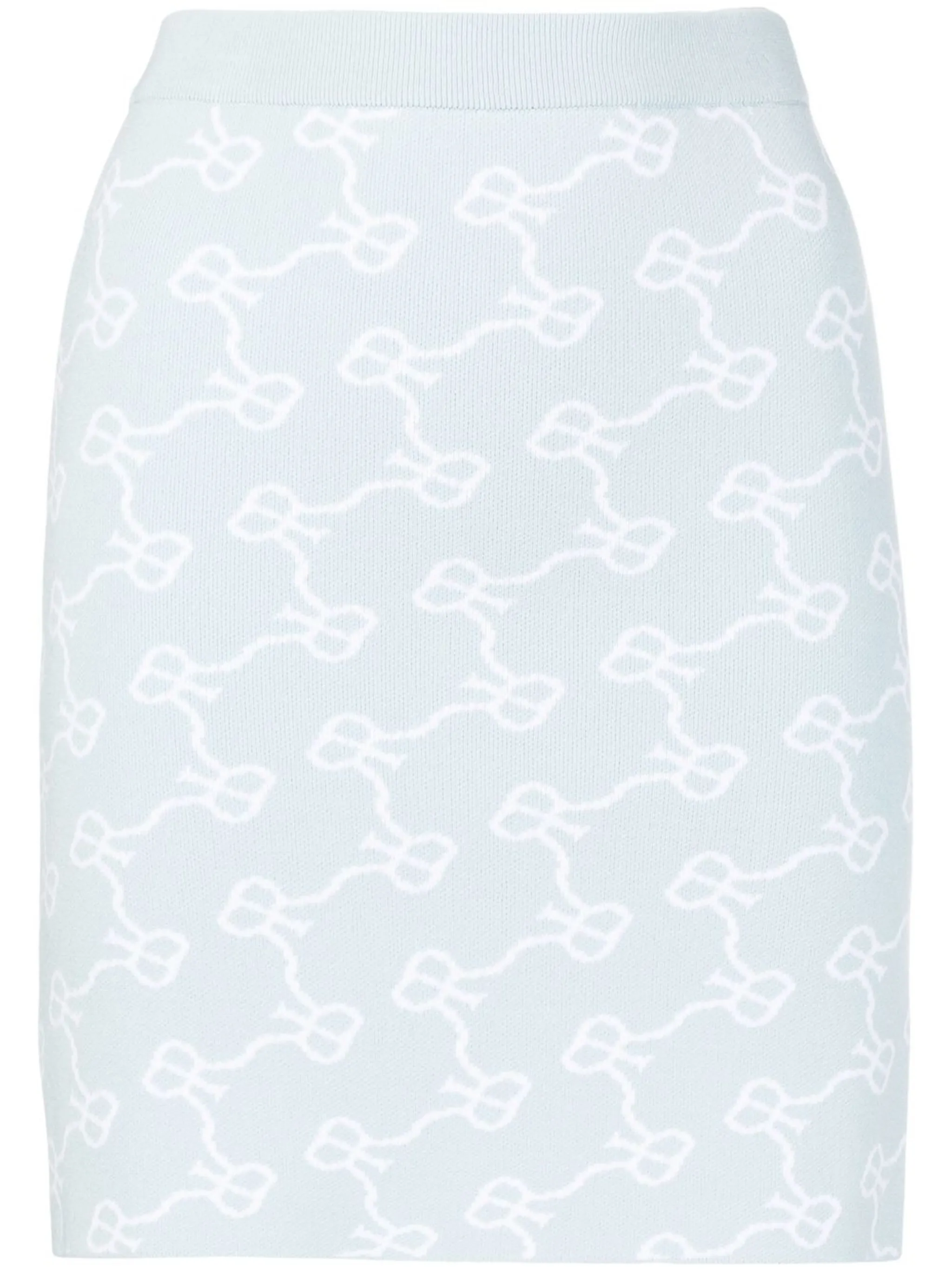 Нежно-голубой, расцветка Cloud White, тонкая вязка, узор с изображением монограммы, завышенная линия талии и юбка-карандаш.