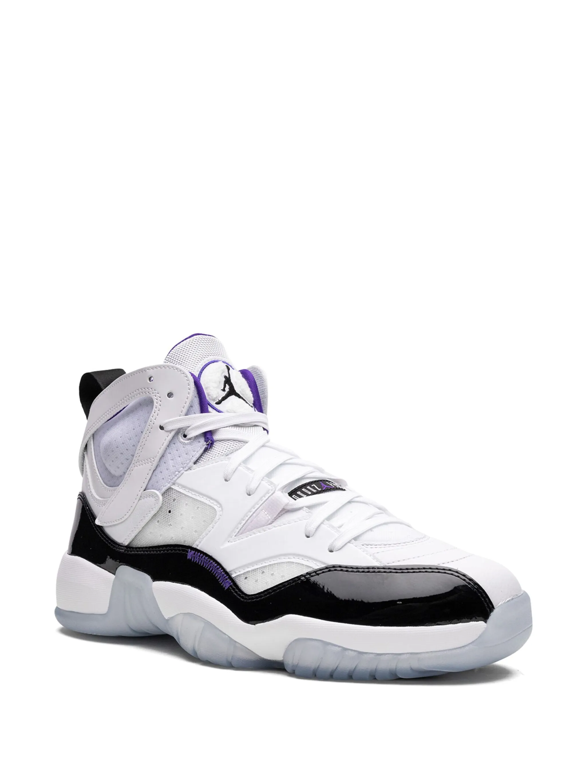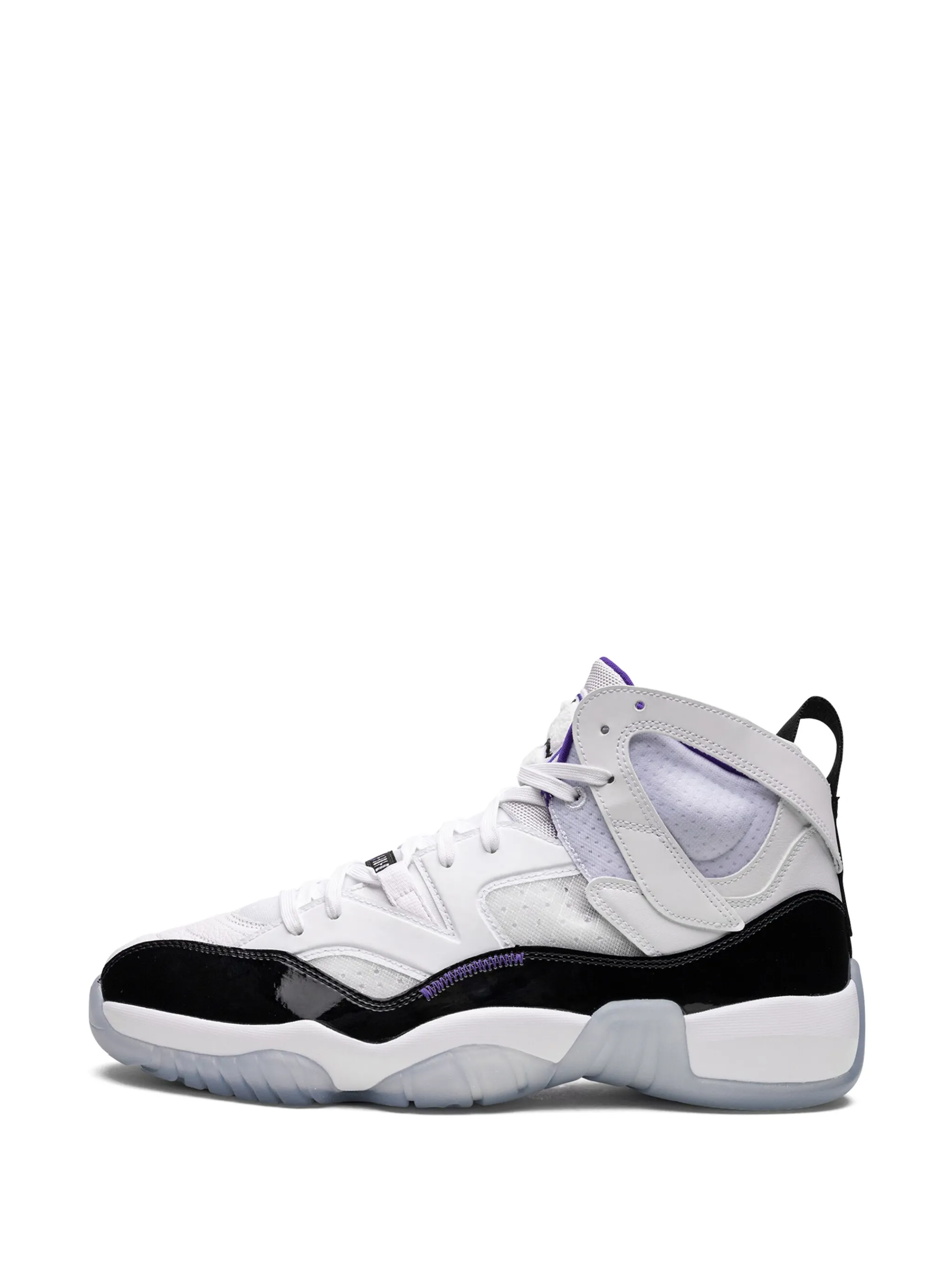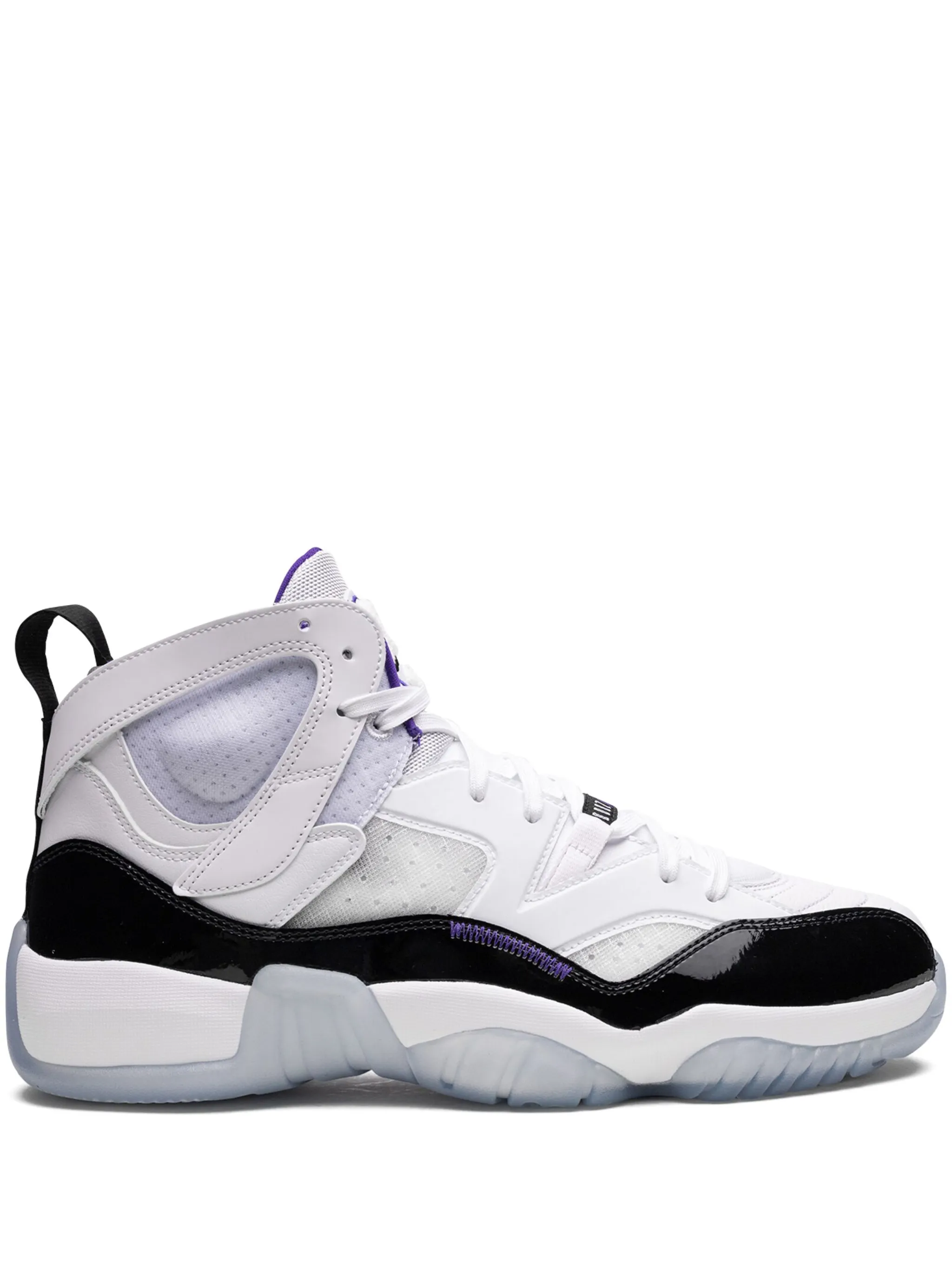 Белый/черный, фиолетовый, кожа, лакированная отделка, вставки, логотип Jumpman, закругленный носок, шнуровка спереди, петля для подтягивания сзади и резиновая подошва.