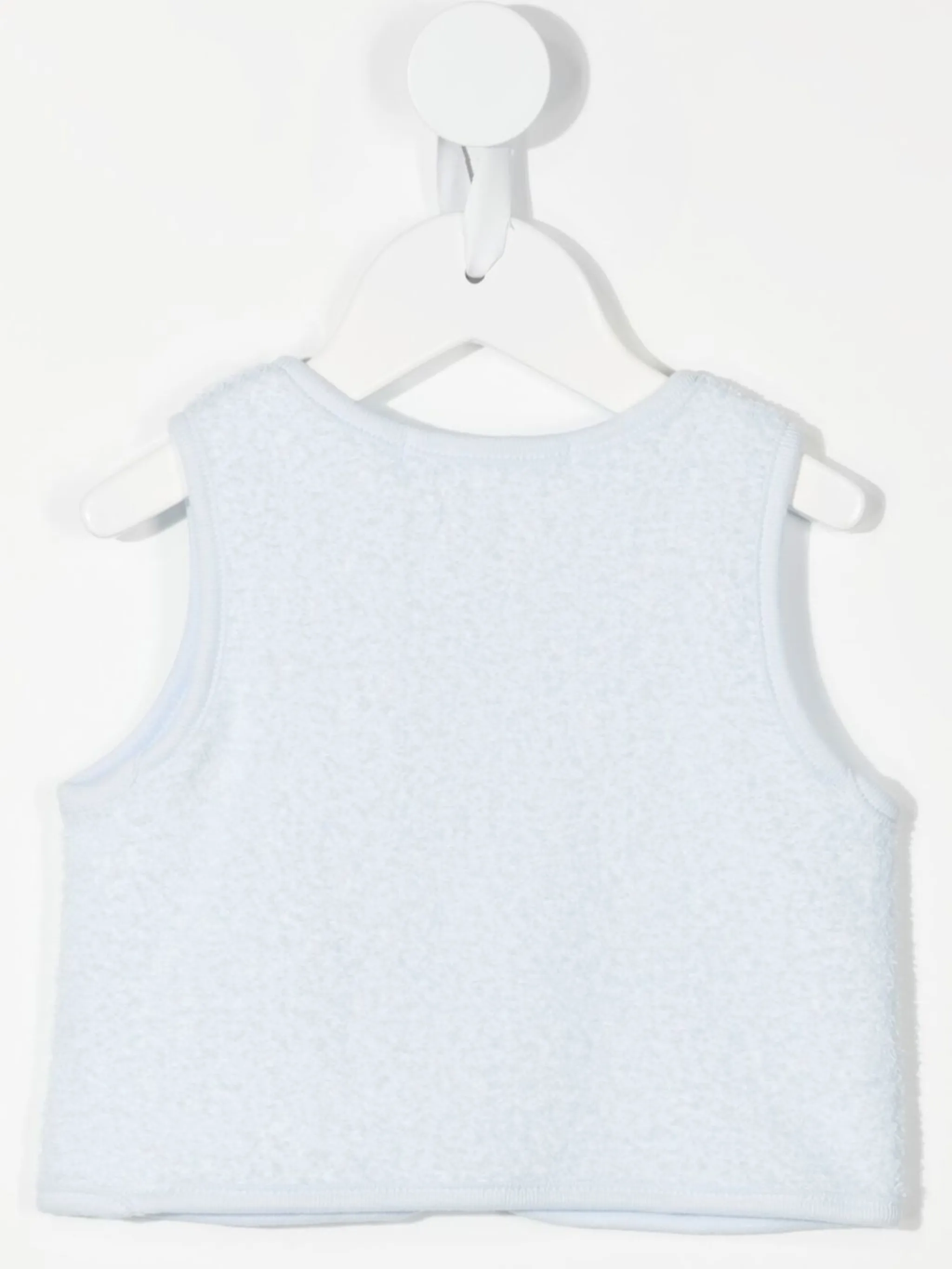 Круглый вырез, застежка на кнопках спереди и без рукавов.