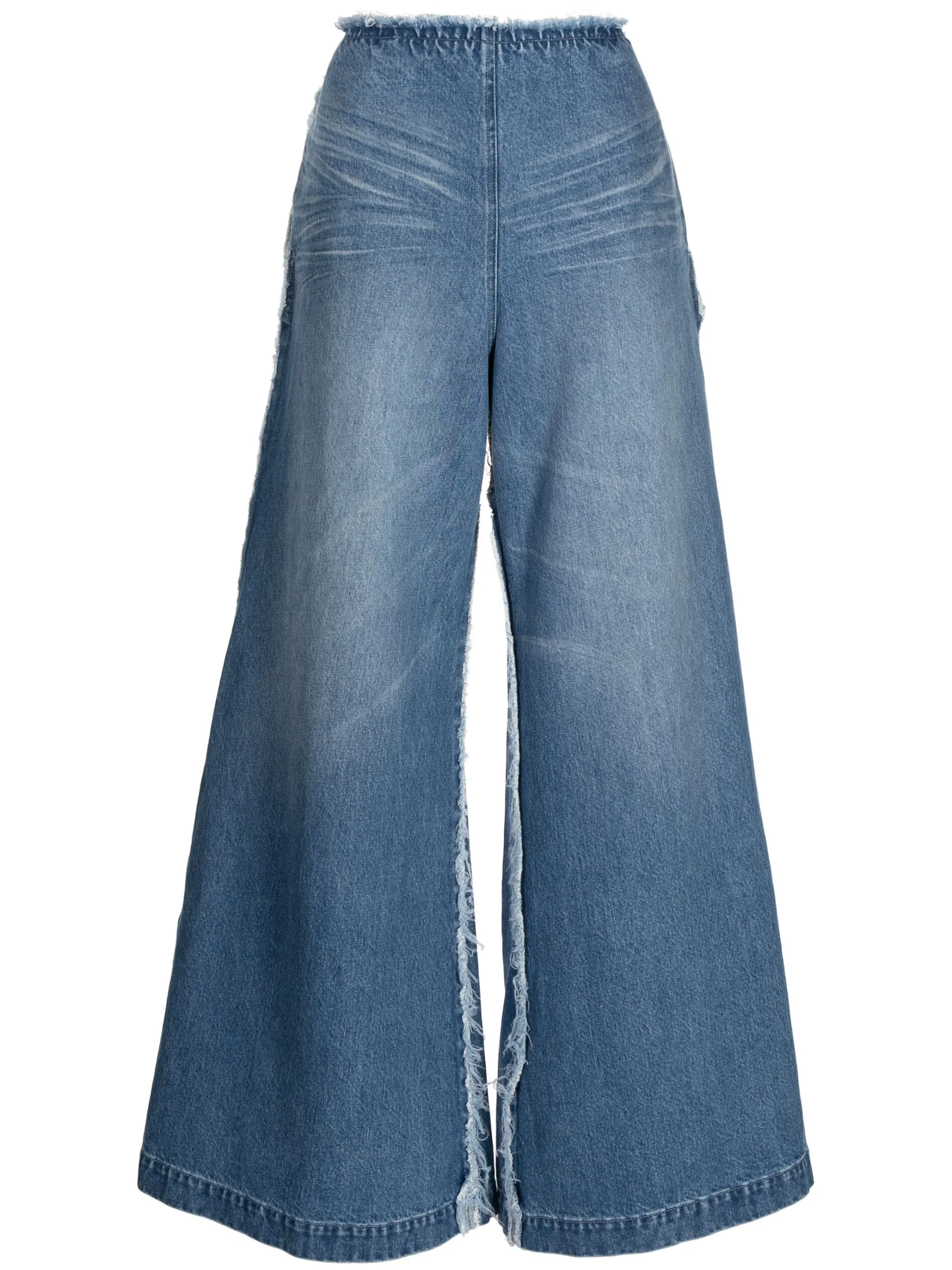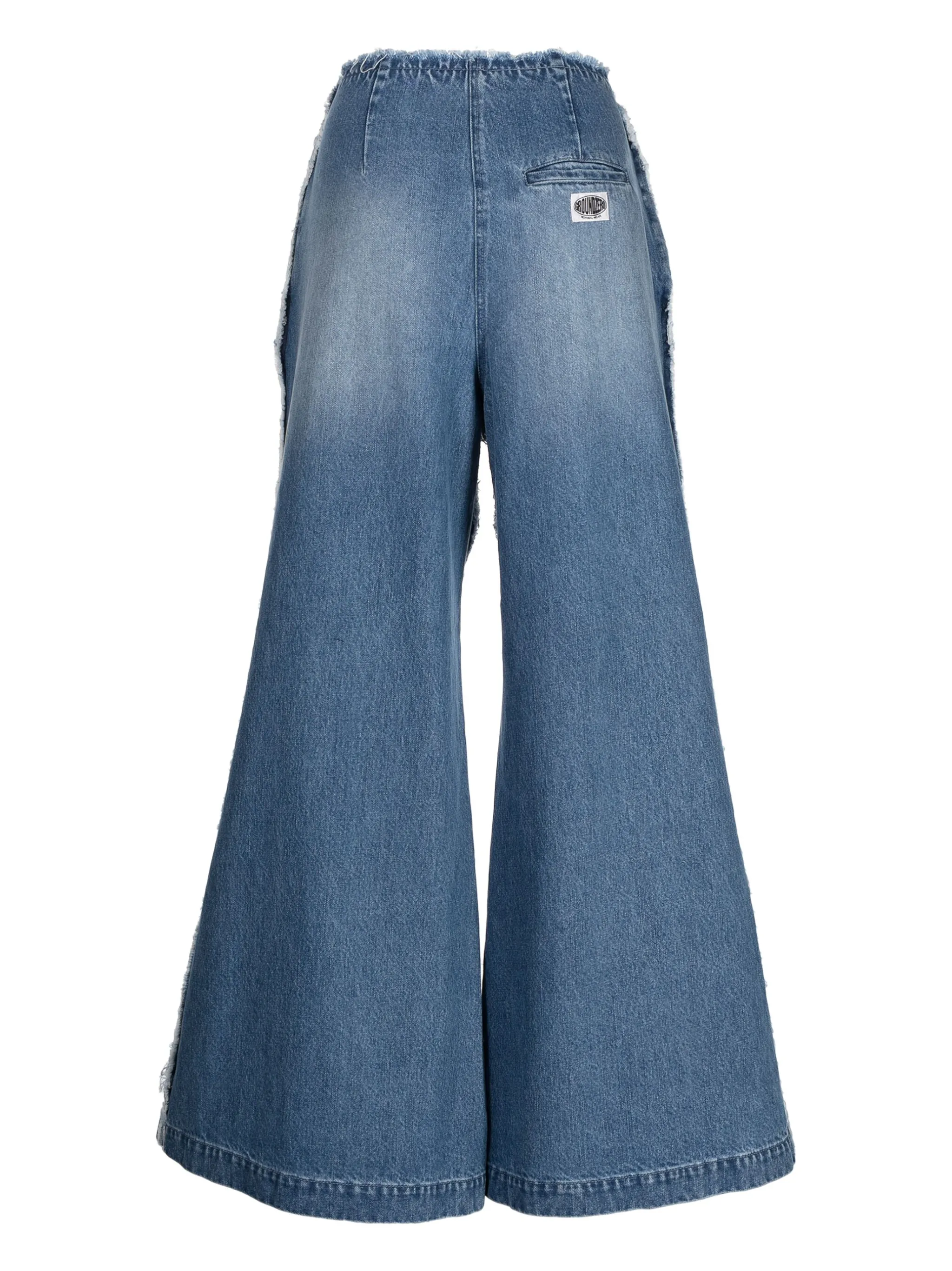 Голубой, хлопок, эффект потертости, декоративные складки, нашивка с логотипом сзади, необработанные детали, завышенная талия, расклешенный крой, широкий крой, потайная застежка спереди, задние карманы с листочкой и прямой подол.