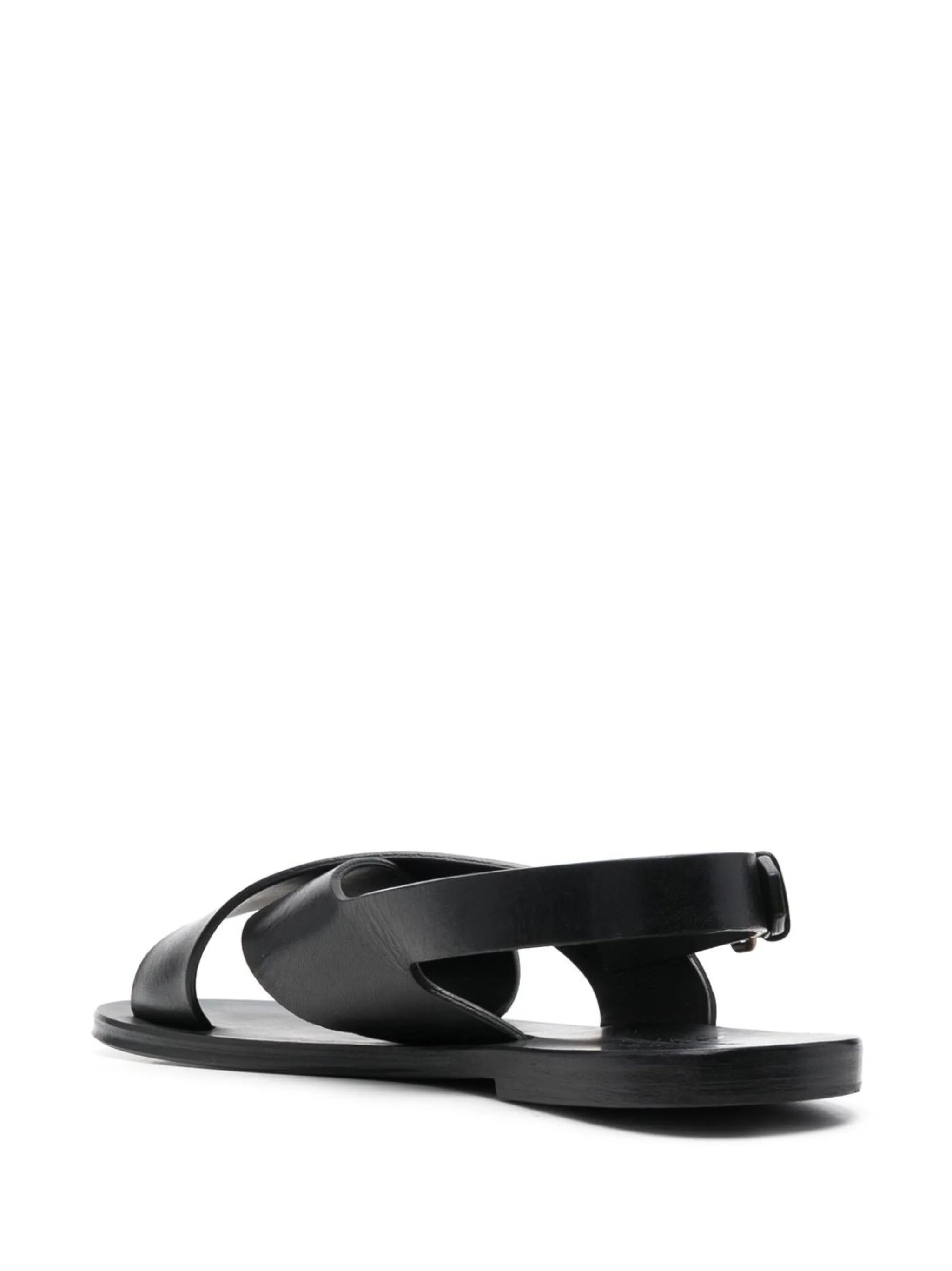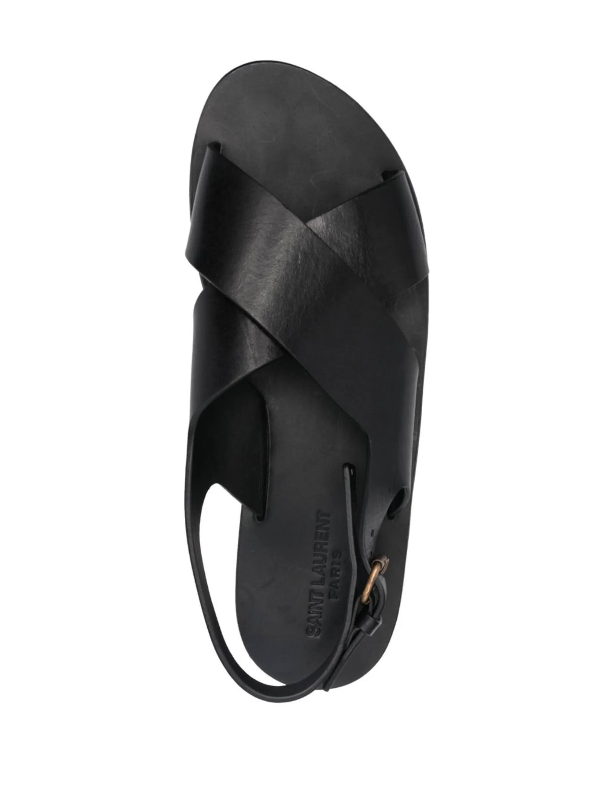 Черный, телячья кожа, перекрестные ремешки, открытый носок, боковые застежки с пряжками, стелька с логотипом и плоская кожаная подошва.