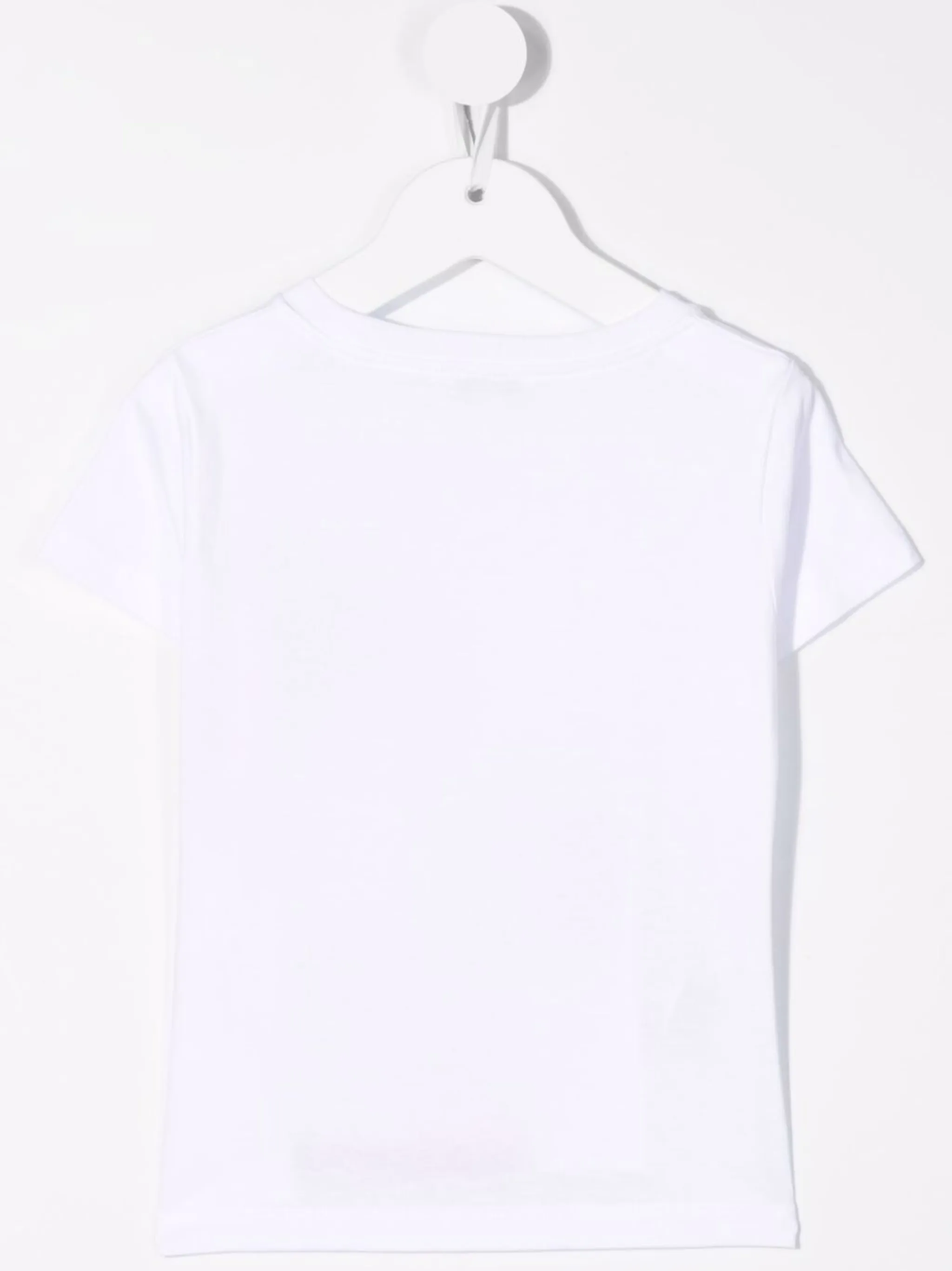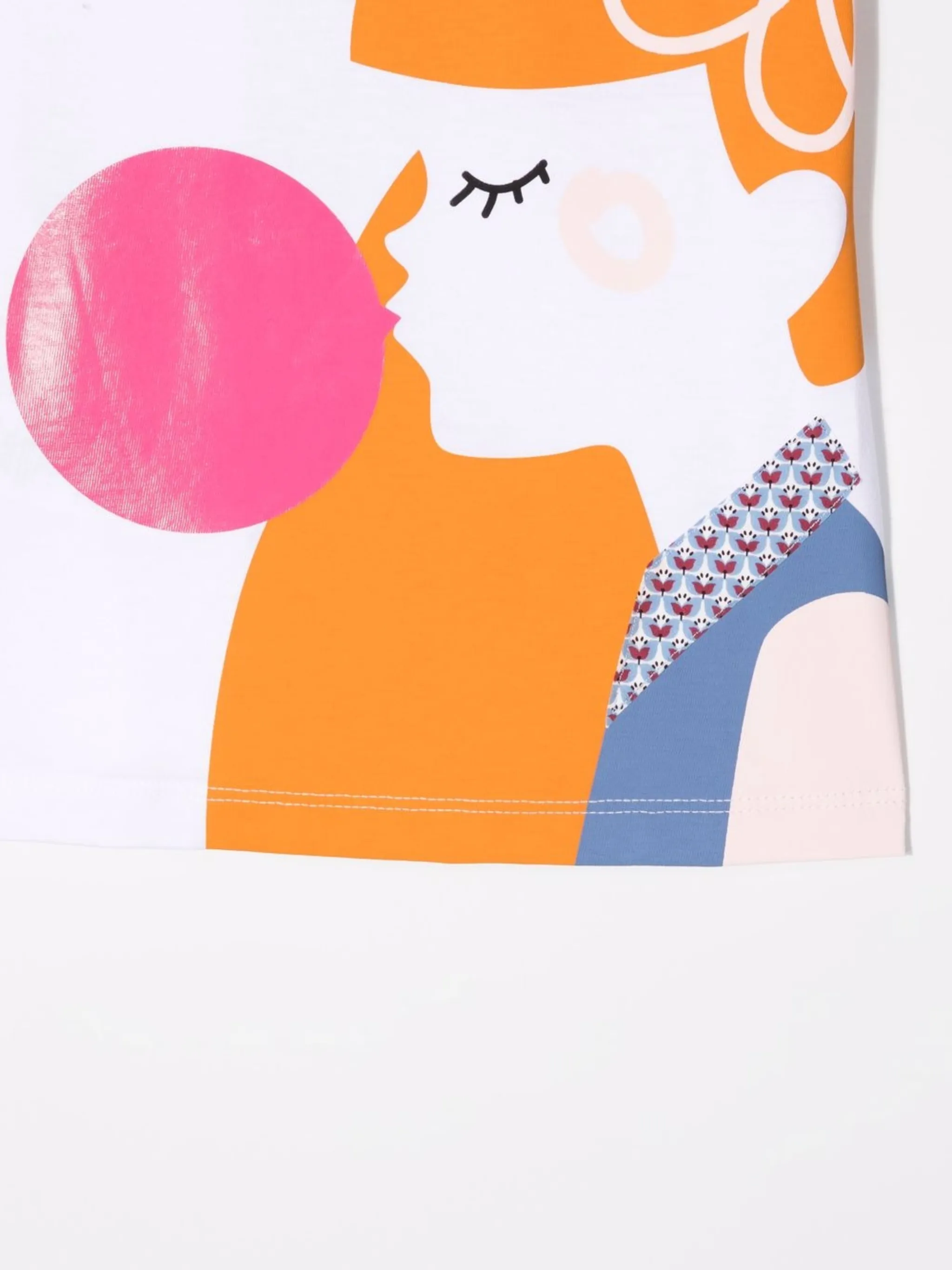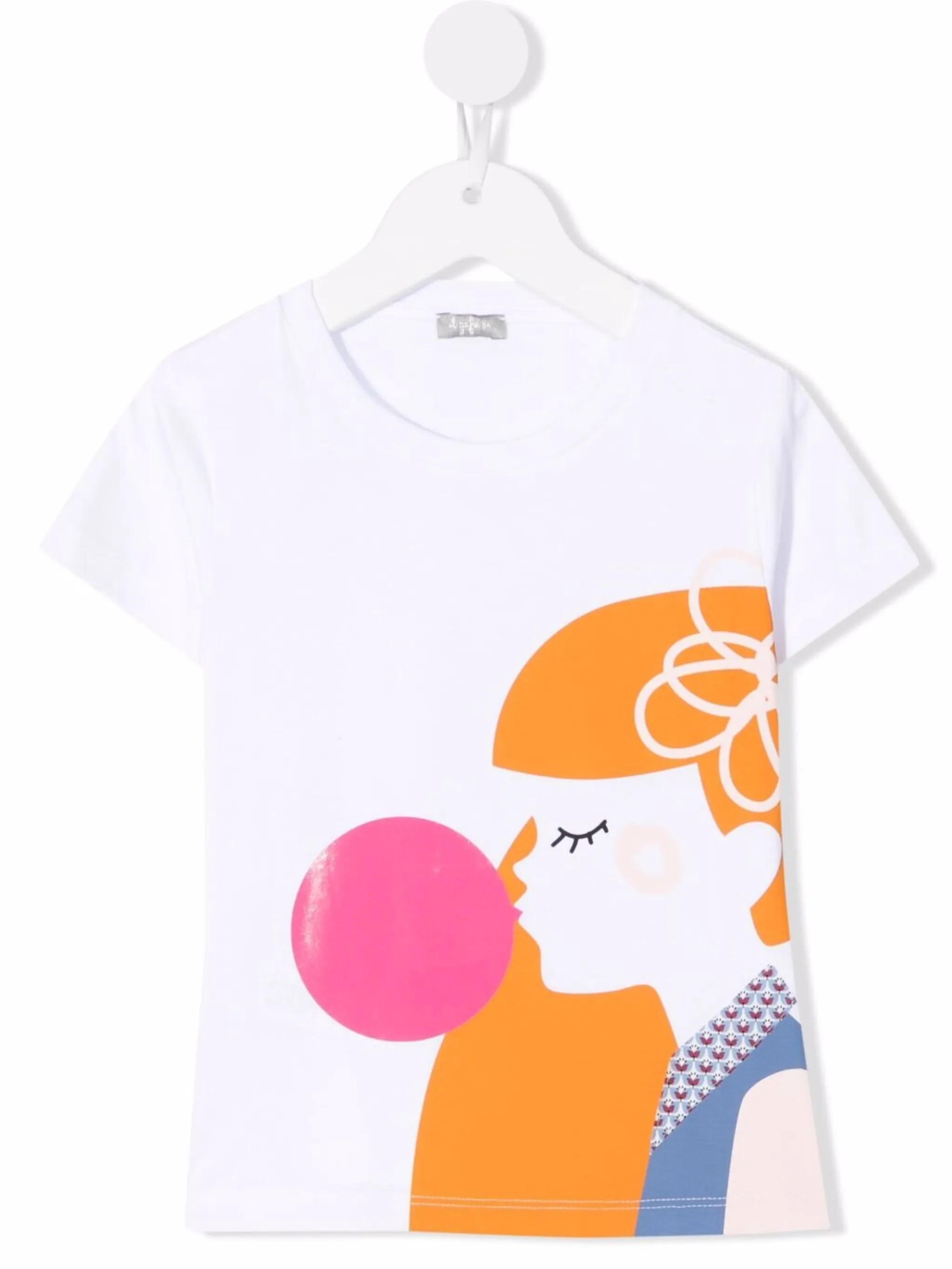 Аппликация, графичный принт спереди, круглый вырез, короткие рукава и прямой подол. Цвет: белый.