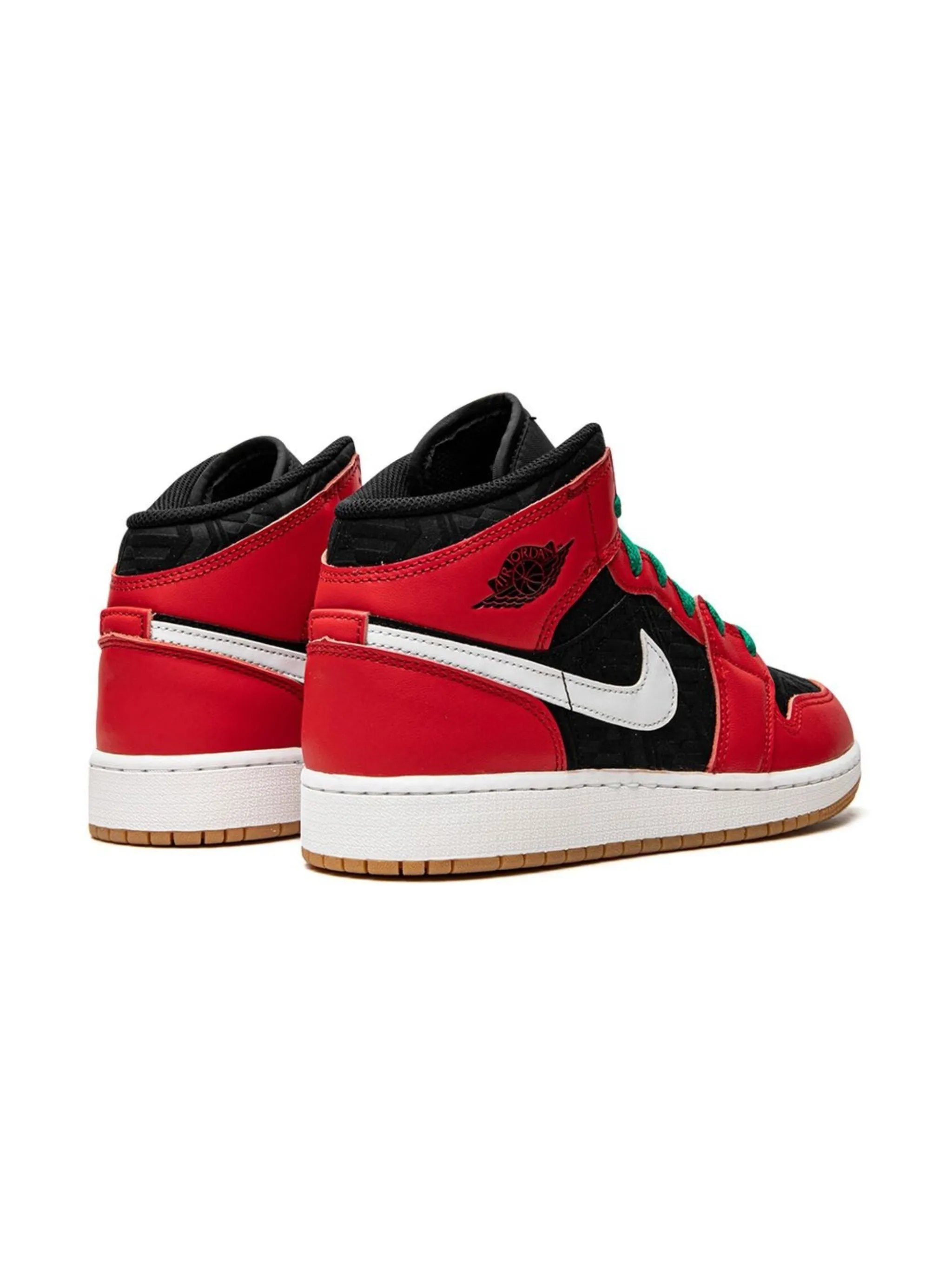 Черный, белый, красный, зеленый, кожа, логотип Nike Swoosh, логотип Air Jordan Wings, закругленный носок, шнуровка спереди, нашивка с логотипом на язычке, высота по щиколотку, стелька с логотипом и резиновая подошва.